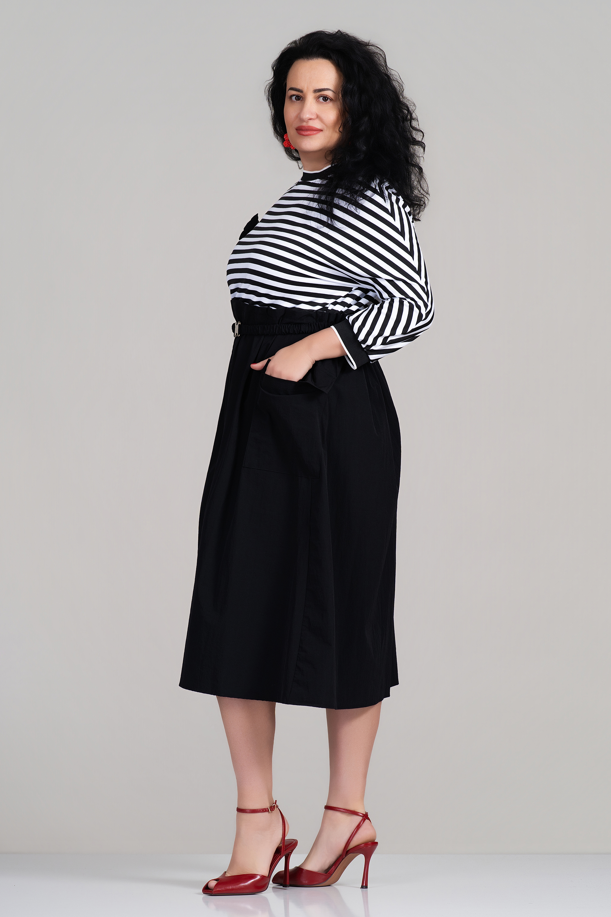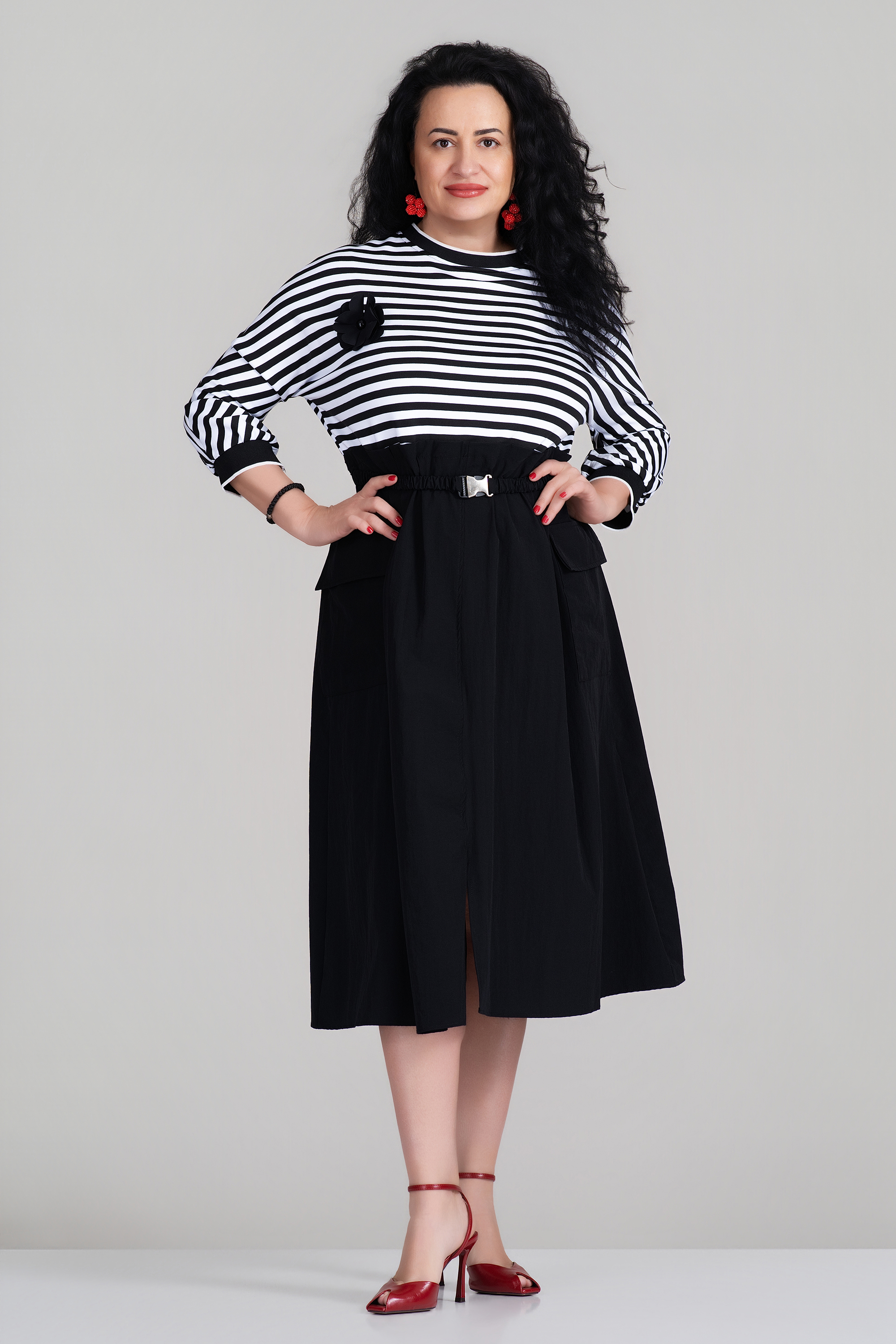 Ефектна макси рокля с издължен силует и балансирана цветова комбинация. Горната част с черно-бяло райе и обло деколте придава свеж акцент, а едноцветната долна част създава визуално стройняващ ефект. Мекото трико с високо съдържание на вискоза осигурява отлична проветривост и комфорт, а ликрата добавя необходимата еластичност за свобода на движение. Коланът подчертава талията, а практичните джобове с капак завършват визията с функционален детайл. Подходящ модел за ежедневие, пътуване или неангажиращи срещи.