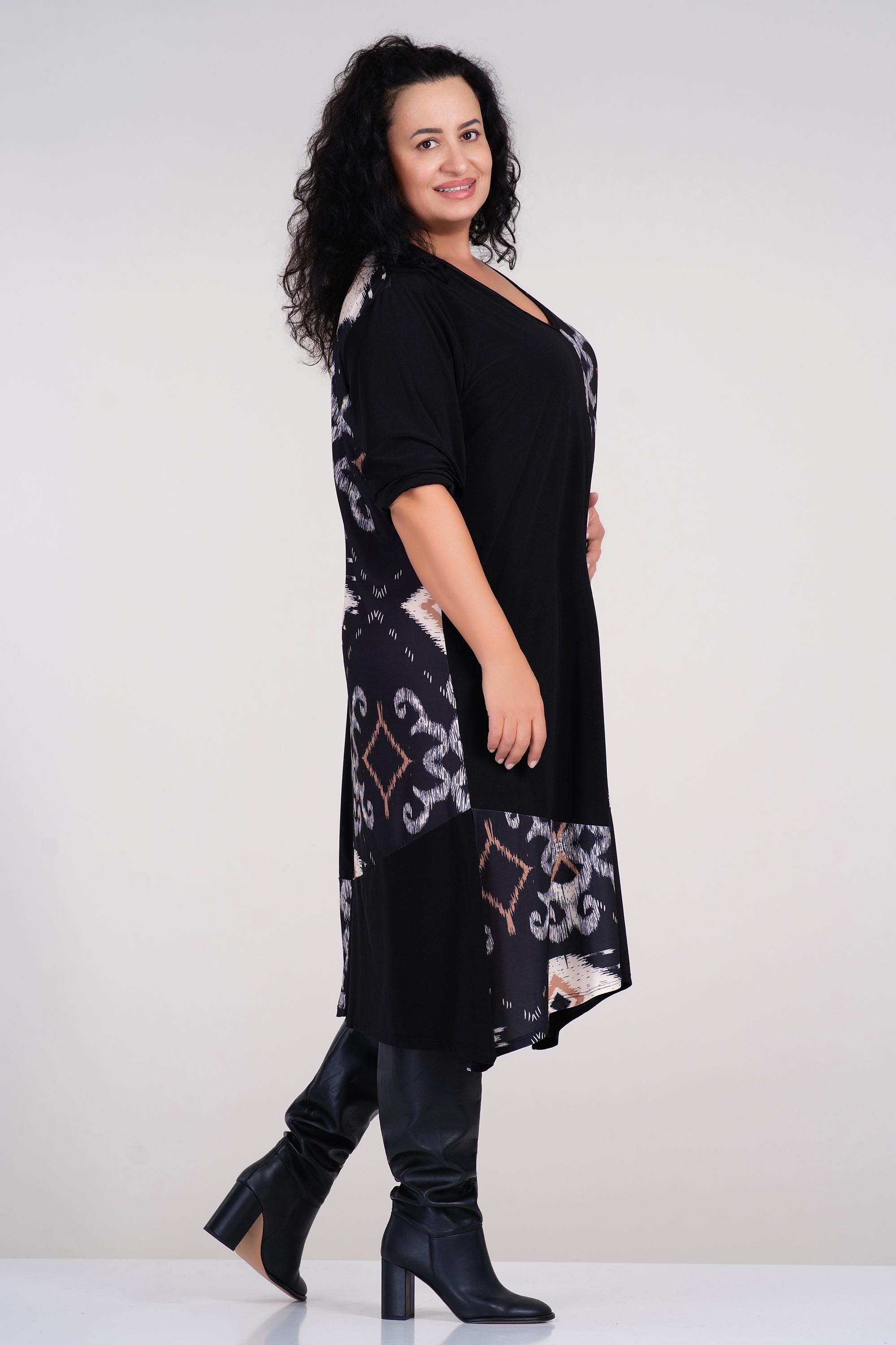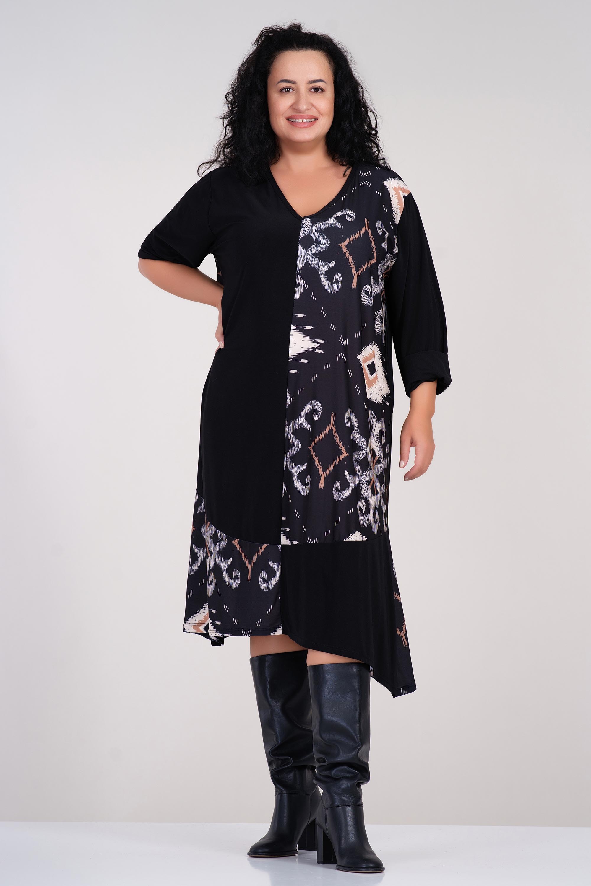 МАКСИ рокля в черно с остро деколте и геометричен принт в бежово и кафяво
