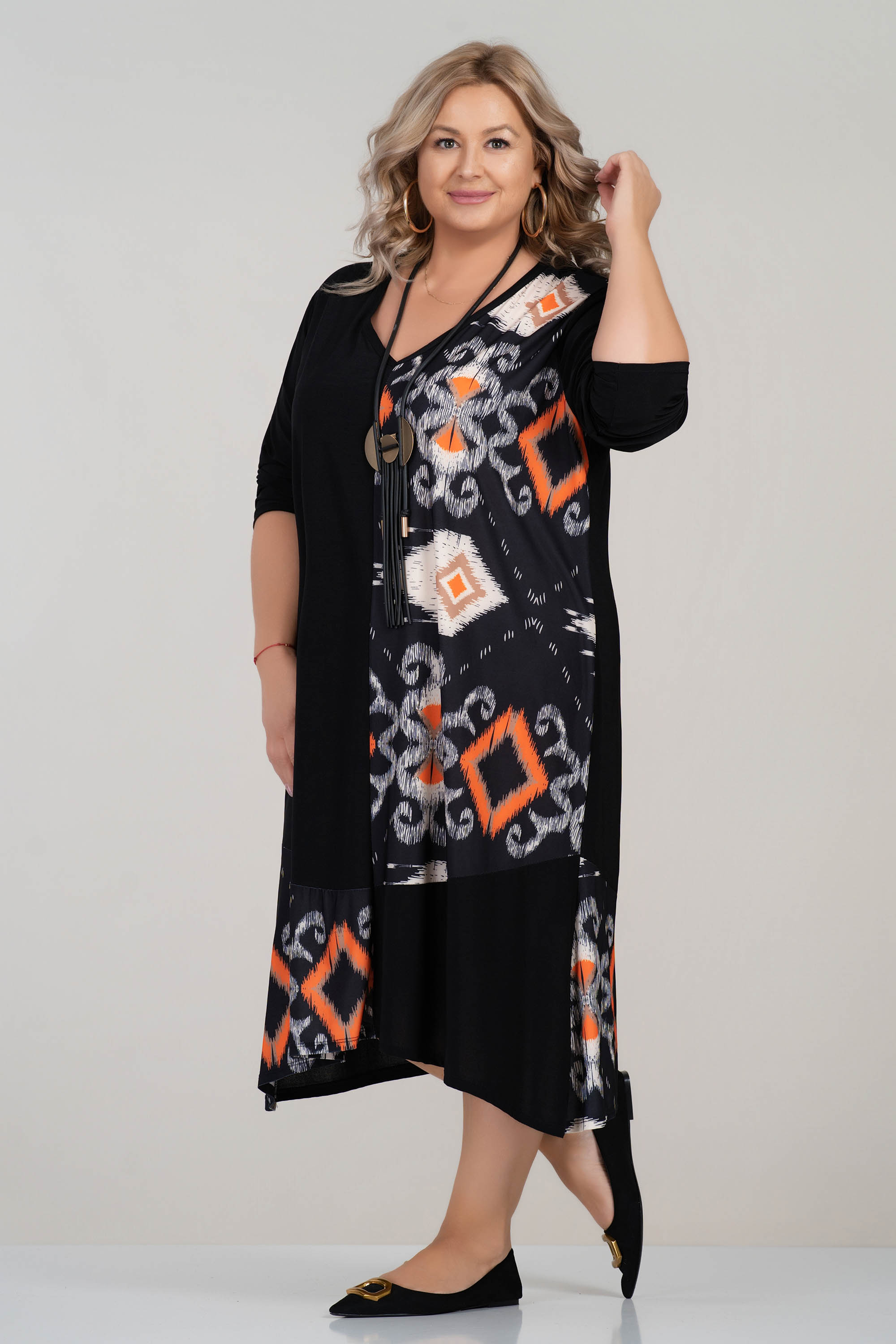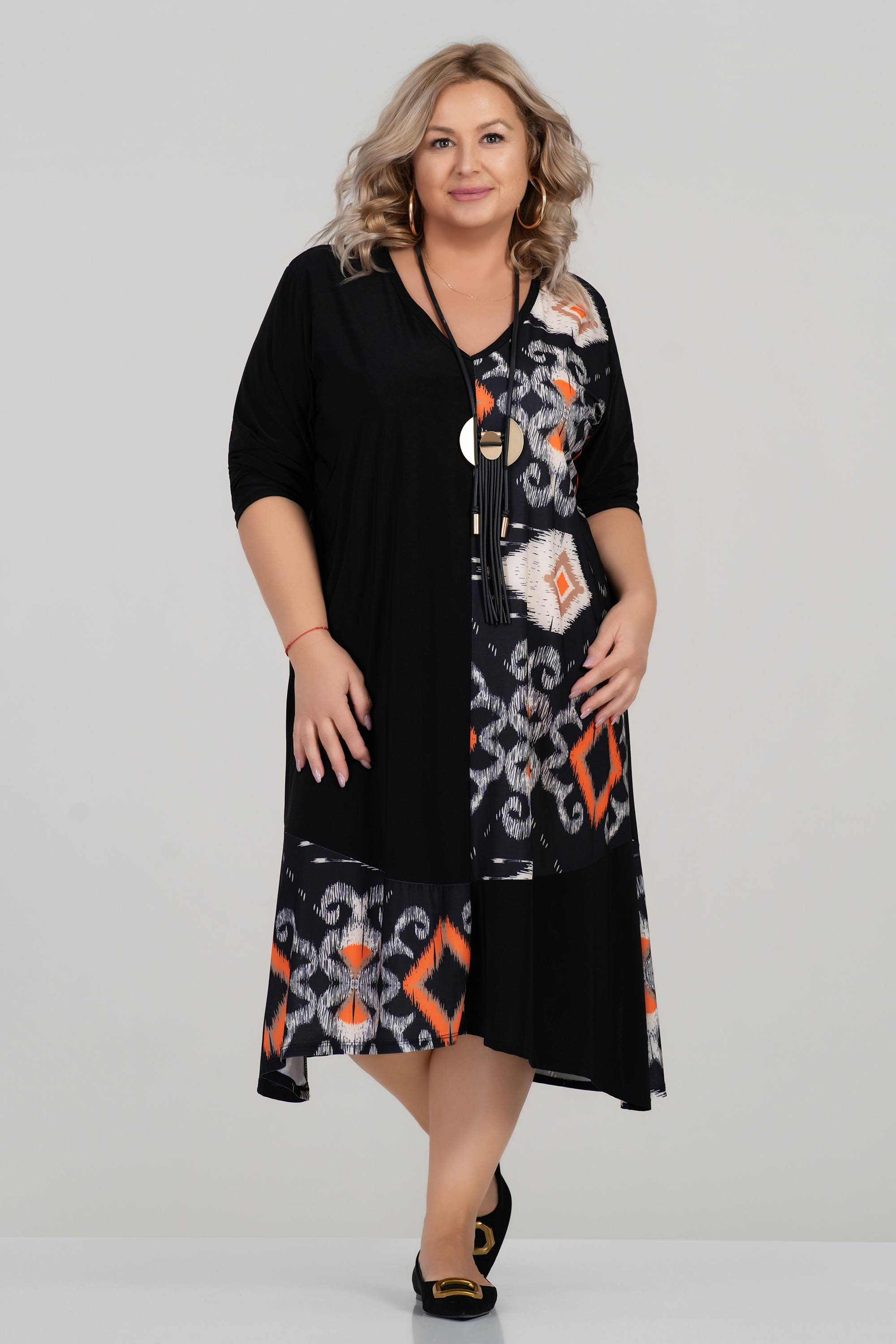МАКСИ рокля в черно с остро деколте и геометричен принт в бежово и оранжево