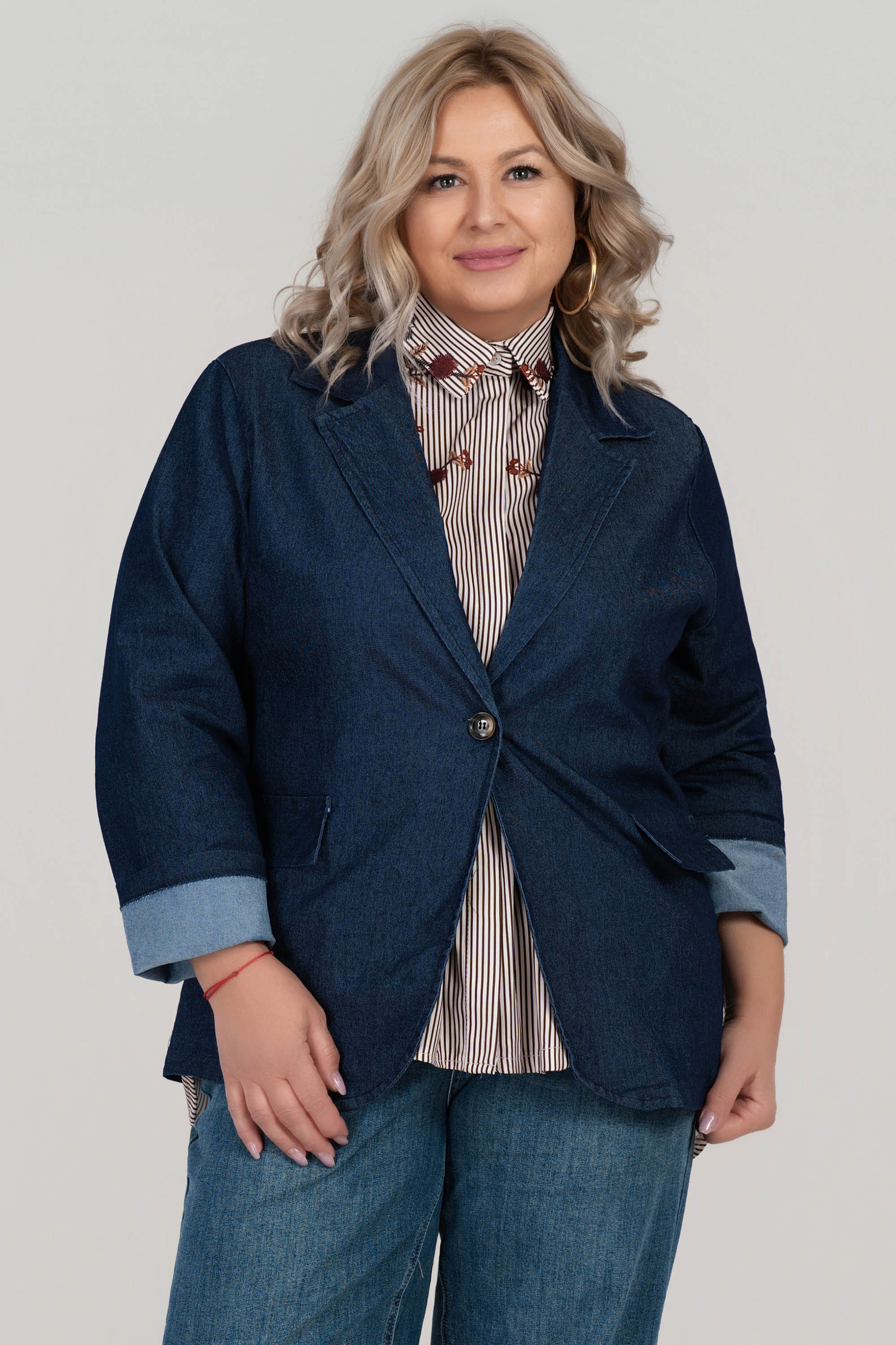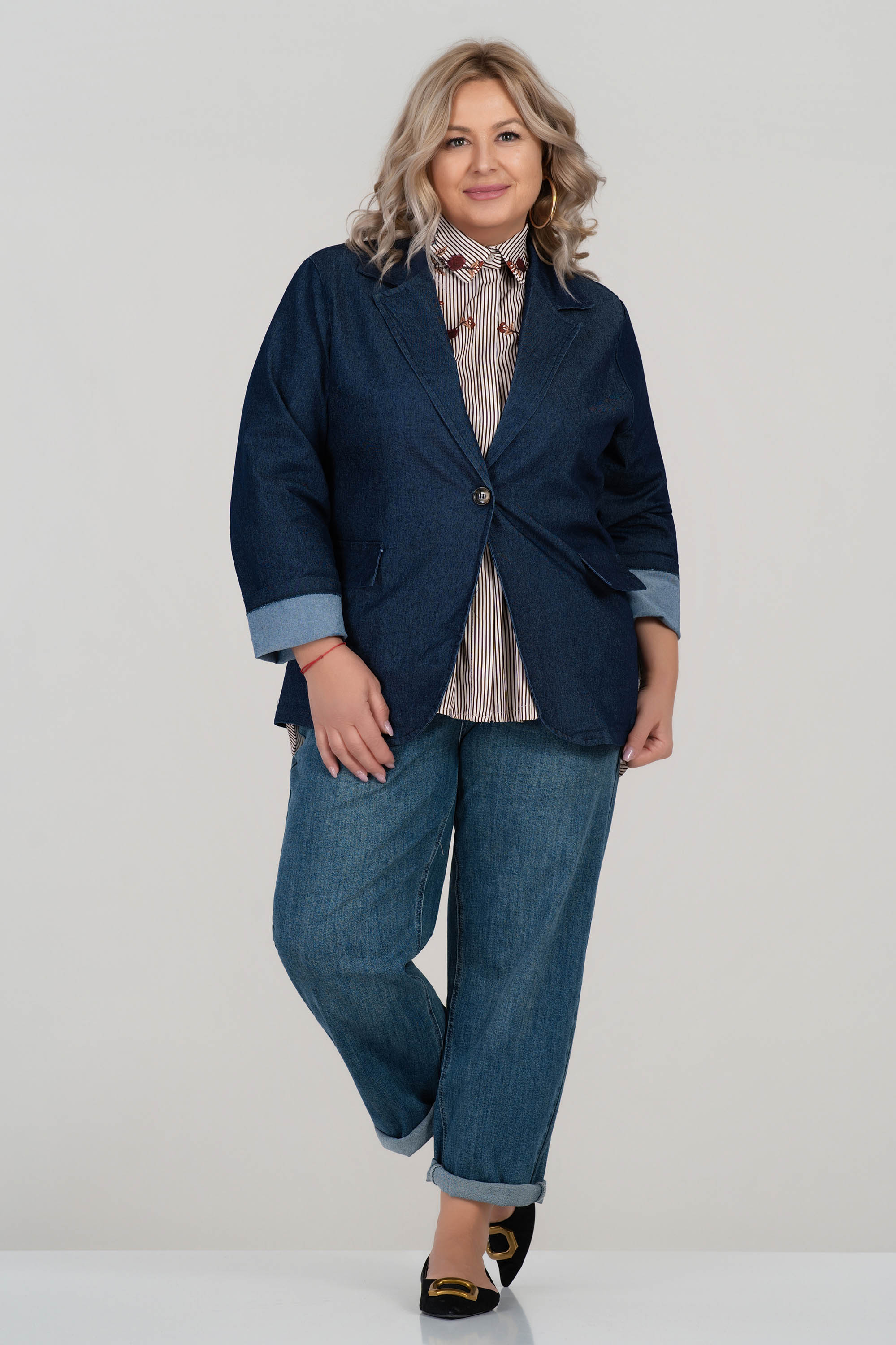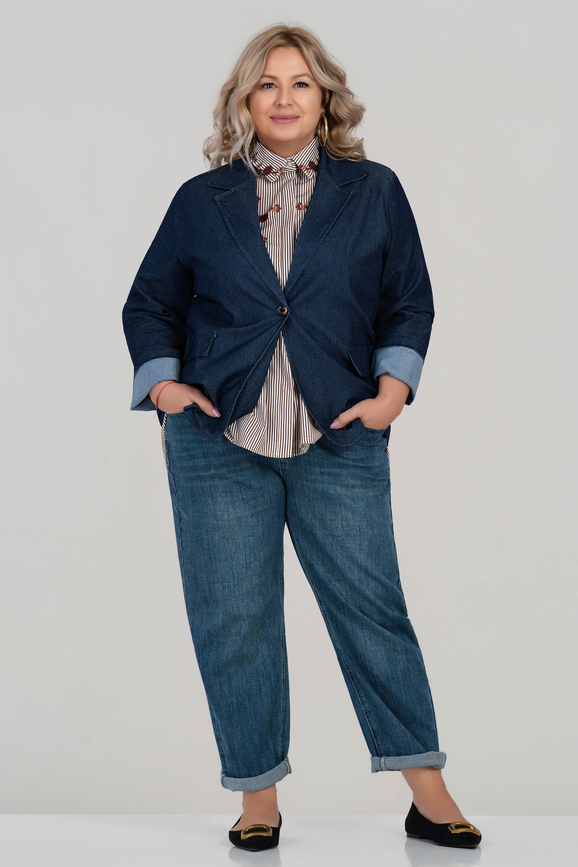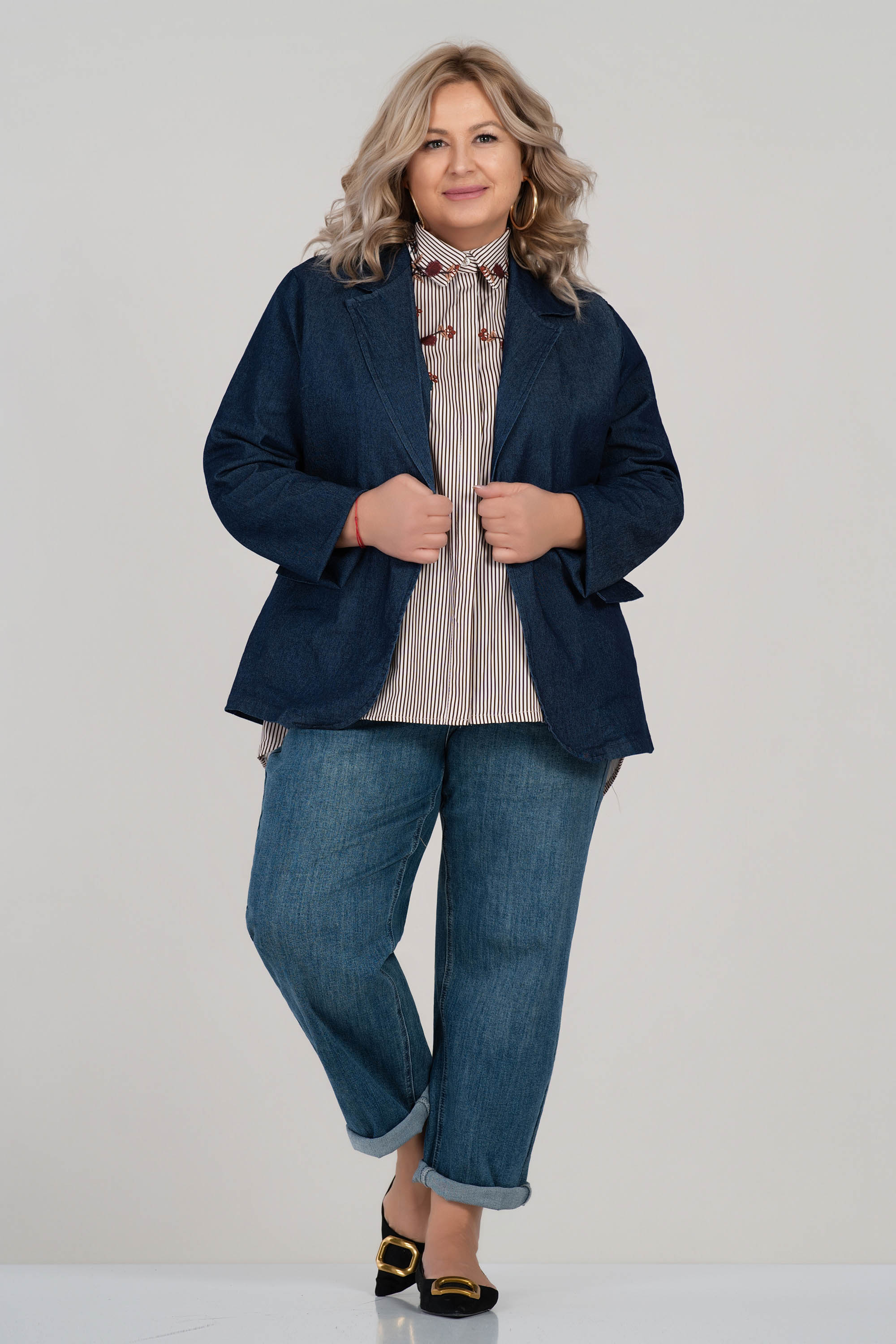 Това макси сако от мек деним е създадено с мисъл за стил и удобство. Свободната кройка с ревери и едноредово закопчаване осигурява лекота на движението и елегантно излъчване. Декоративните капаци и обърнатите ръкави добавят модерен акцент. Подходящо за ежедневието и офиса в преходните сезони.
