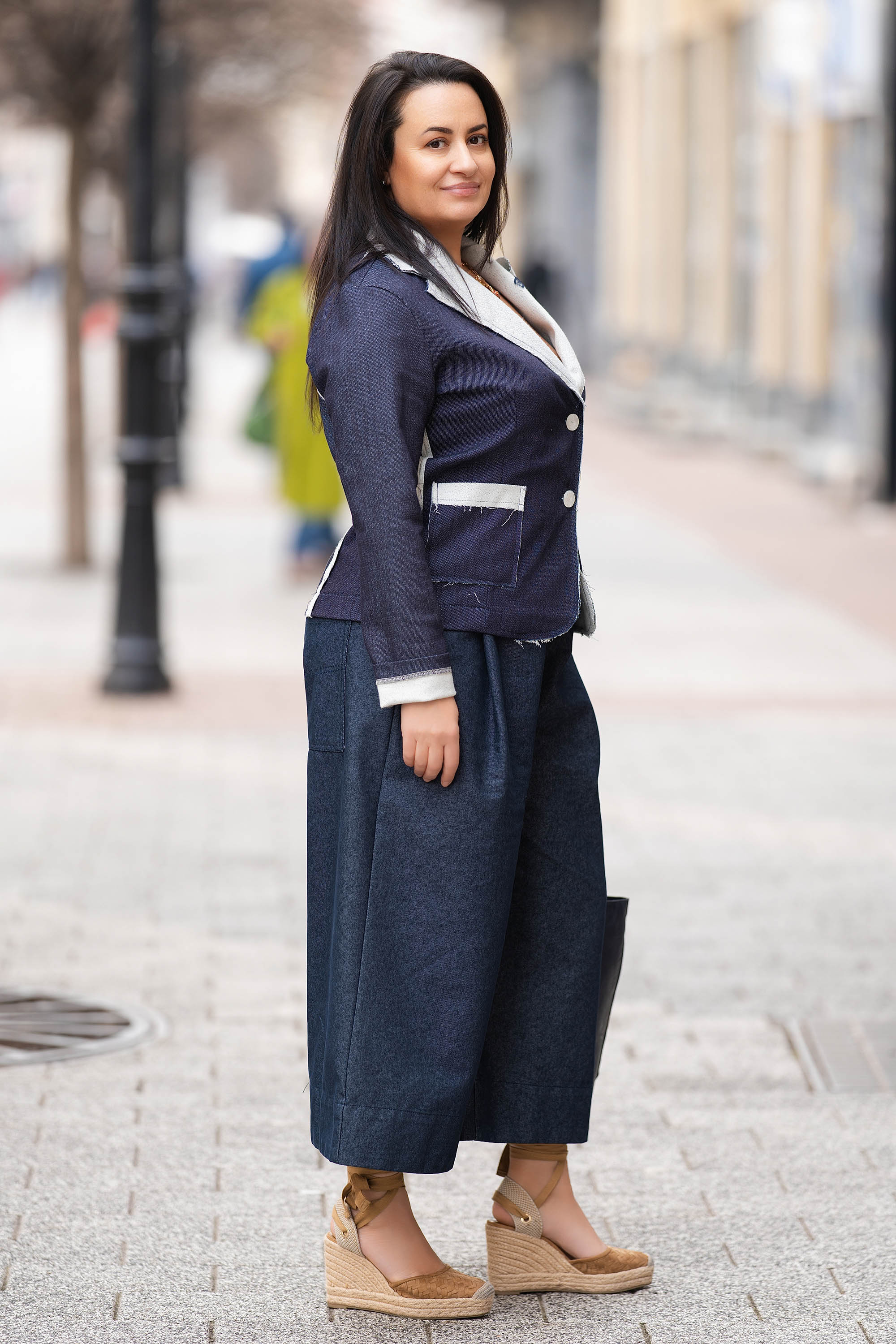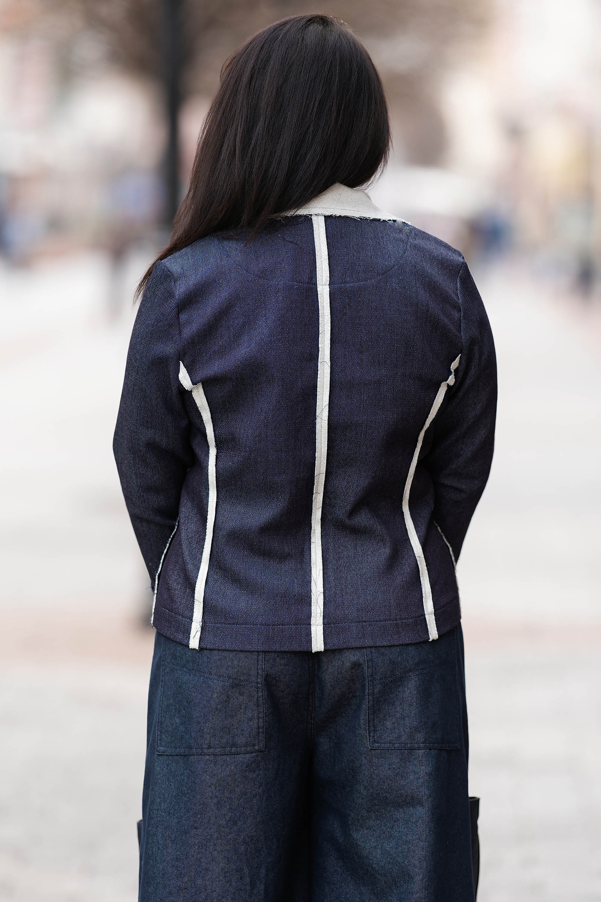 Стилно сако, изработено от плътен памук с ефект „имитация на деним“ и накъсани ръбове за модерна визия. Контрастните ревер и джобове създават елегантен акцент, докато класическата кройка с две копчета осигурява комфорт и свобода на движение. Подходящо за преходните сезони и ежедневна градска елегантност.