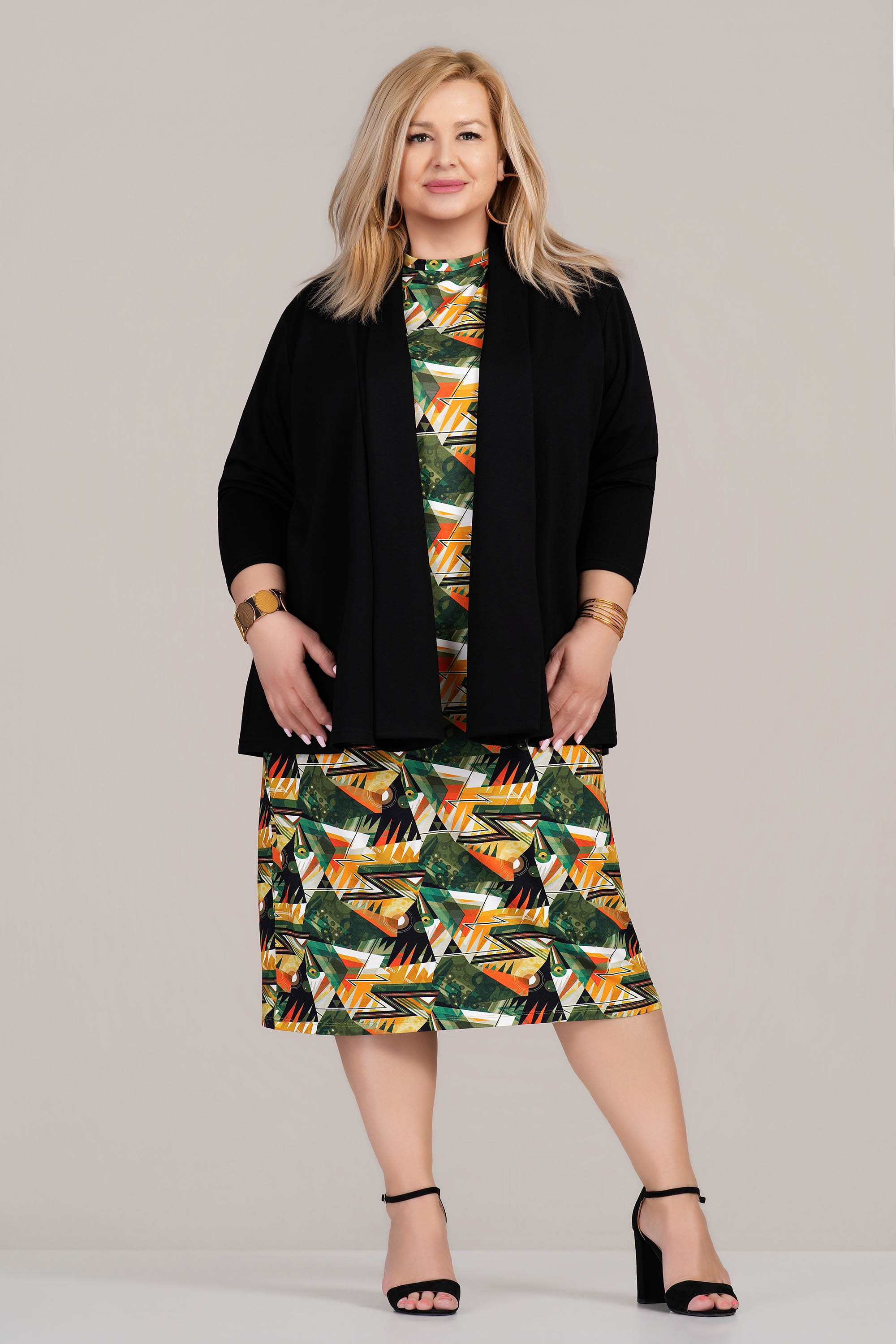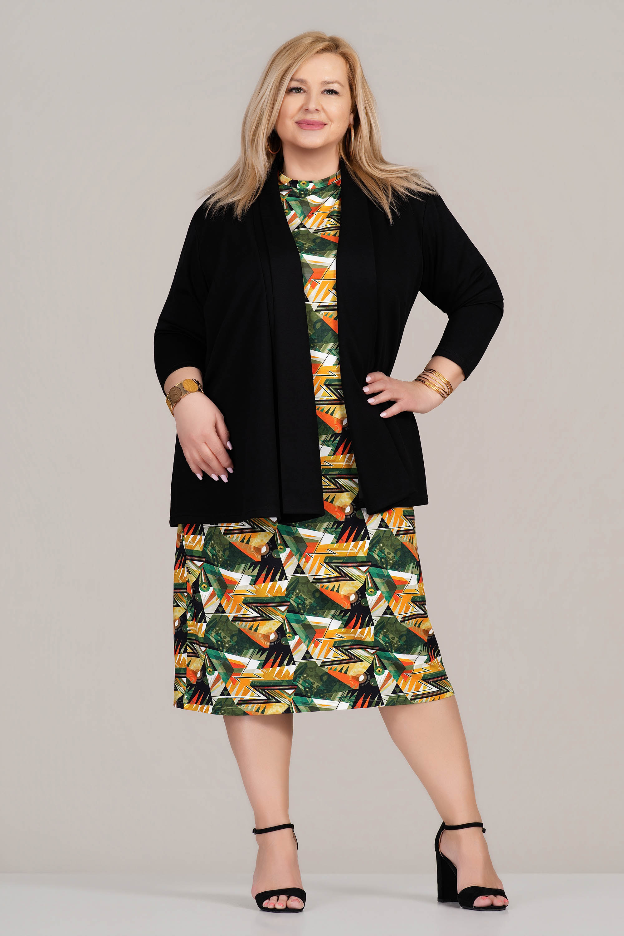 Елегантен модел от макси линията, създаден да подчертае формите с увереност и стил. Комбинацията от вискоза и еластан придава мекота, добра проветривост и приятно усещане при носене, а структурата на плата гарантира стабилност и устойчивост във времето. Свободният силует пада плавно по тялото, без да очертава излишно, а черният цвят добавя класическо и универсално излъчване. Подходящ избор за офис среда, официални срещи или стилна ежедневна визия.
