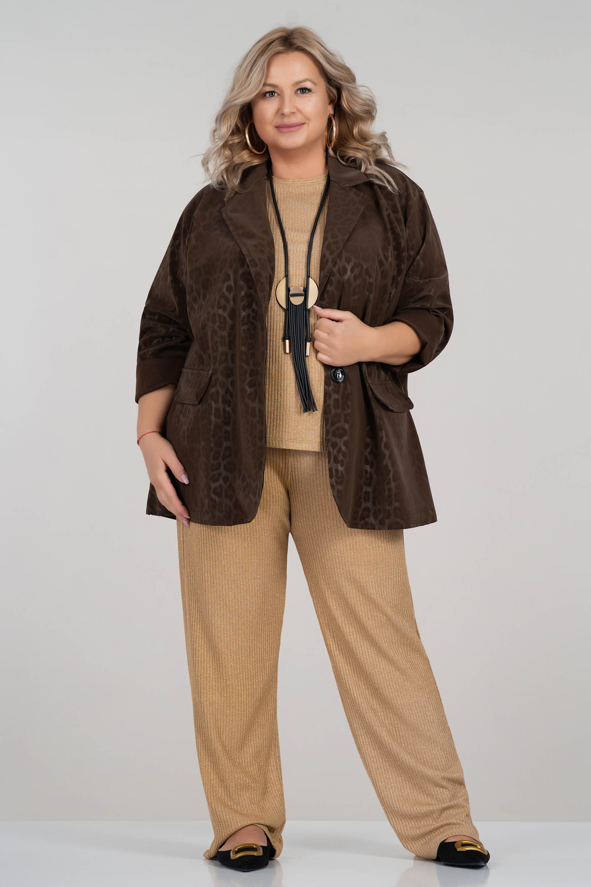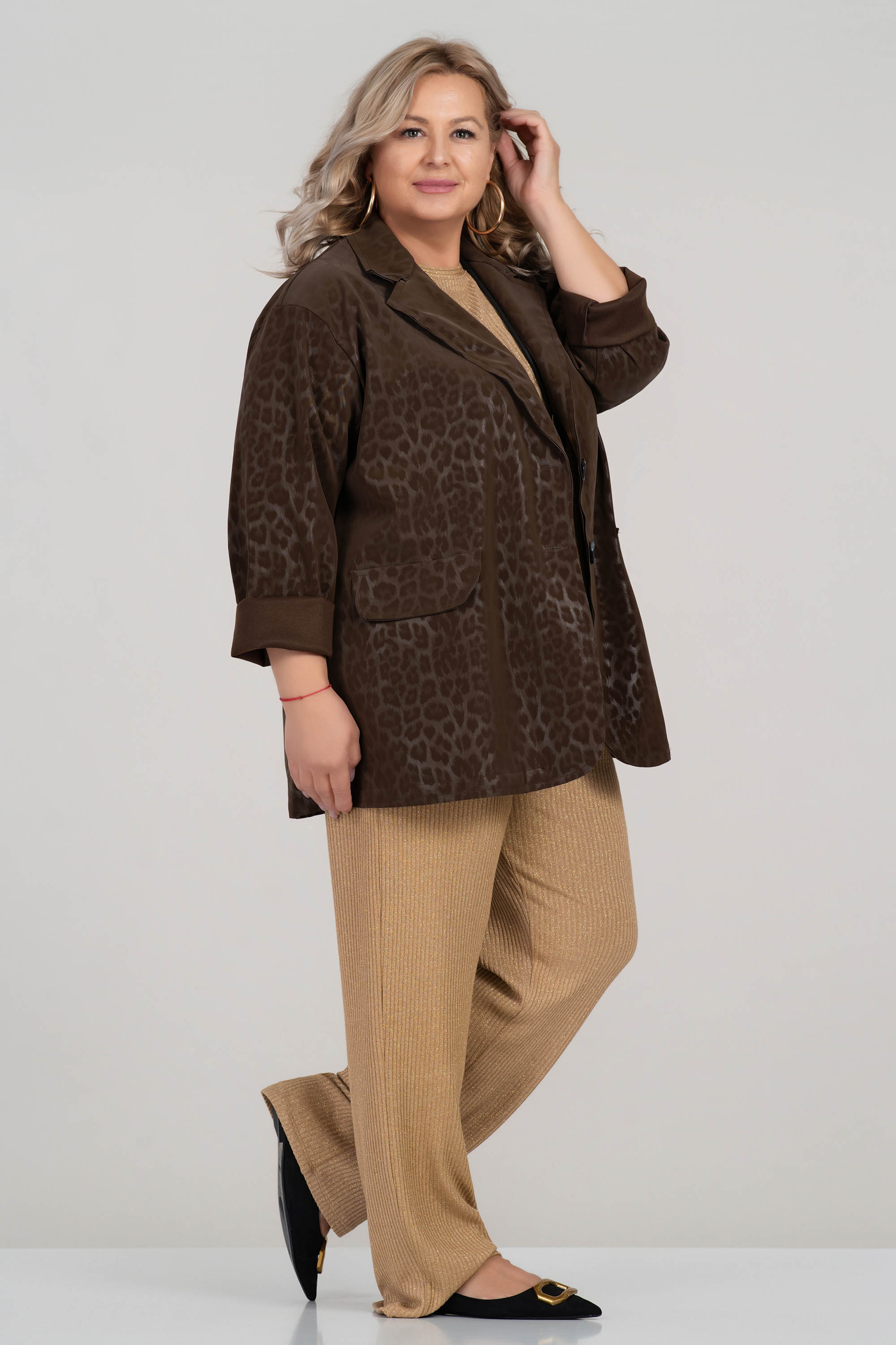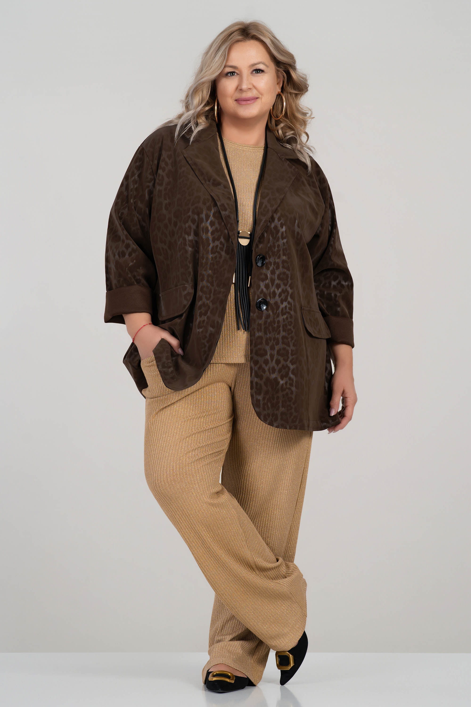 Елегантно макси сако в топъл кафяв нюанс с деликатен леопардов принт. Изработено е от мека вискозна материя с лек блясък, която пада красиво по тялото. Моделът е с класическа яка, две предни копчета и функционални джобове с капаци. Осигурява комфорт и стил, подходящо както за ежедневни, така и за по-официални визии.