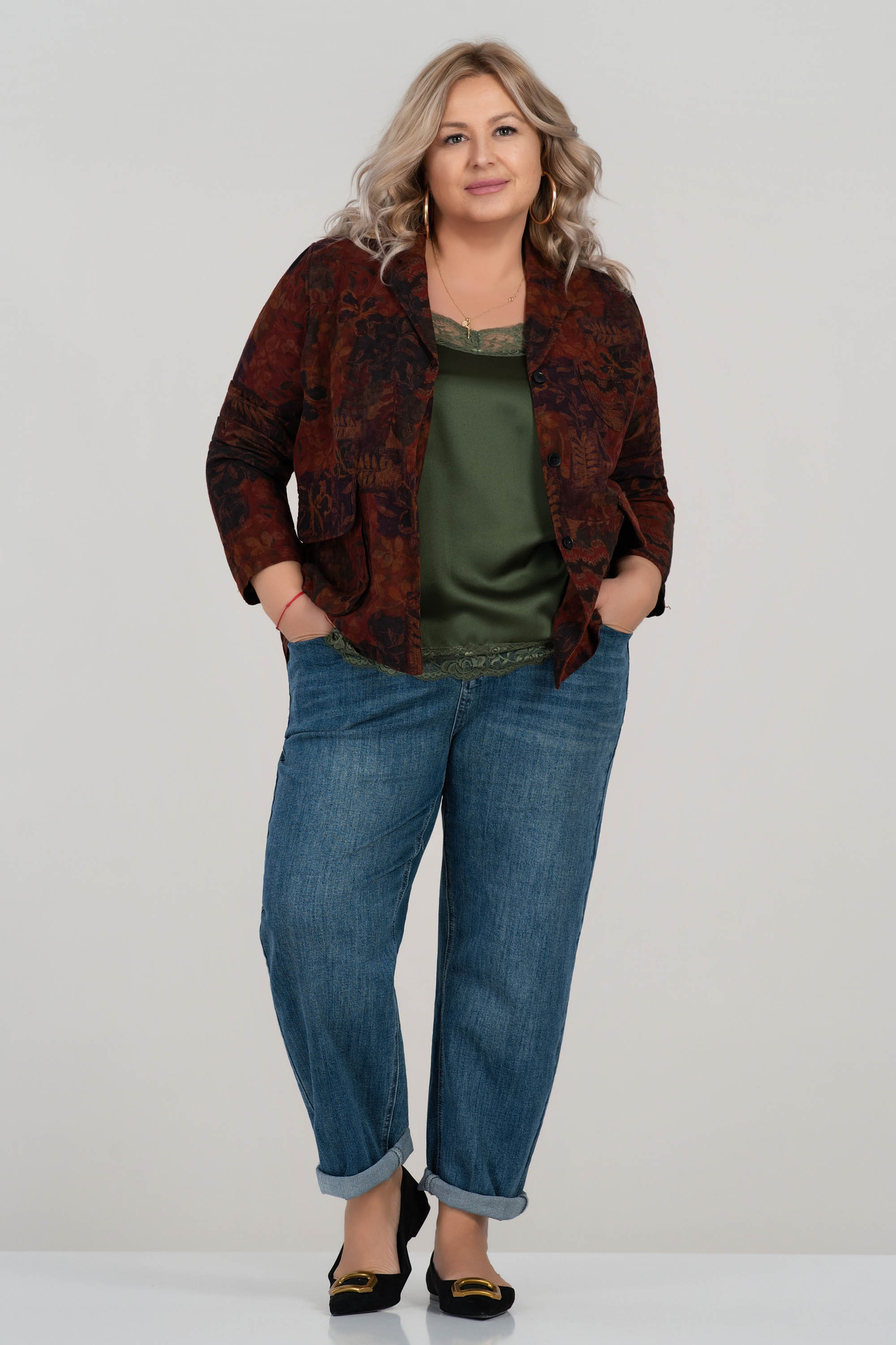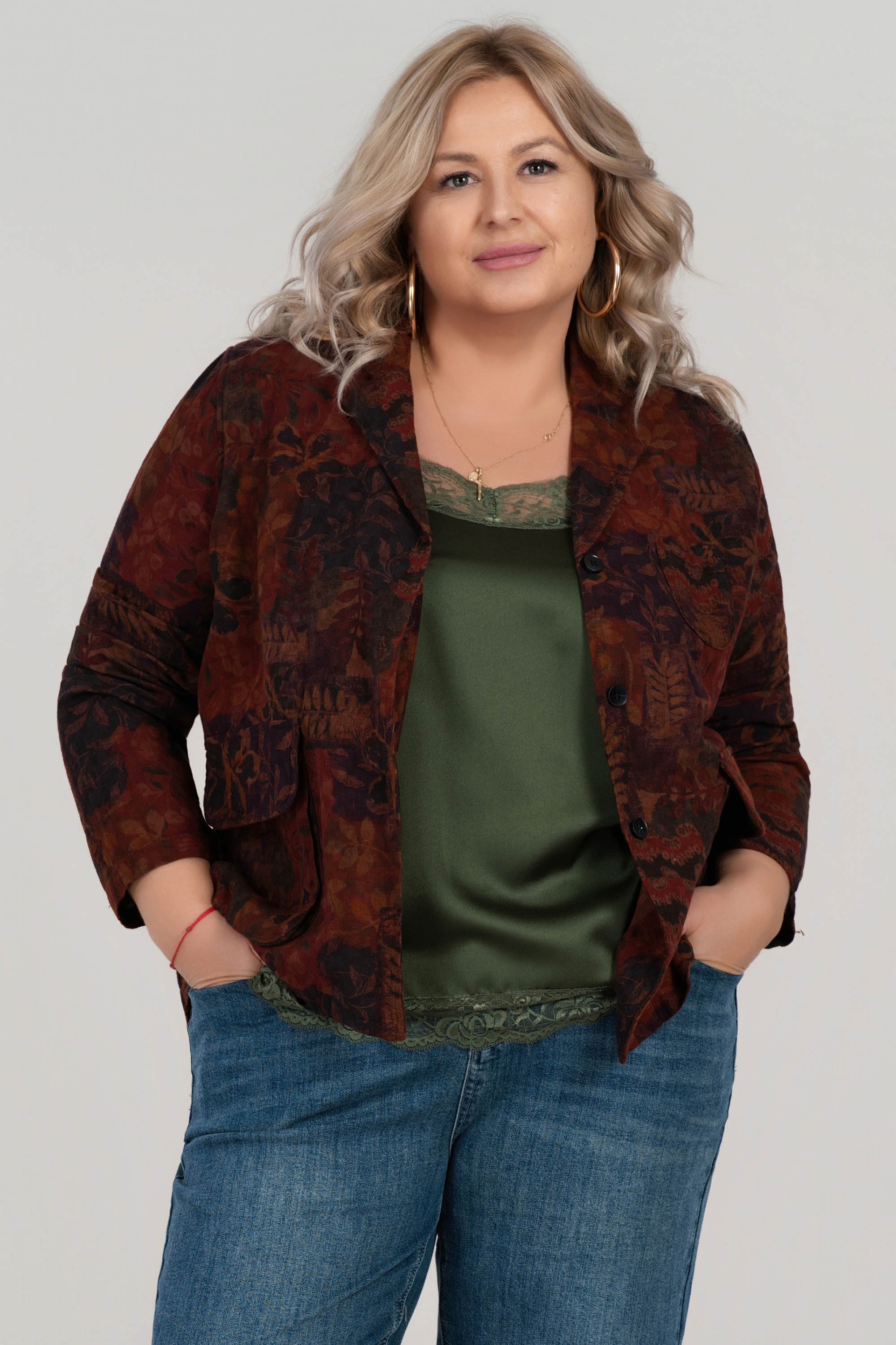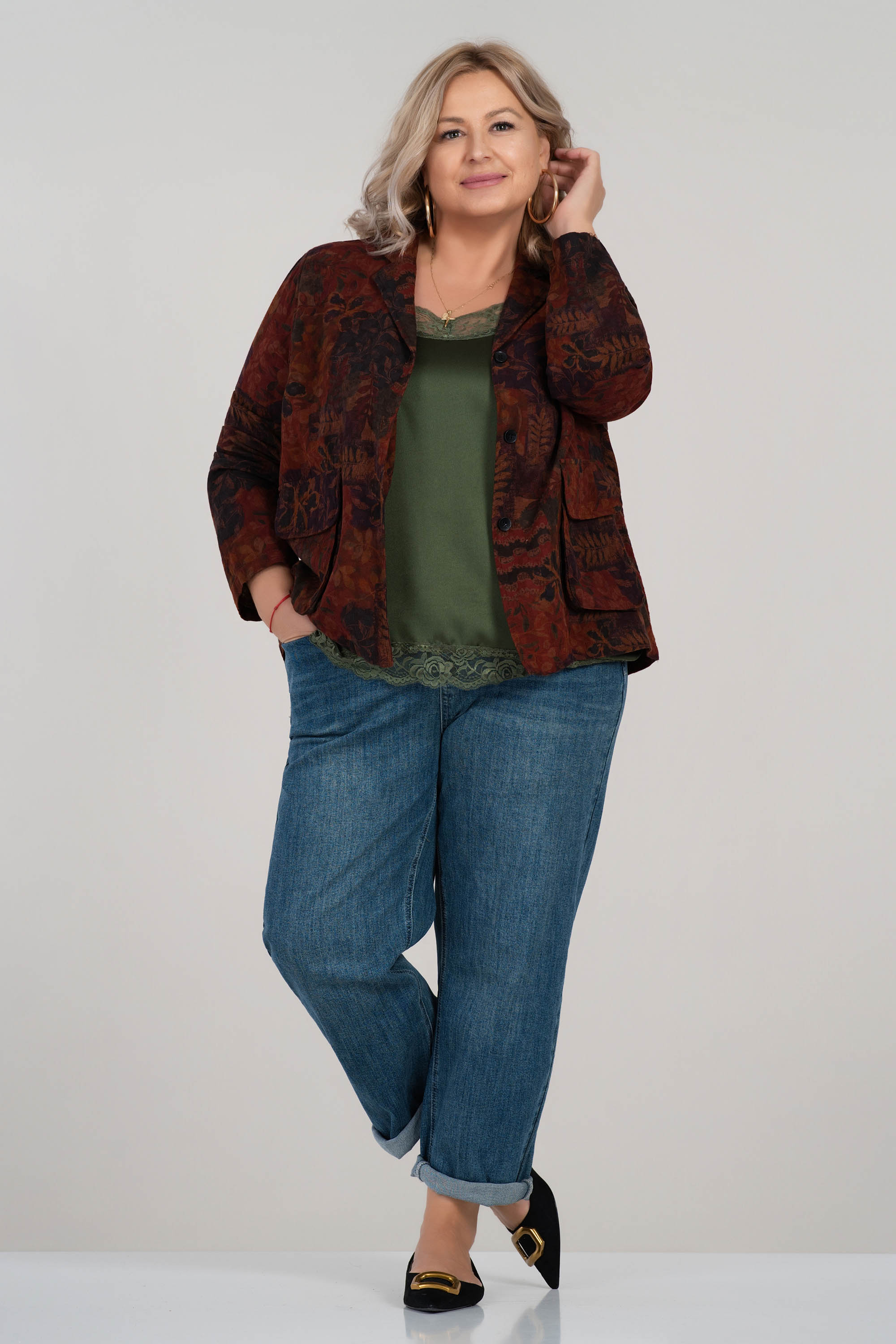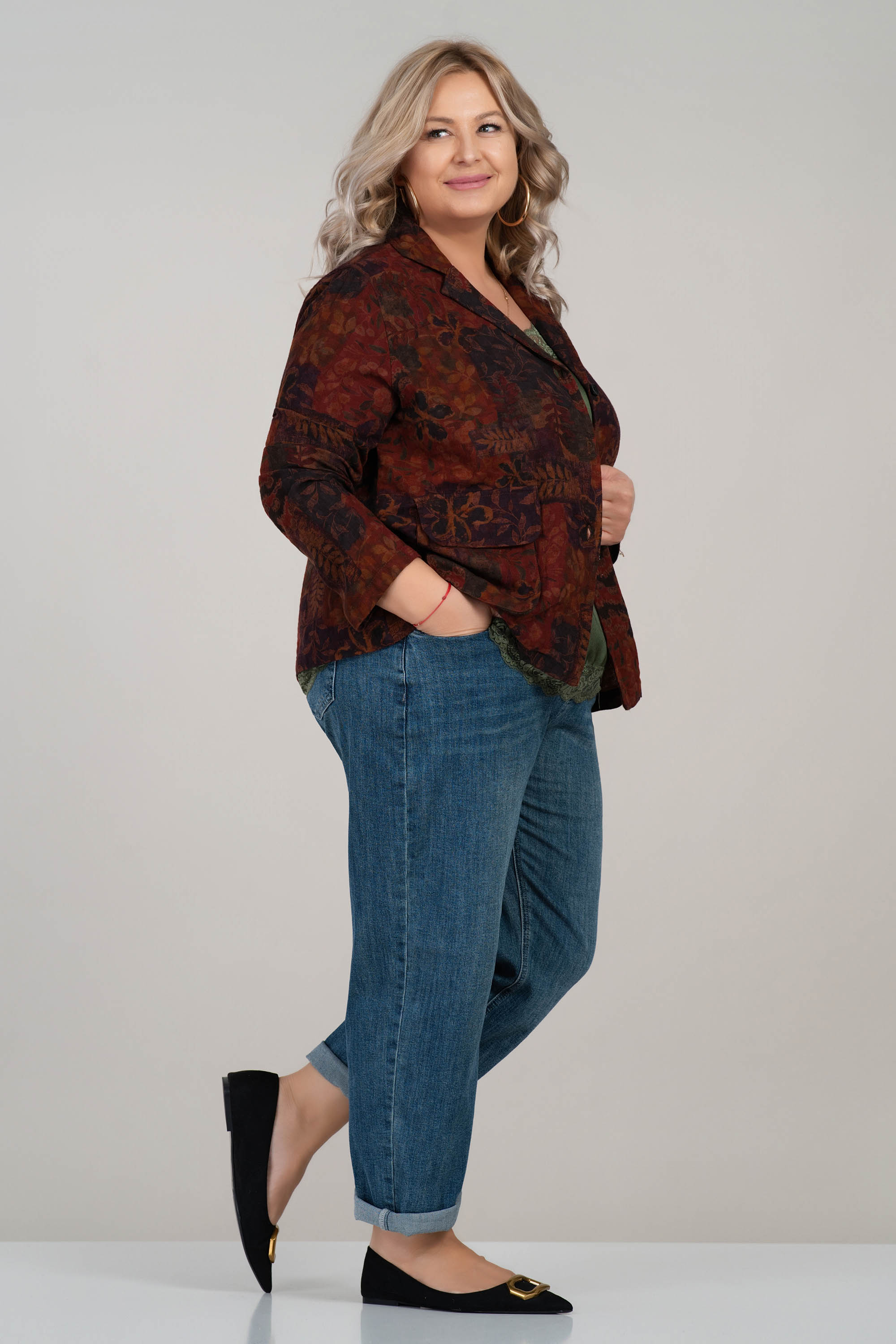 Това макси сако впечатлява с артистичен принт от листа в топли есенни тонове. Свободната кройка и памучната материя осигуряват комфорт, докато детайлите като джобове с капак и яка придават класическа завършеност. Подходящо за преходните сезони и отлично допълнение към едноцветни визии.