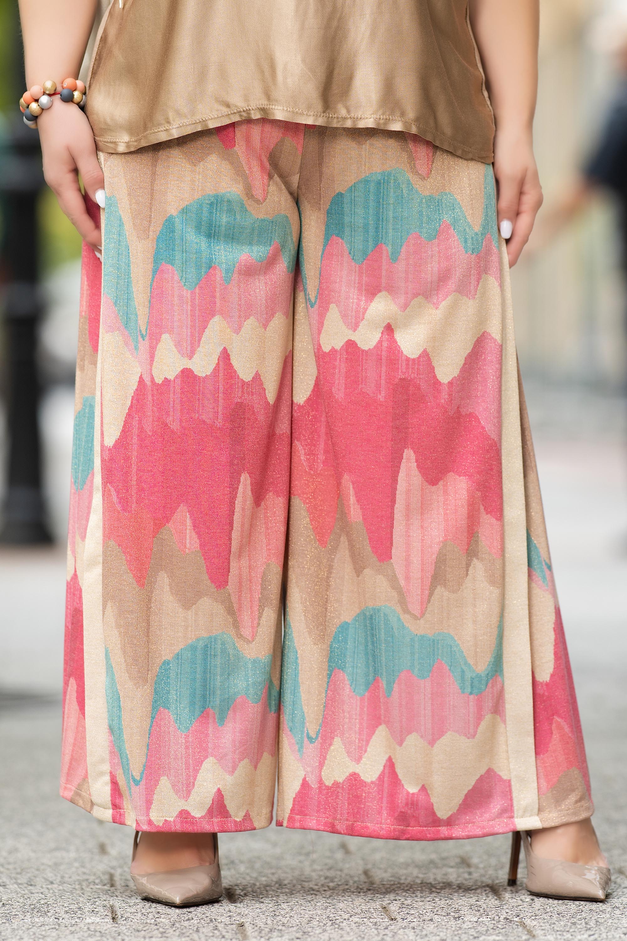 Макси широк панталон с ластик в талията и акварелен принт в розово, синьо и бежово