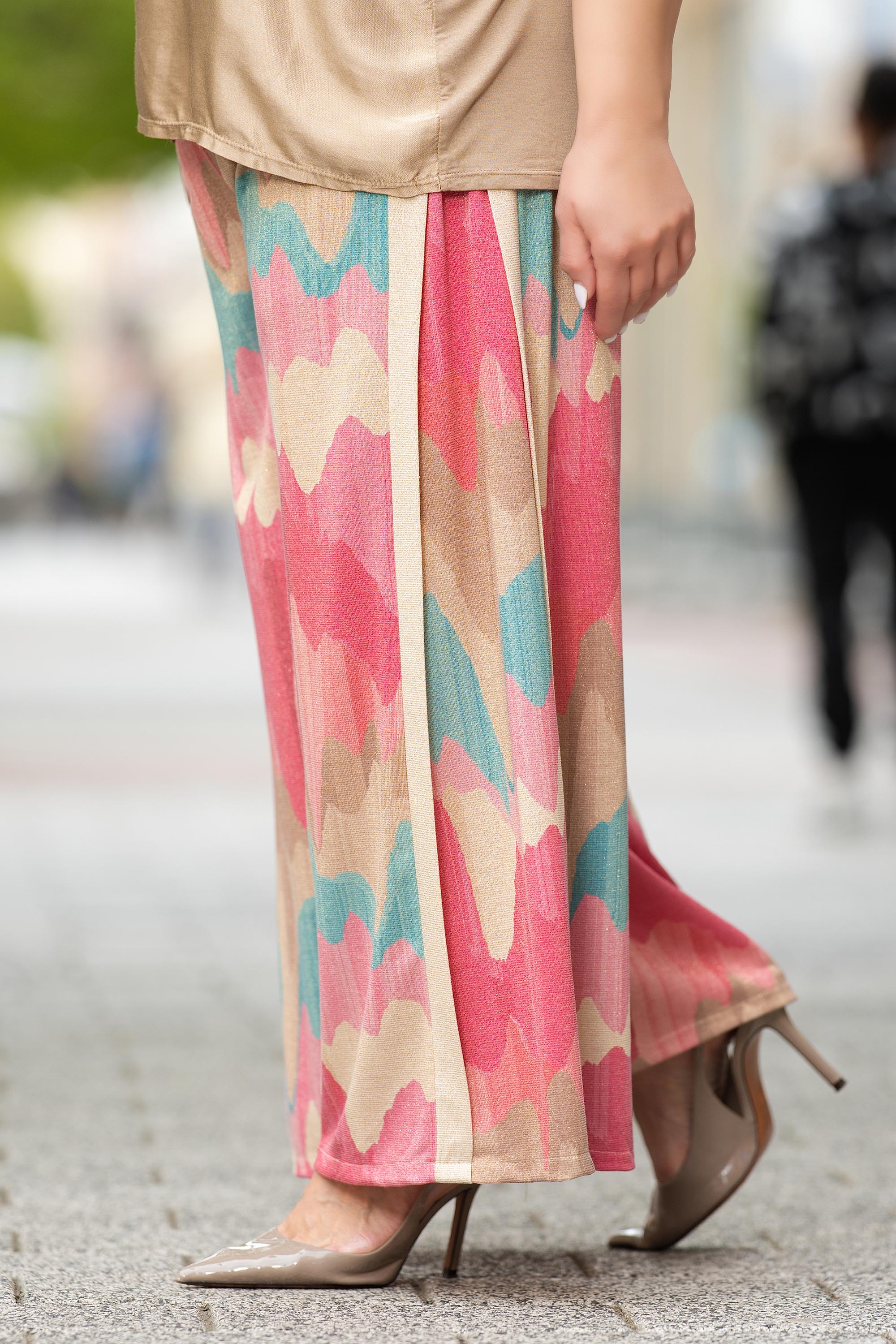 Този макси панталон впечатлява с красива визия и отличен комфорт при носене. Материята с високо съдържание на вискоза осигурява мекота и лекота, а добавената еластичност гарантира свобода на движение. Цветният акварелен принт в нюанси на синьо, розово и бежово създава свежо и модерно излъчване, допълнено от деликатна нишка ламе за фин блясък. Ластикът в талията осигурява удобно прилягане и практичност в ежедневието.
