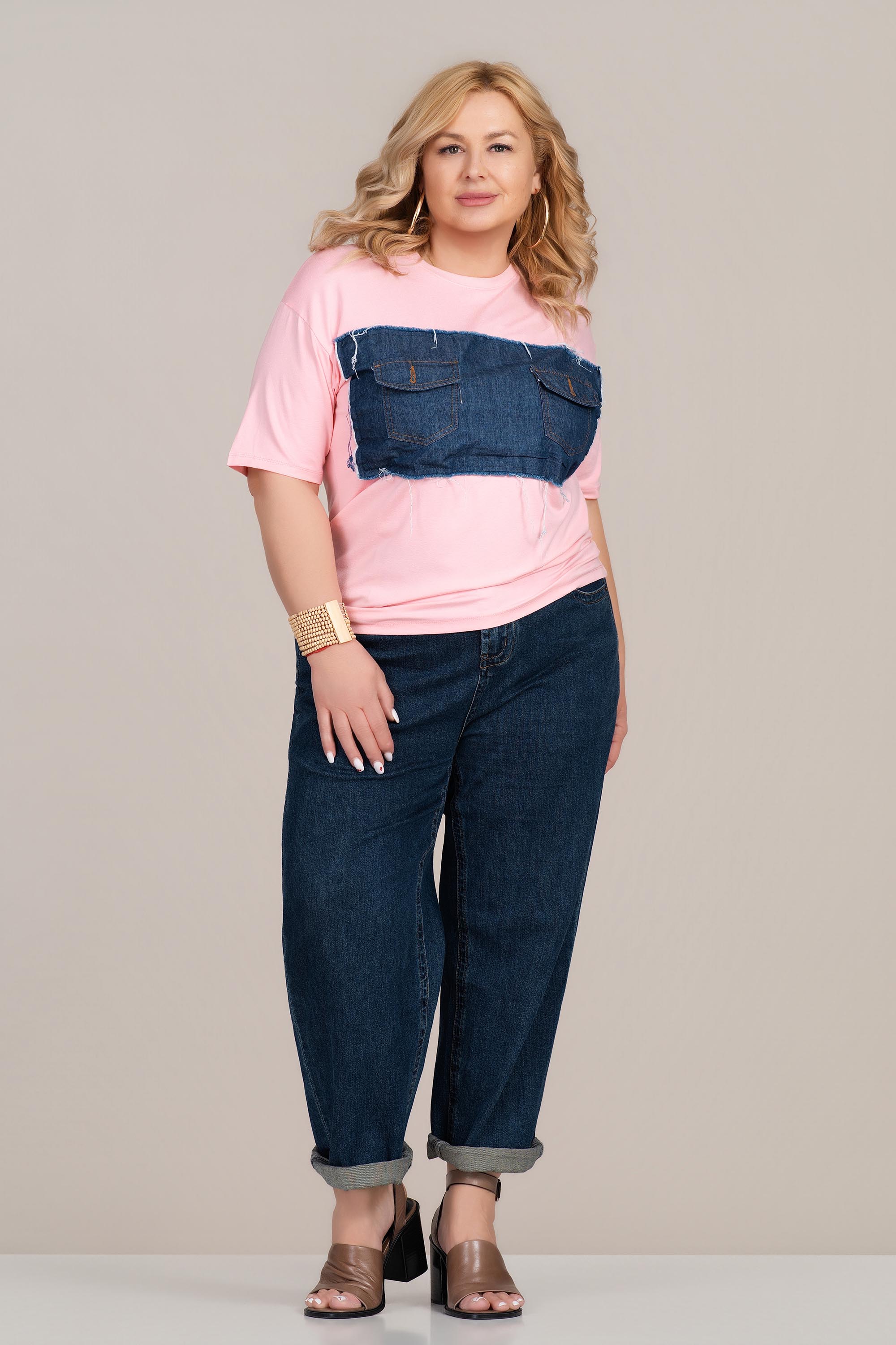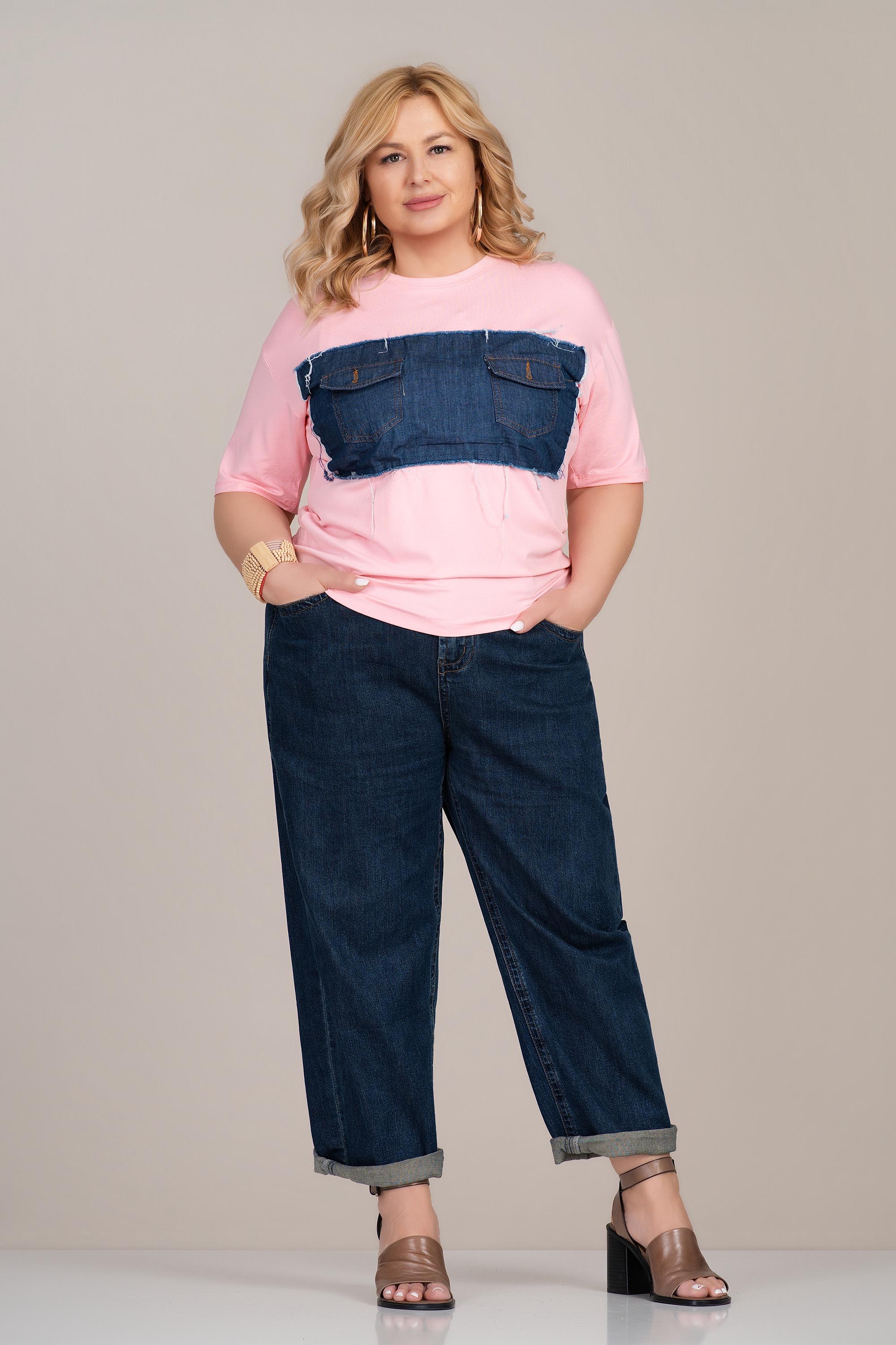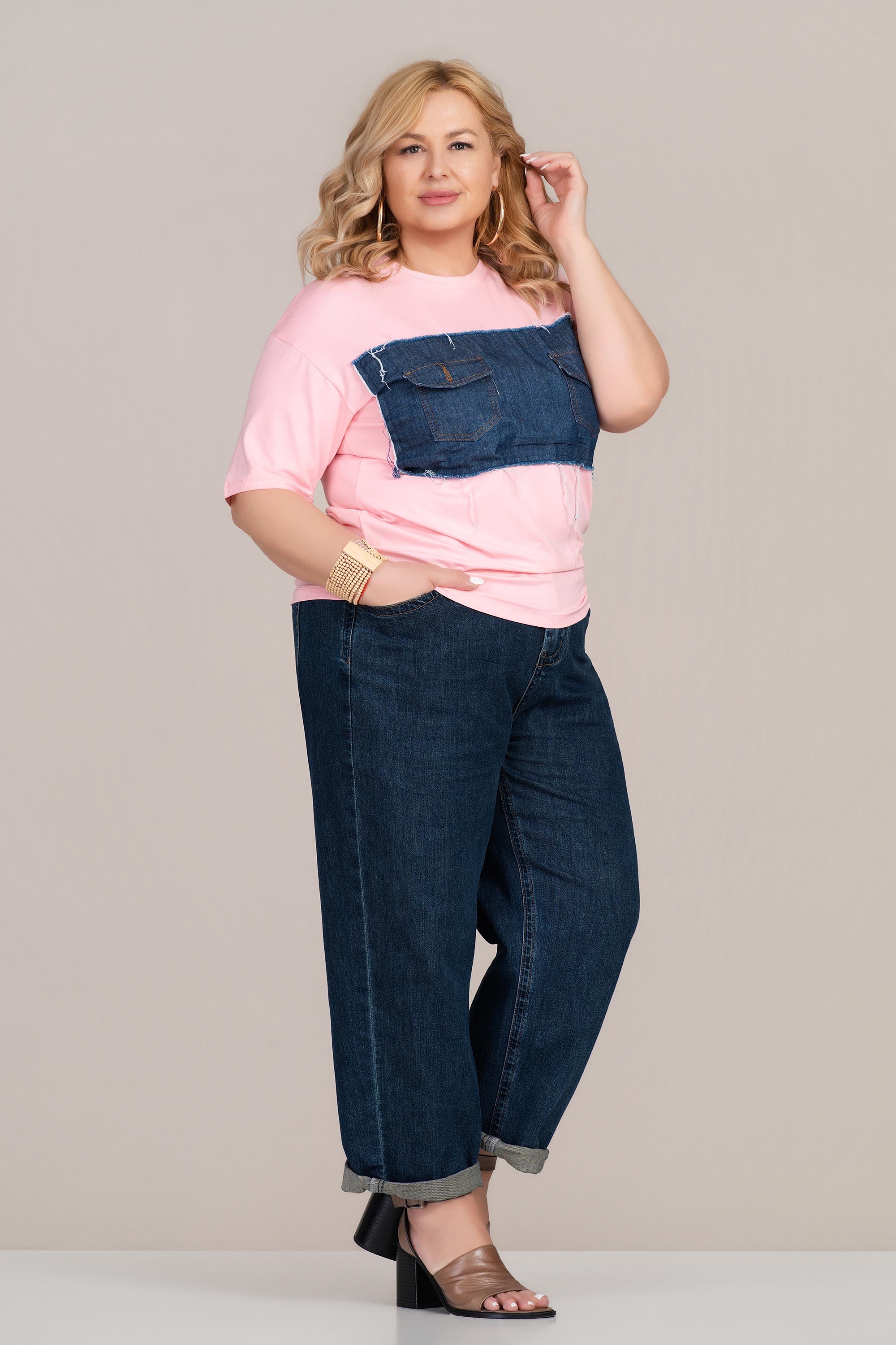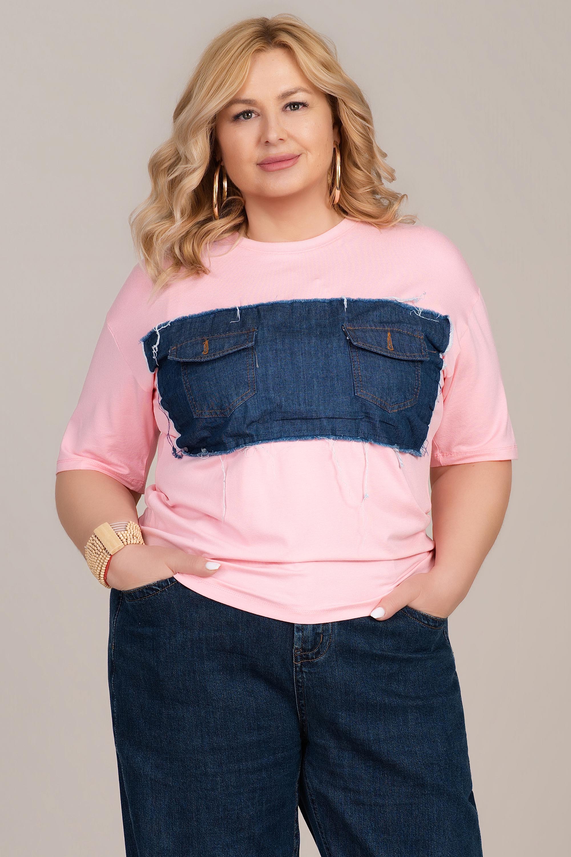 МАКСИ тениска в розово с апликация от деним