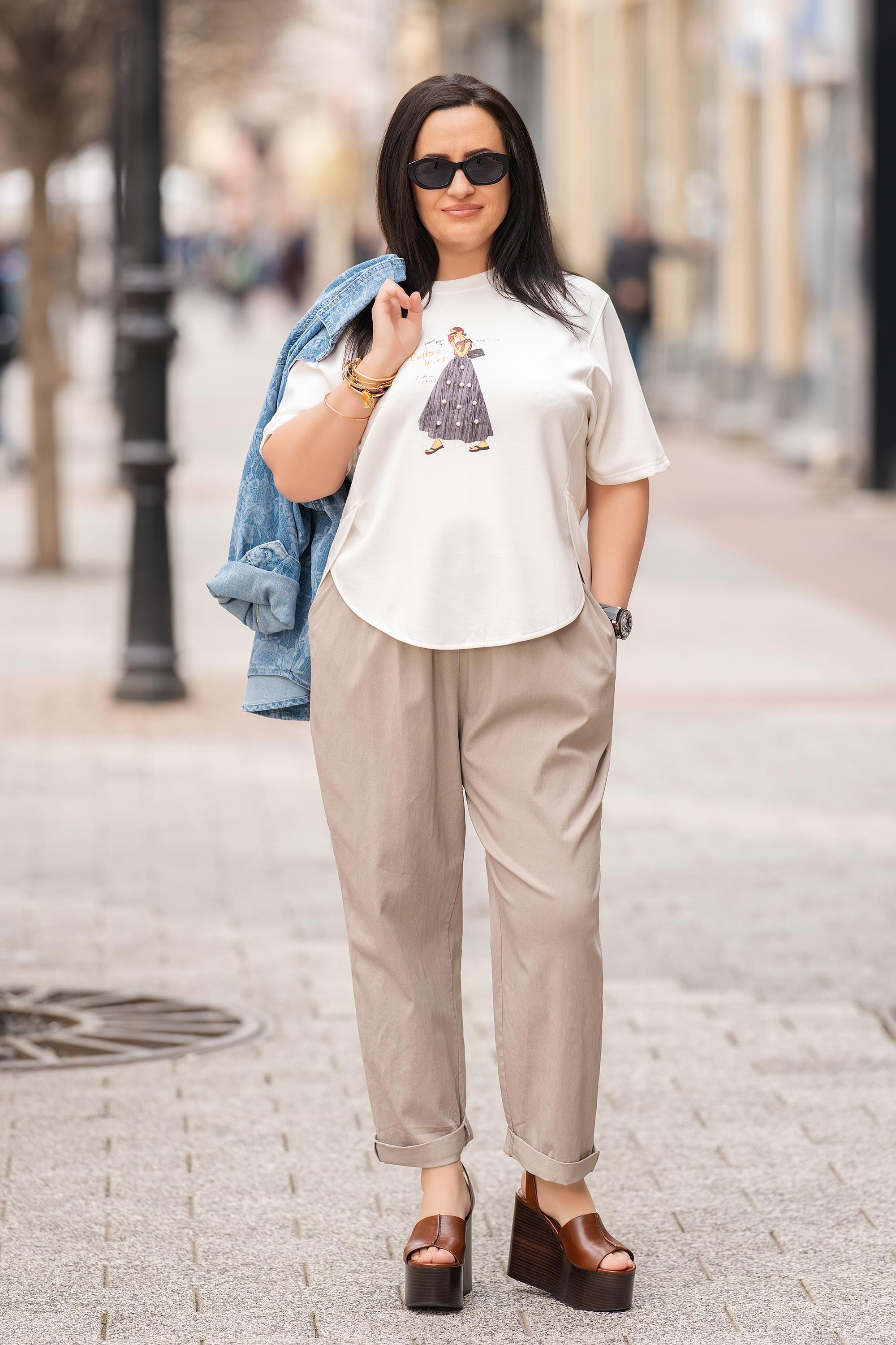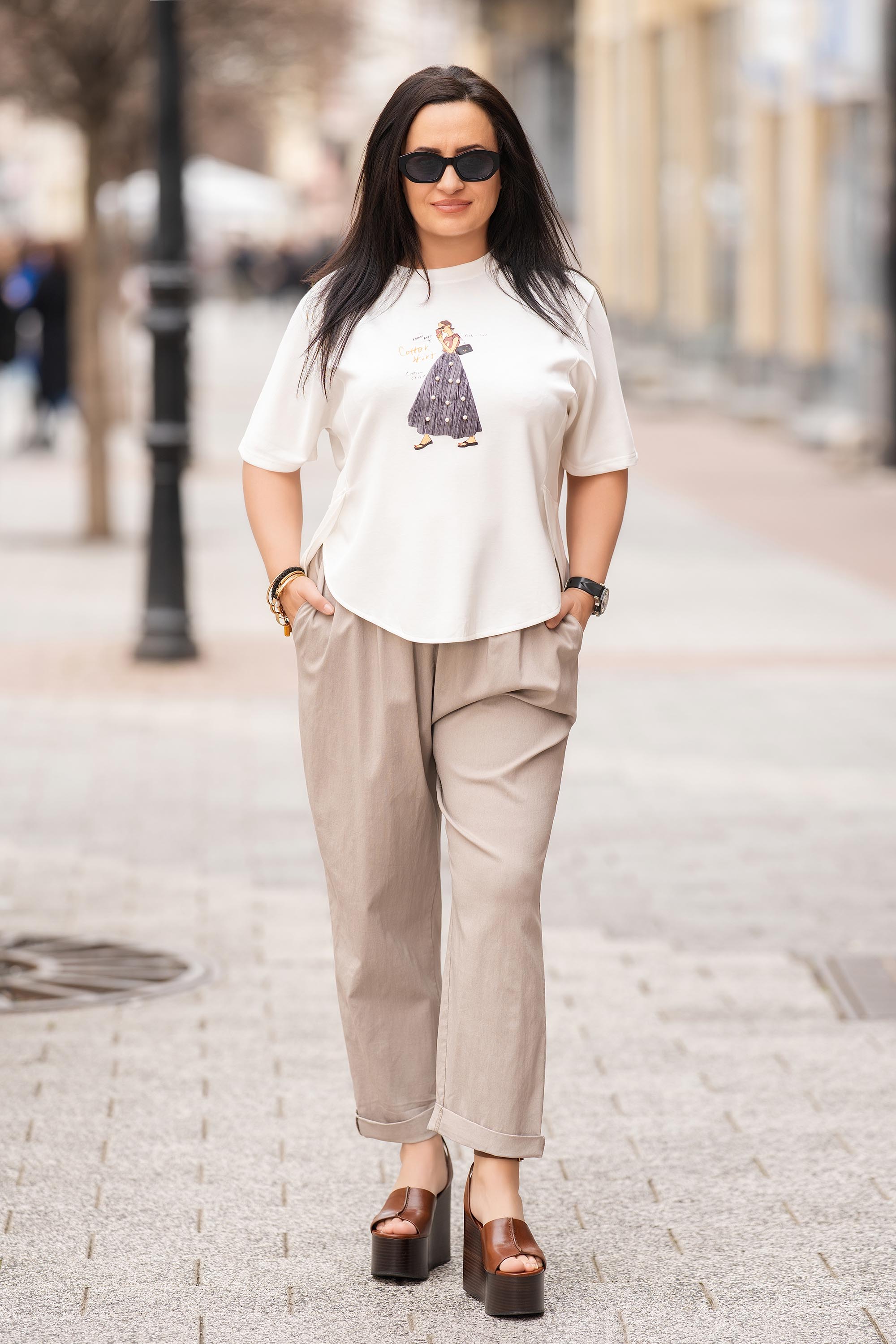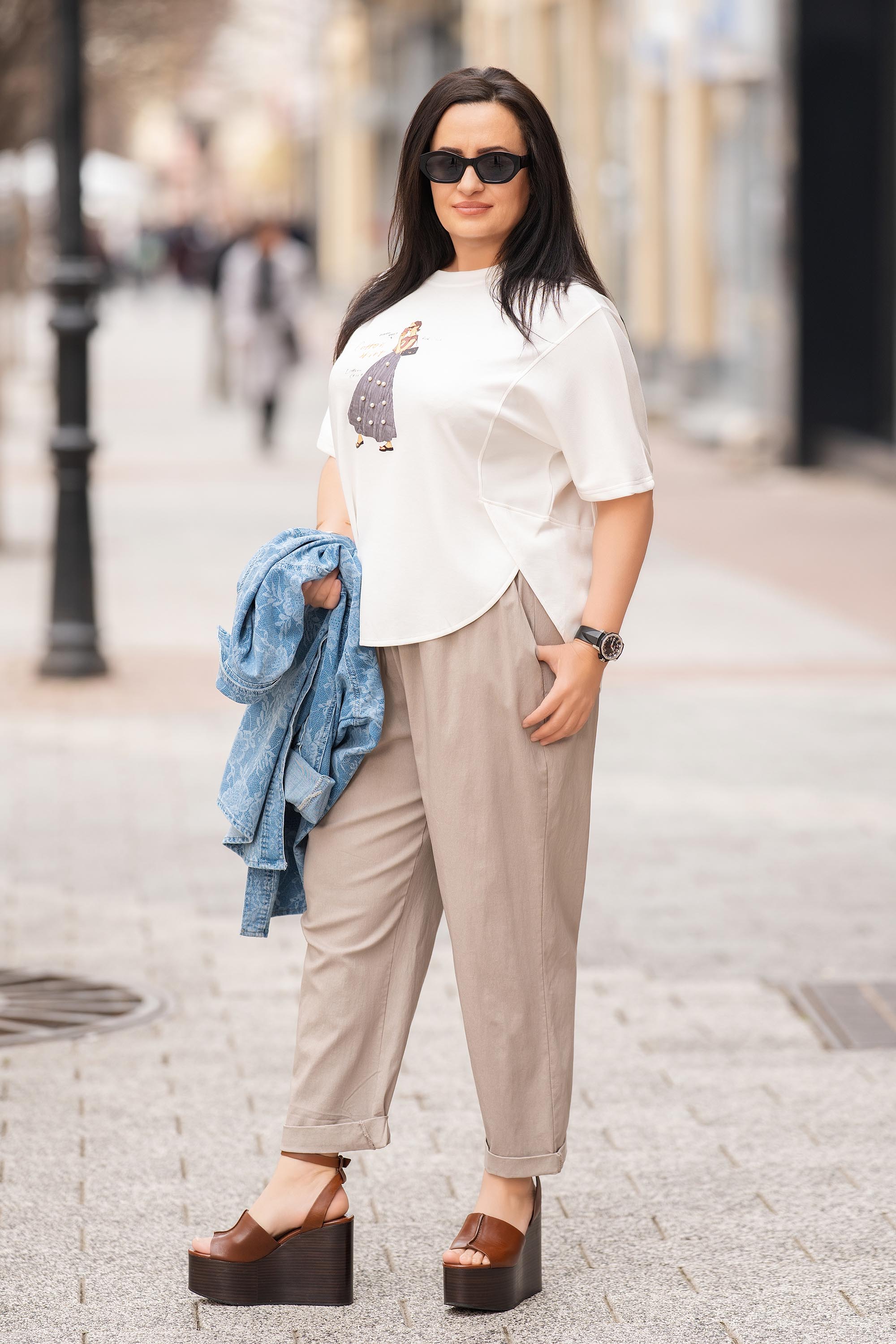 Комфортен модел с модерен акцент, създаден за ежедневна увереност. Мекото трико осигурява приятно усещане върху кожата, а добавеният еластан гарантира гъвкавост и свобода на движение. Свободната кройка пада леко по тялото и създава балансиран силует. Декоративният принт придава индивидуалност и свежо излъчване. Подходящ избор за динамично ежедневие и лесно комбиниране.