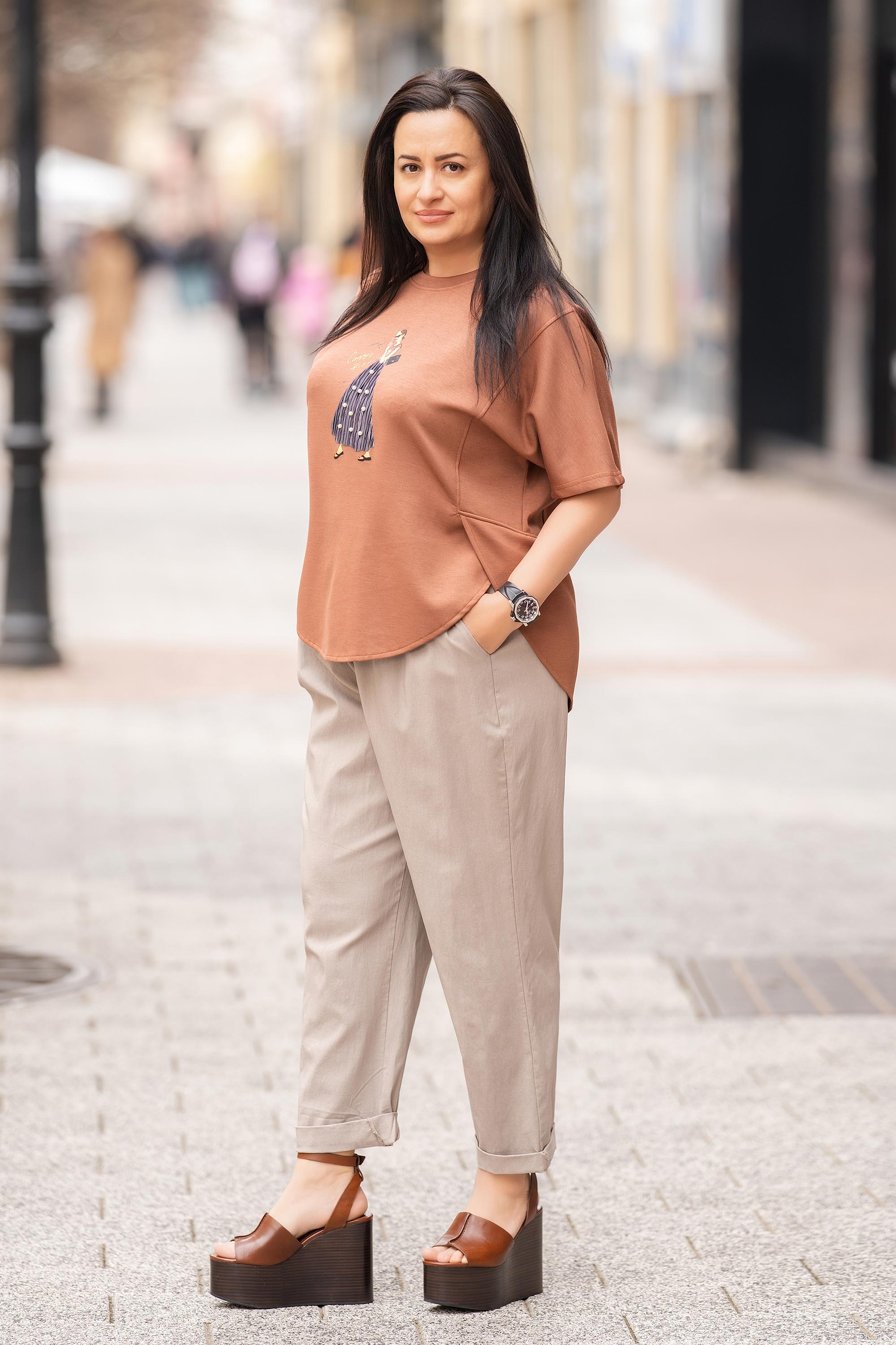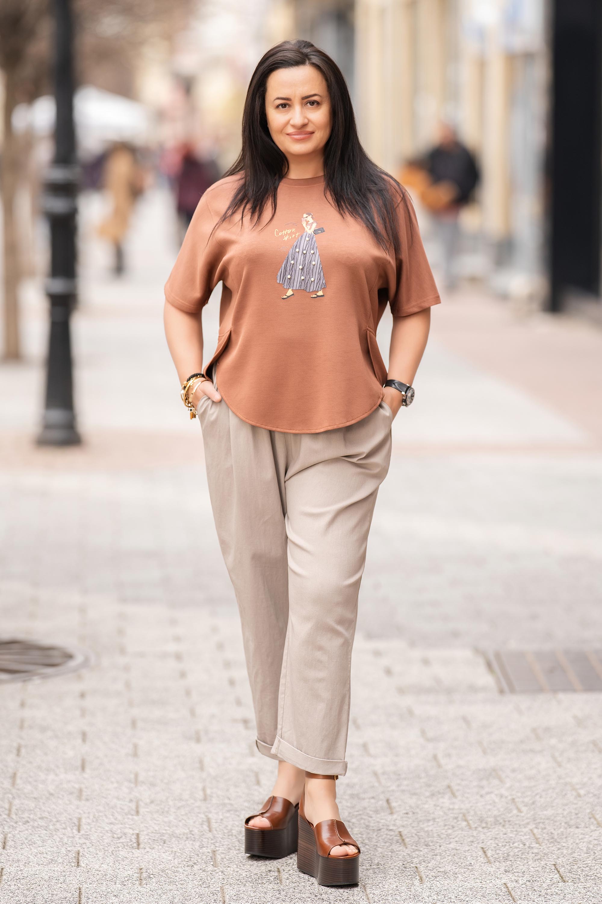 Макси туника от еластична материя в кафяво с артистична декорация