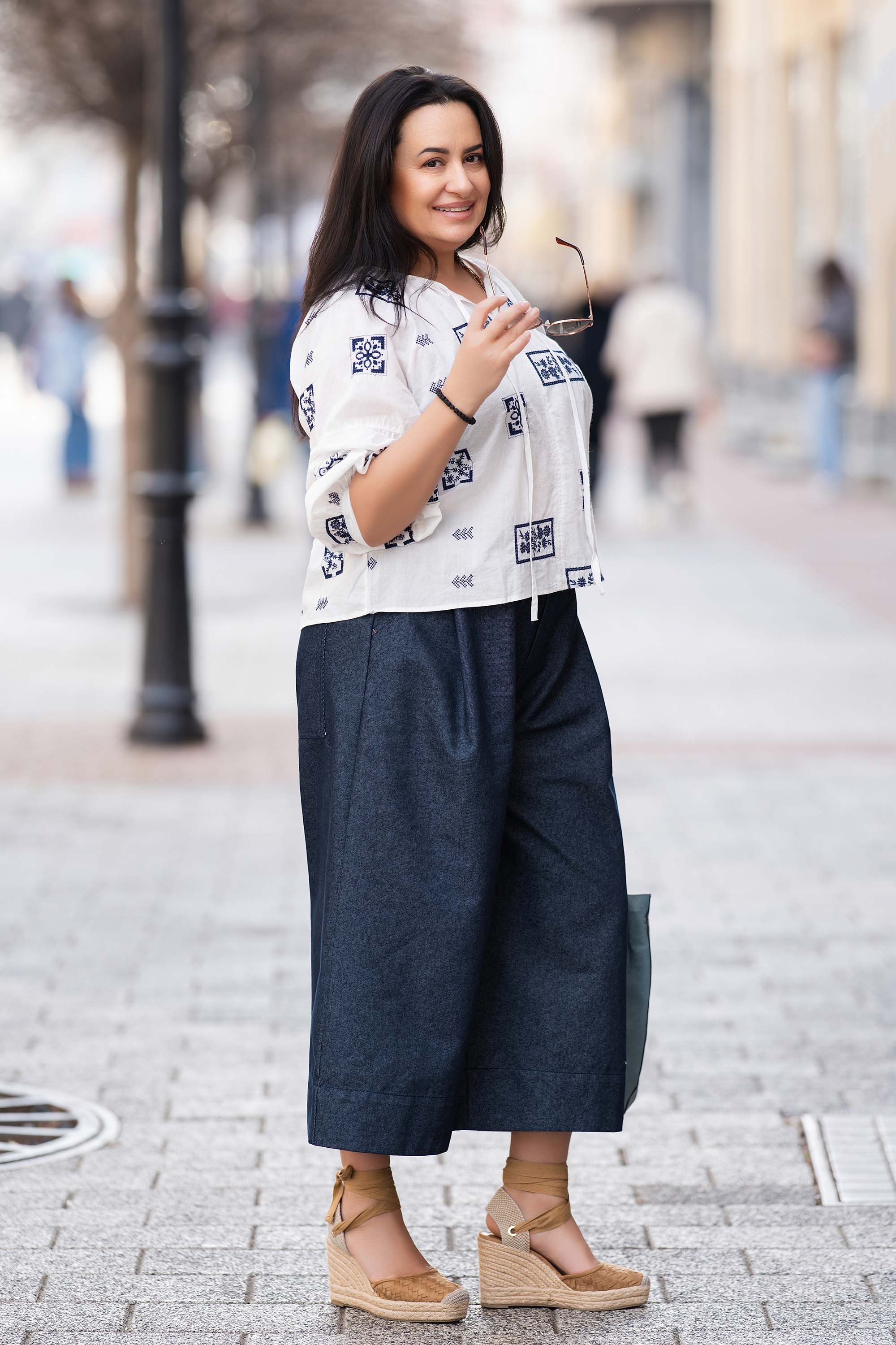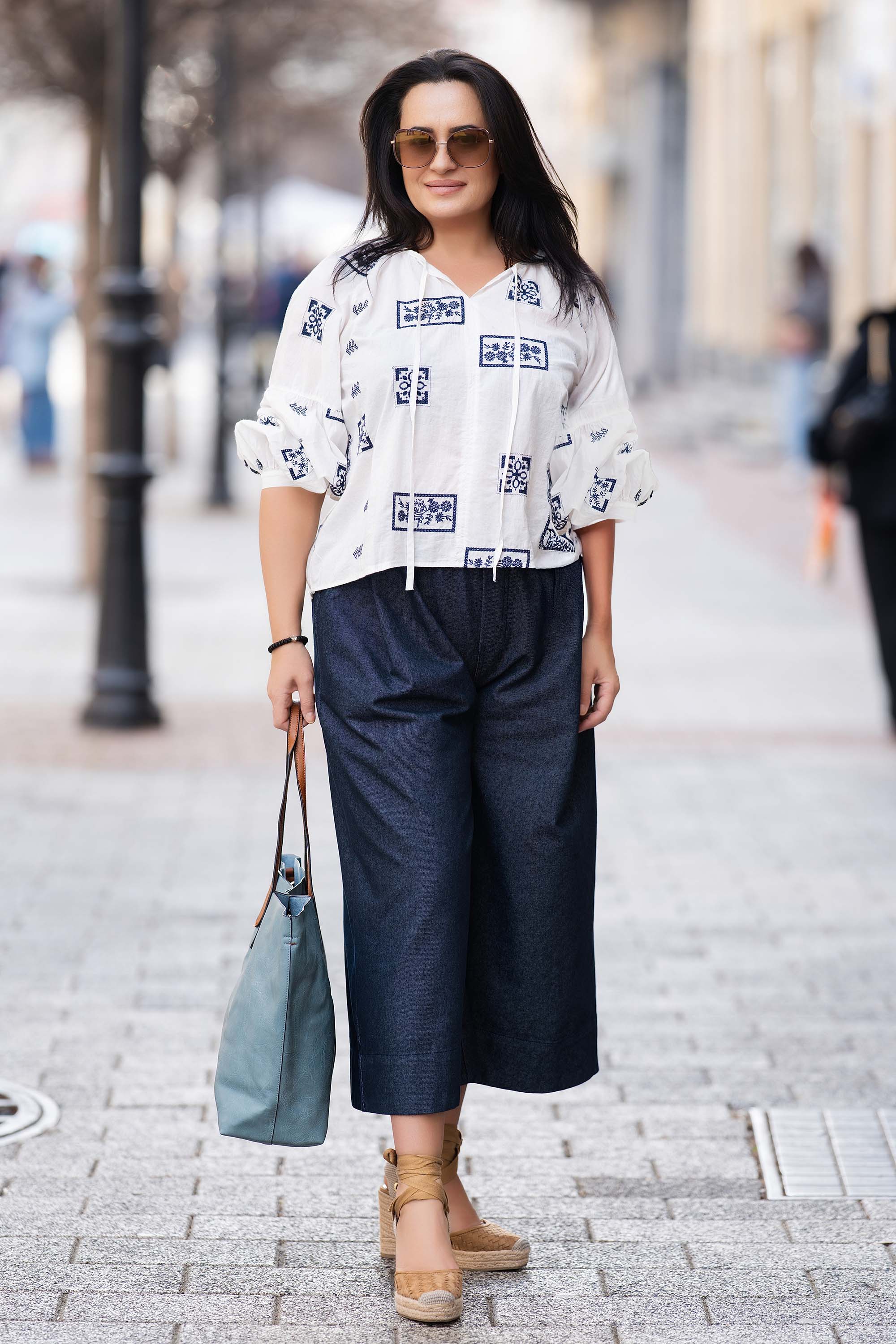 Тази бяла макси туника е изработена от чист памук и предлага свежа визия с лек етно привкус. Острото деколте с връзки придава нежен завършек, а цялата блуза е украсена с тъмносини бродирани квадрати с етно елементи и флорални мотиви. Ръкавите са с лека широчина за комфорт и свобода на движение. Идеална за топлите месеци, тази блуза се съчетава отлично с дънки, ленени или памучни панталони.