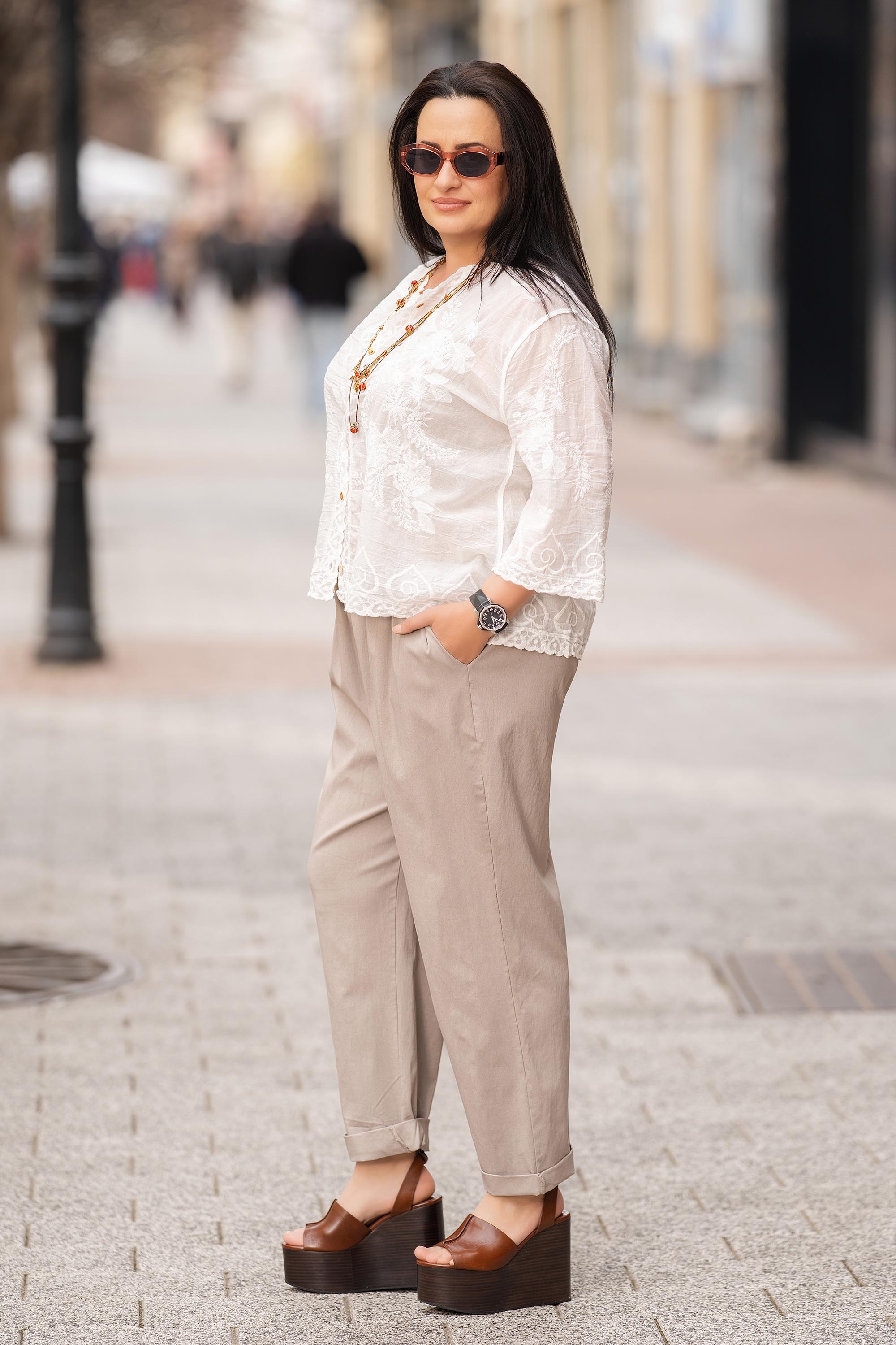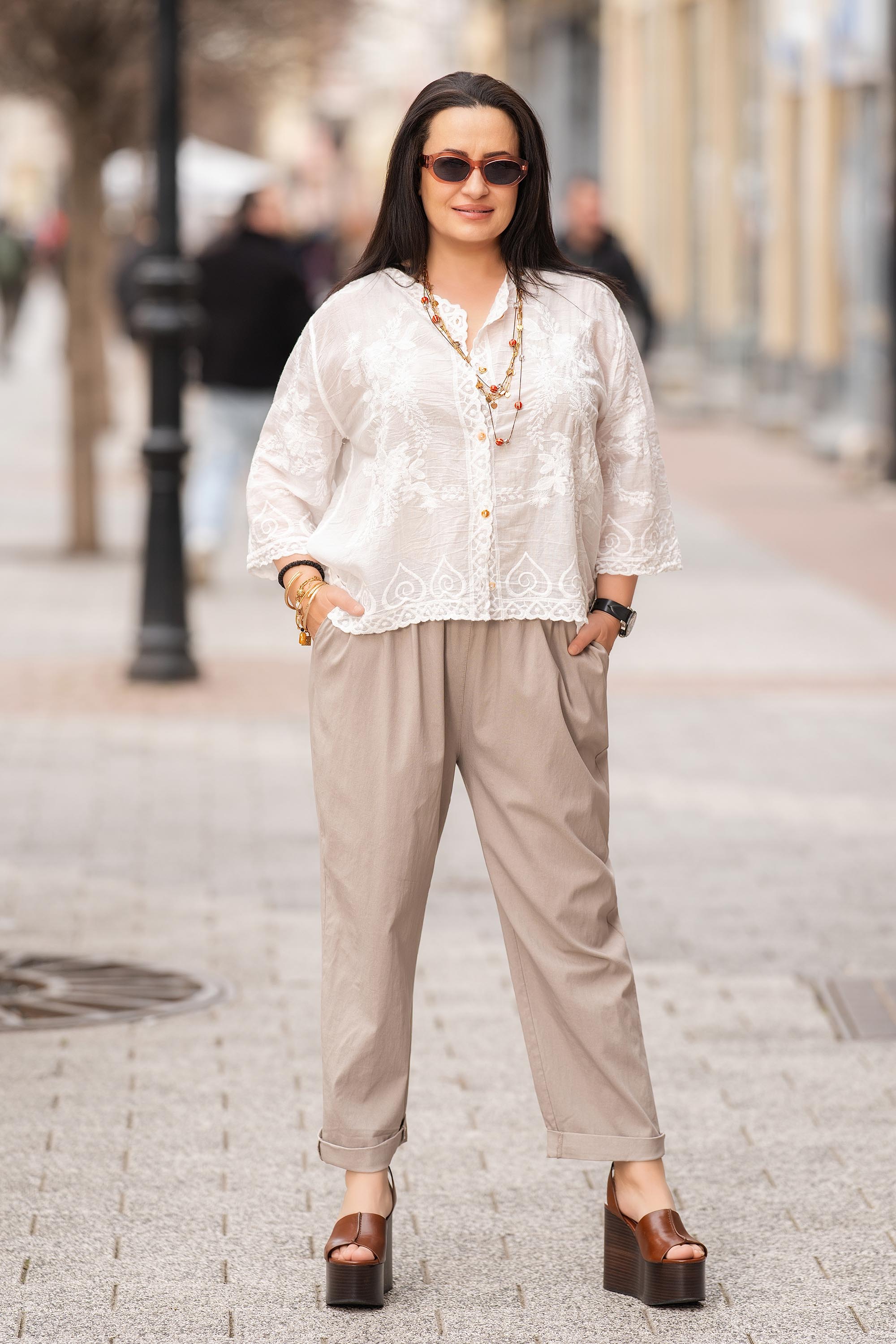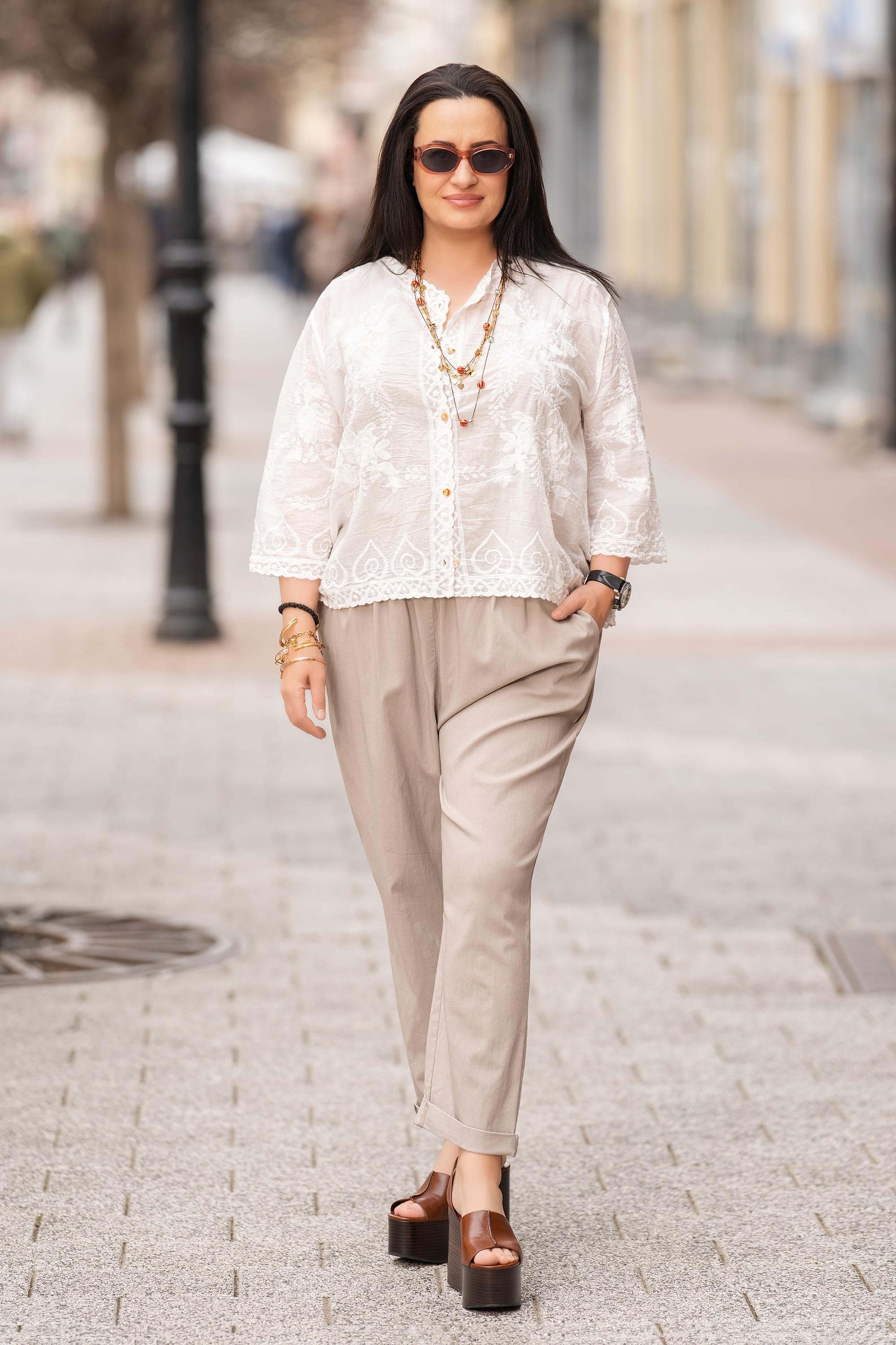 Нежна макси туника в екрю нюанс, украсена с фина бродерия за елегантно и женствено излъчване. Памучната материя е лека и дишаща, осигуряваща комфорт през целия ден. Острото деколте с копчета придава изискан акцент, а 3/4 ръкавите допълват практичността на модела. Свободната кройка осигурява удобство и красиво прилягане.