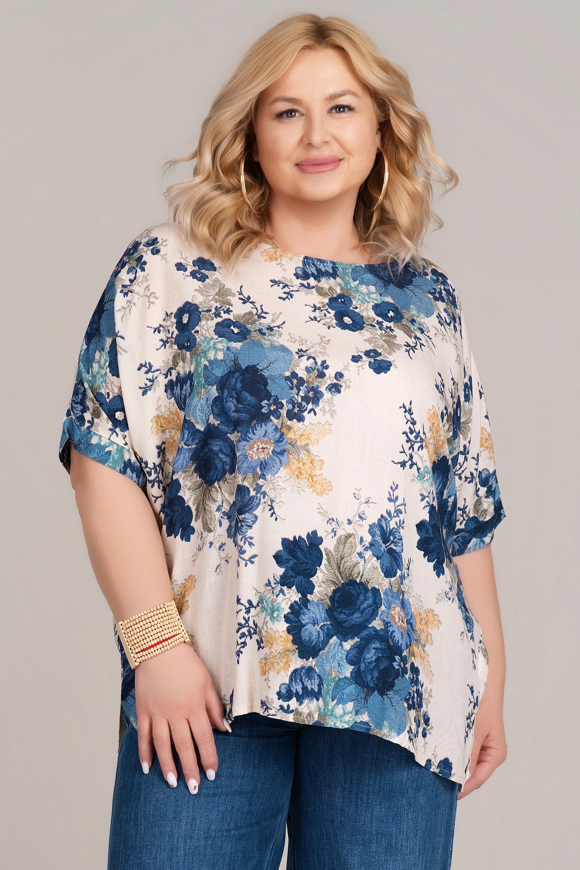 Моделът впечатлява с естествено падаща материя и деликатен флорален десен. Вискозата осигурява прохлада и комфорт, като е подходяща за ежедневна употреба през пролетно-летния сезон. Свободният силует прикрива несъвършенствата и създава усещане за лекота, а обло деколте допълва изчистената визия. Лесно се комбинира с панталони или дънки за завършена градска визия.