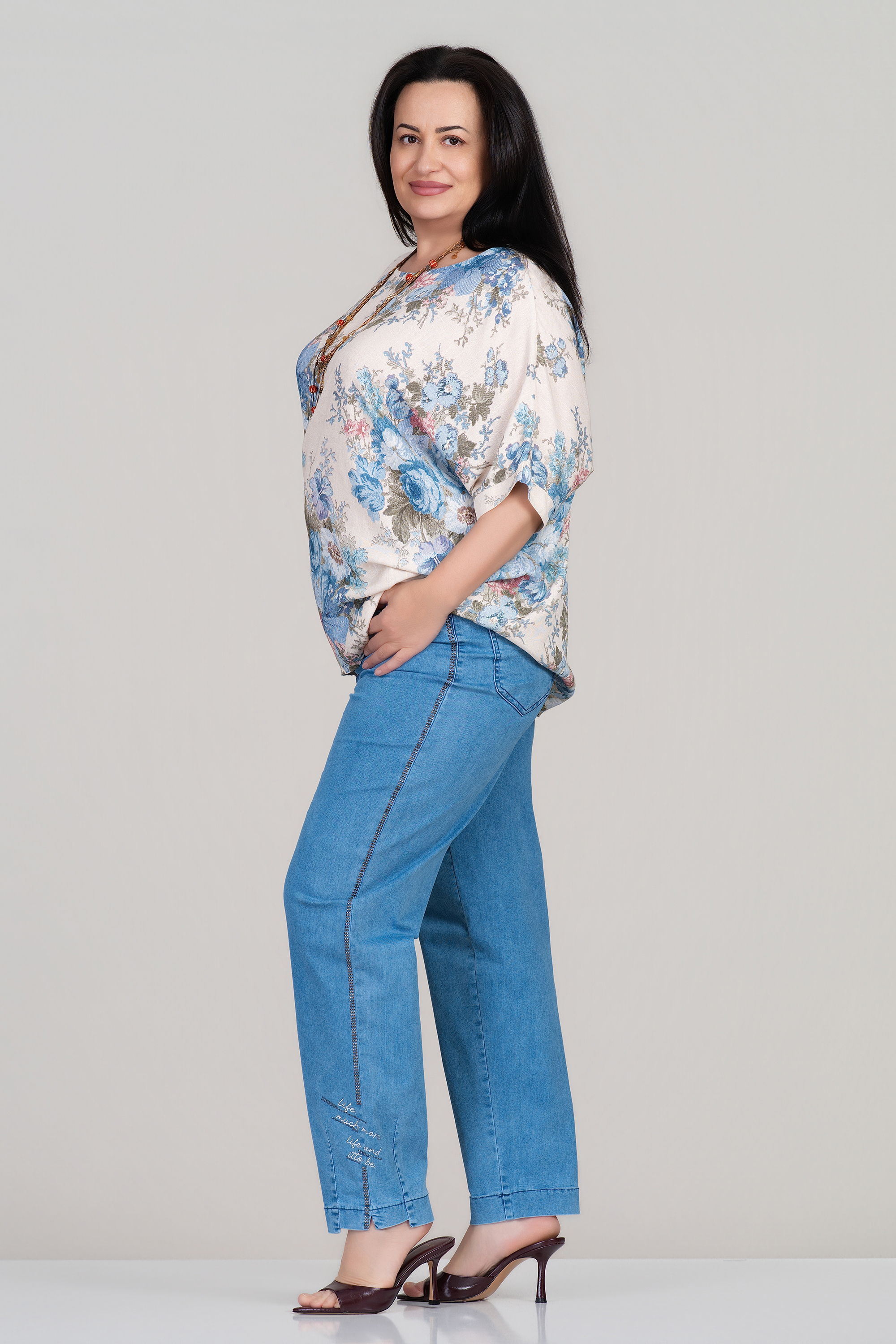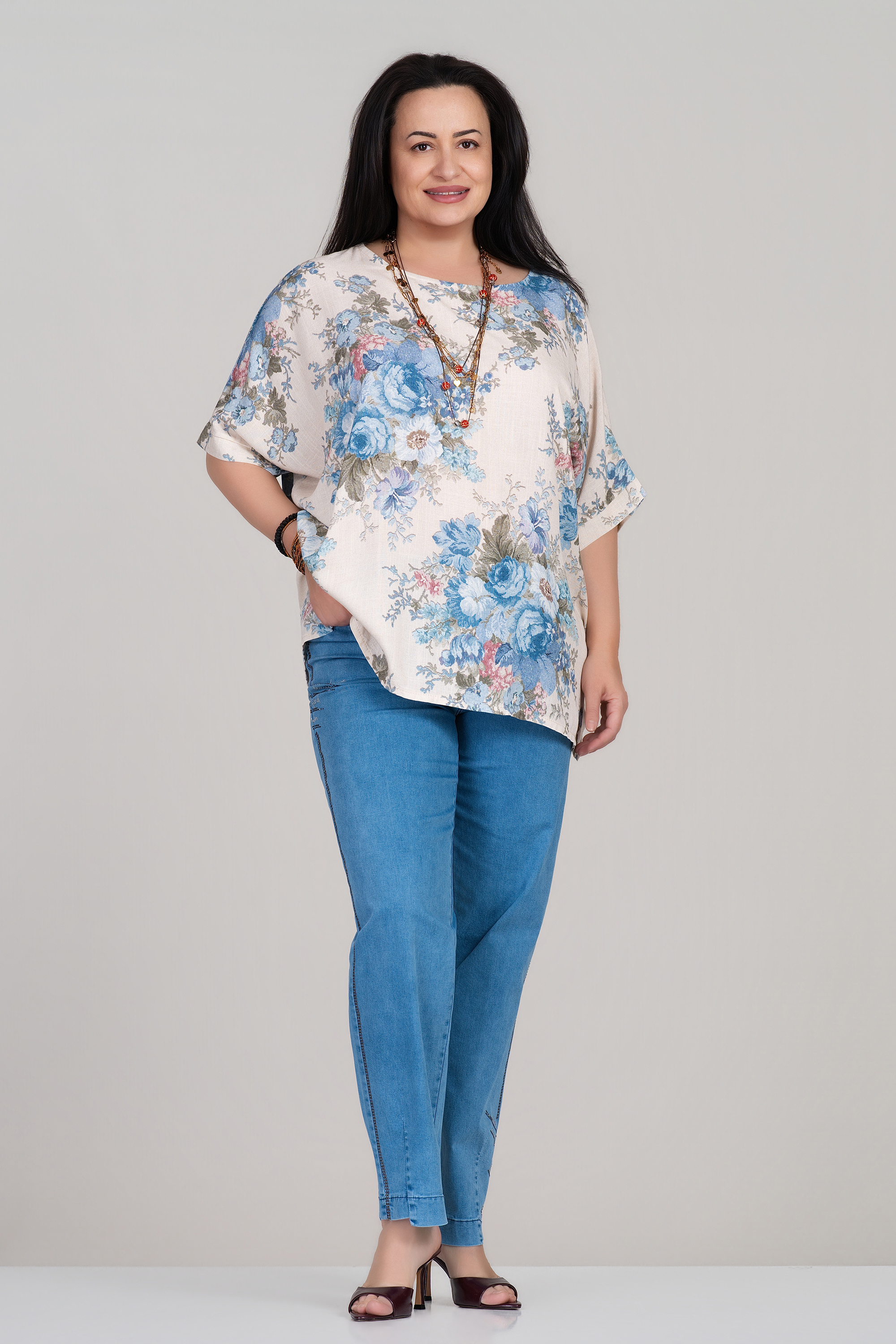 Моделът впечатлява с естествено падаща материя и деликатен флорален десен. Вискозата осигурява прохлада и комфорт, като е подходяща за ежедневна употреба през пролетно-летния сезон. Свободният силует прикрива несъвършенствата и създава усещане за лекота, а обло деколте допълва изчистената визия. Лесно се комбинира с панталони или дънки за завършена градска визия.