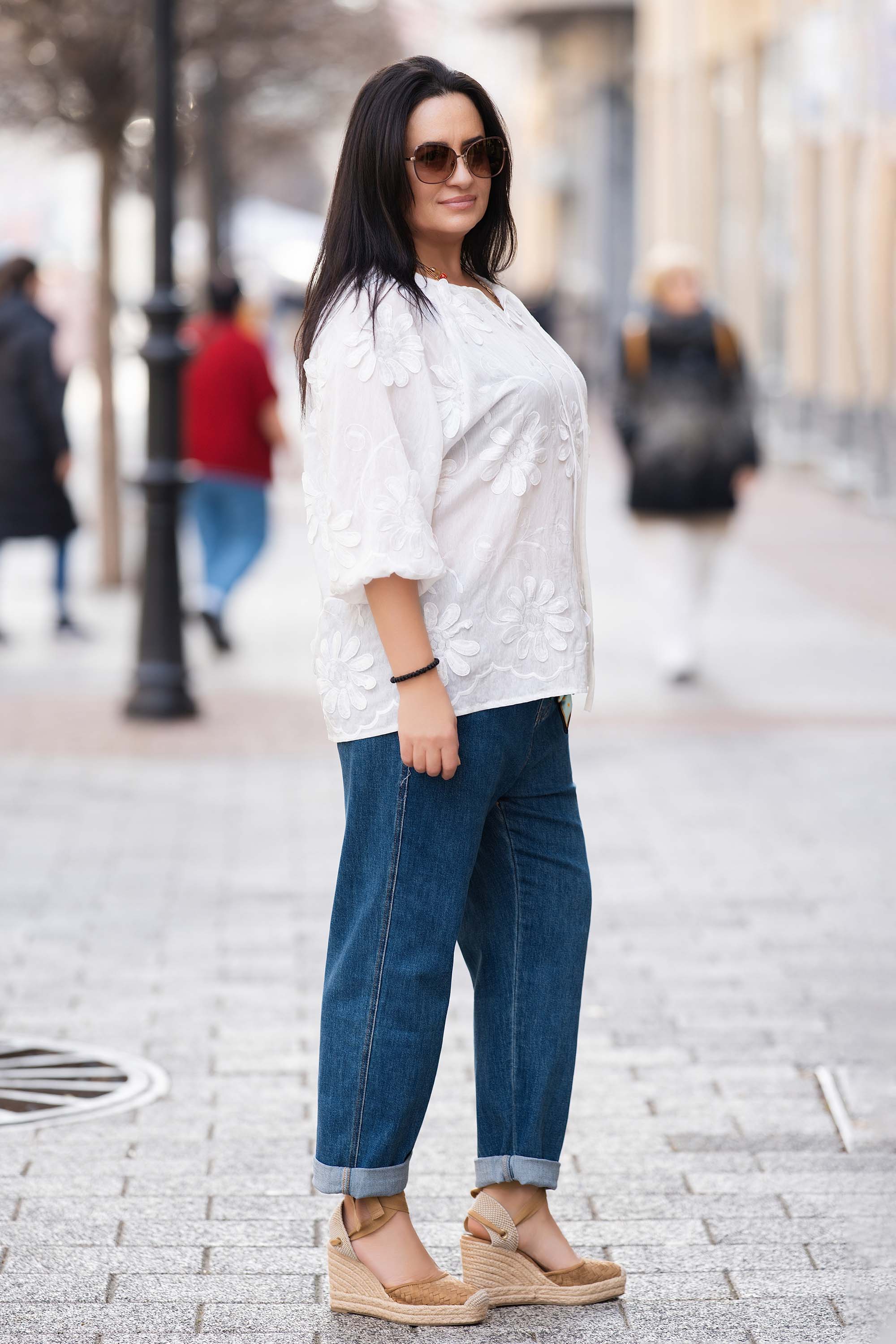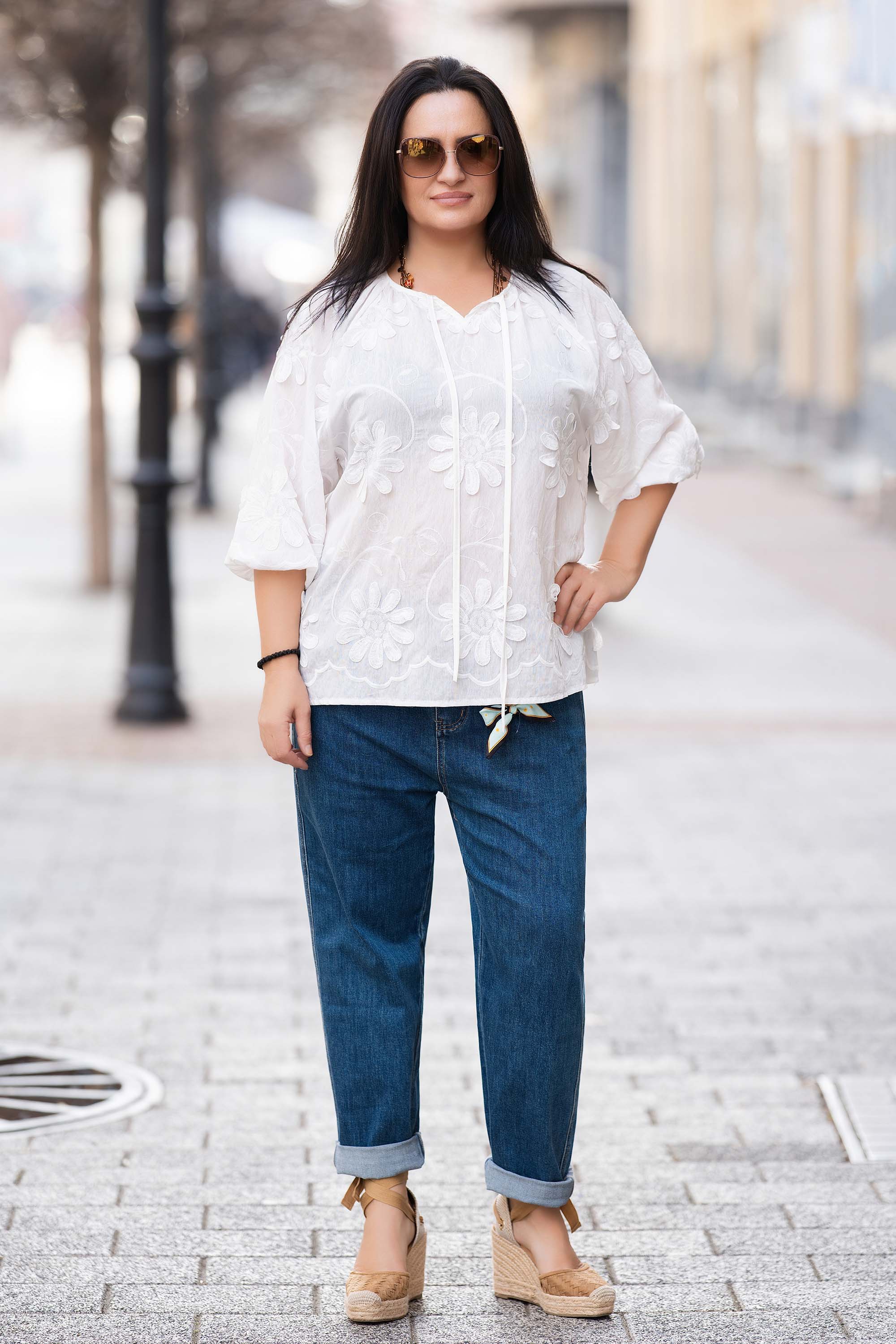 Елегантна блуза, изработена от лек памучен плат с ефектни бродерии в бяло. V-образното деколте и ръкавите с дължина 7/8 придават изтънчена визия, походяща за пролетно-летния сезон. Деликатните флорални елементи добавят нотка женственост, а правата кройка осигурява удобство при носене.