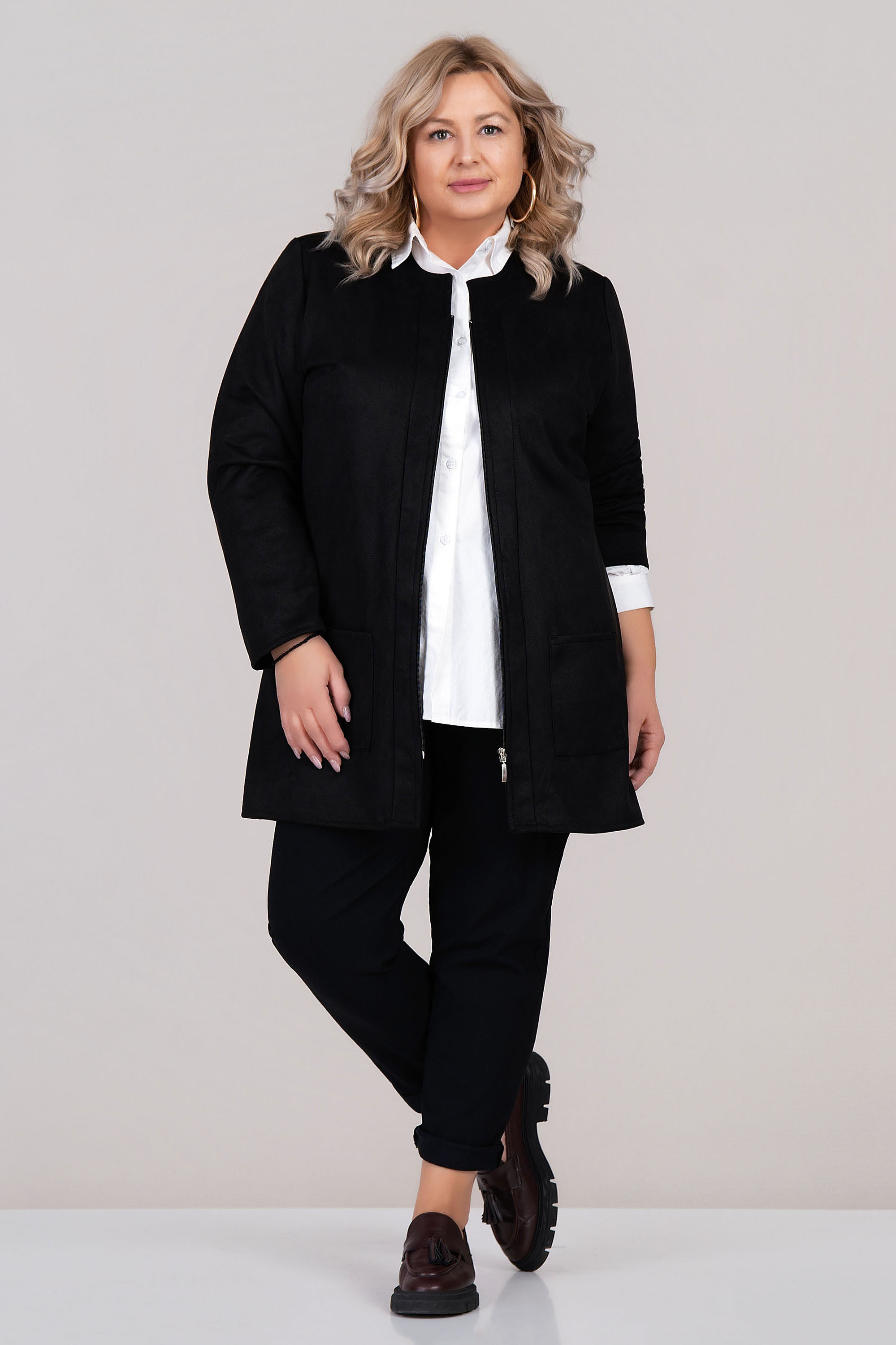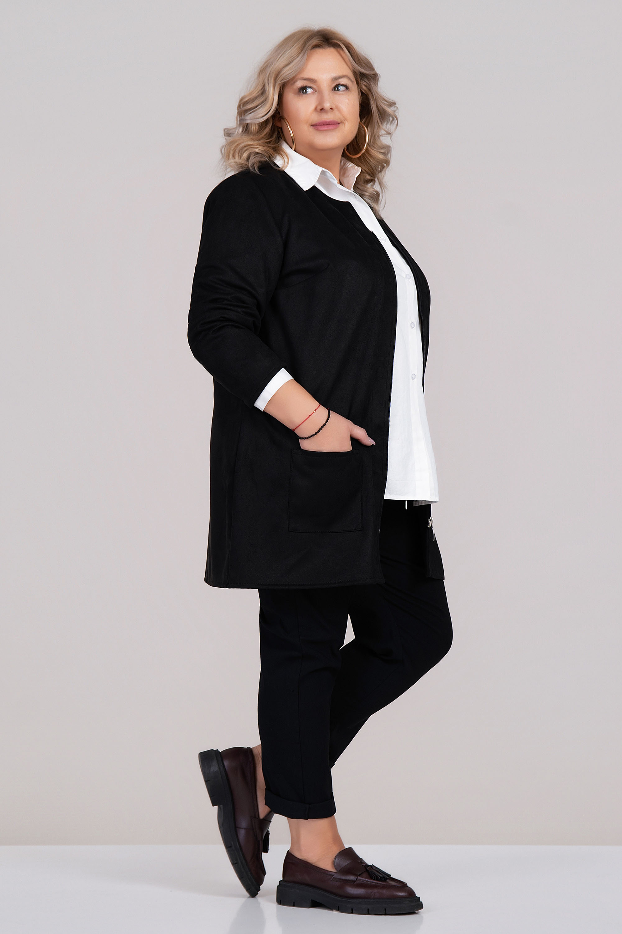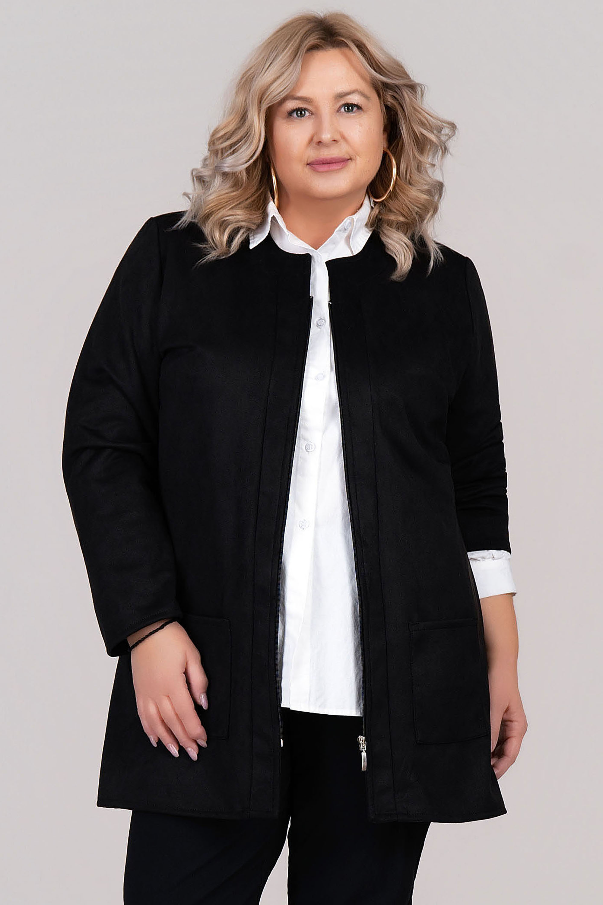 Елегантно макси яке от тънък и мек велур с изчистена класическа линия. Черният цвят е универсален, а закопчаването с цип и двата предни джоба придават на модела модерна и практична визия. Якето е без яка, с обло деколте – подходящо за пролет и есен, може да се носи и като сако под връхна дреха.