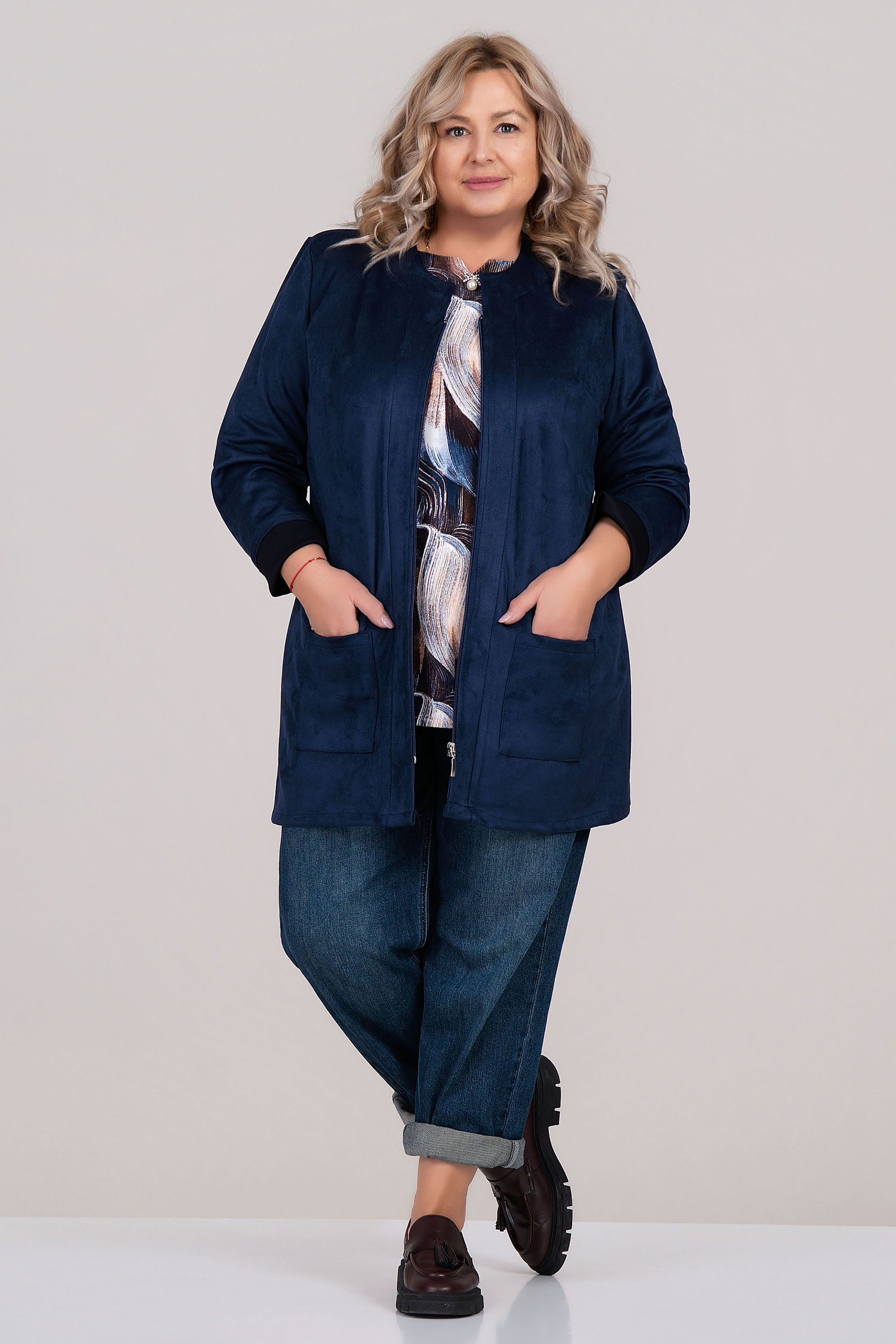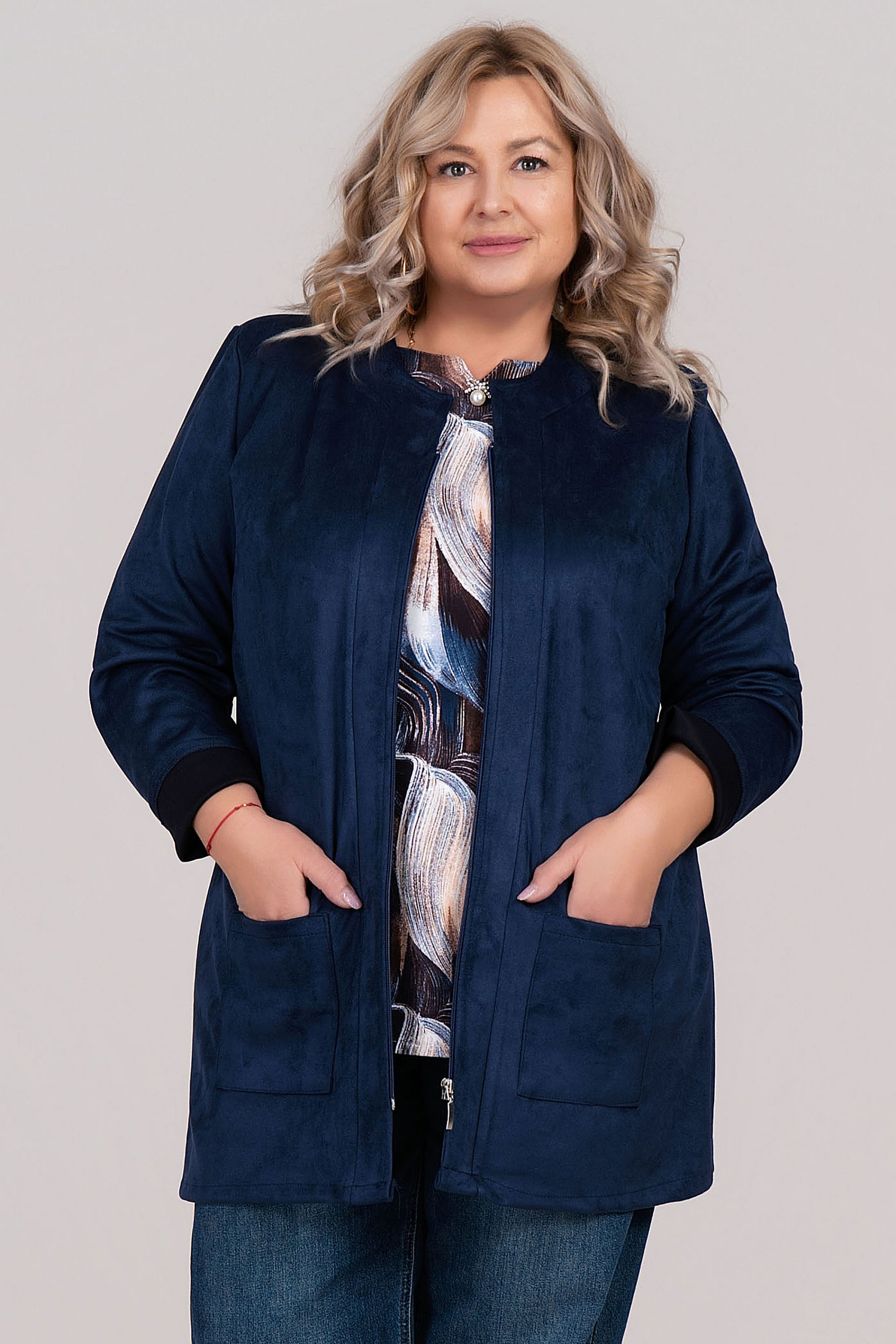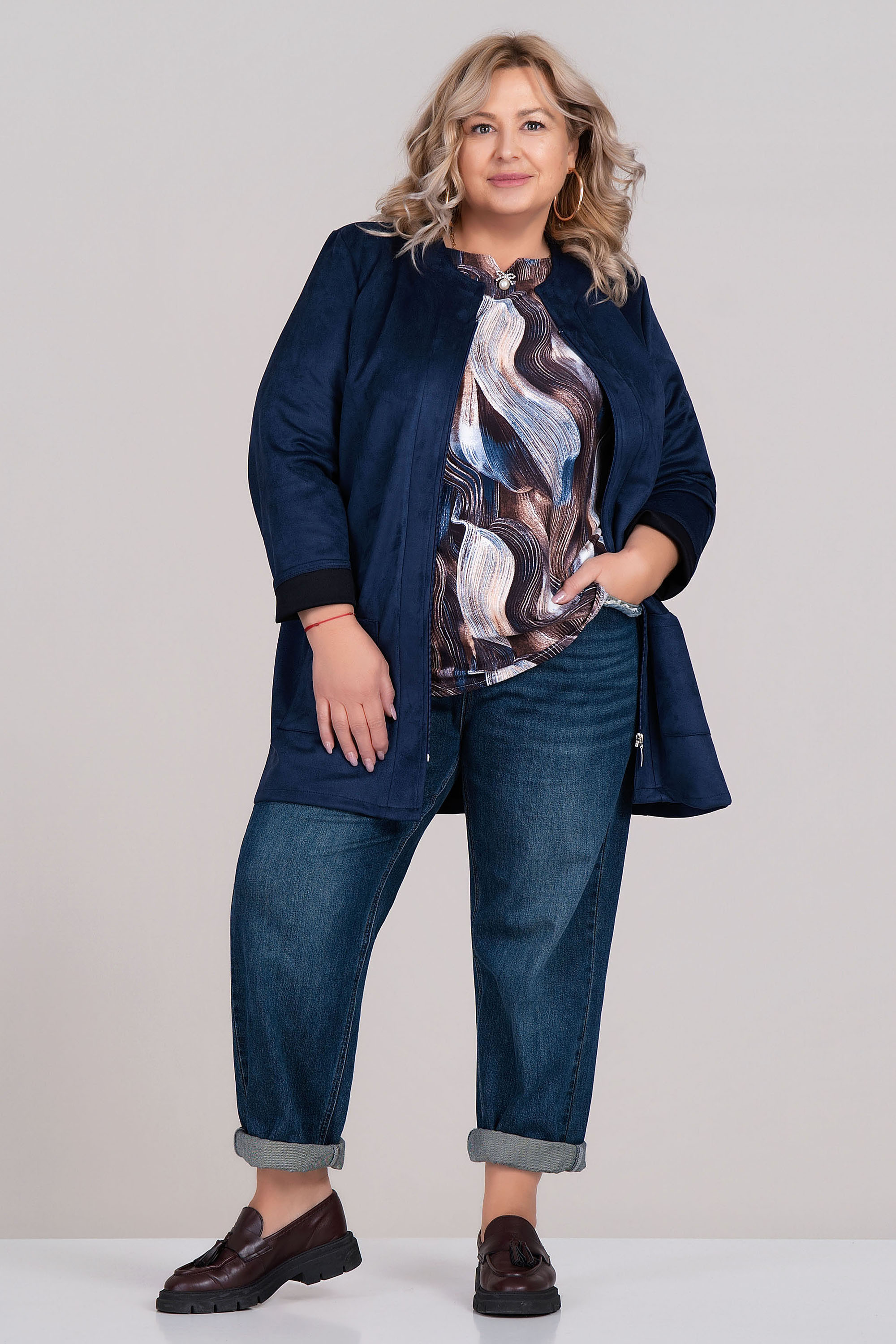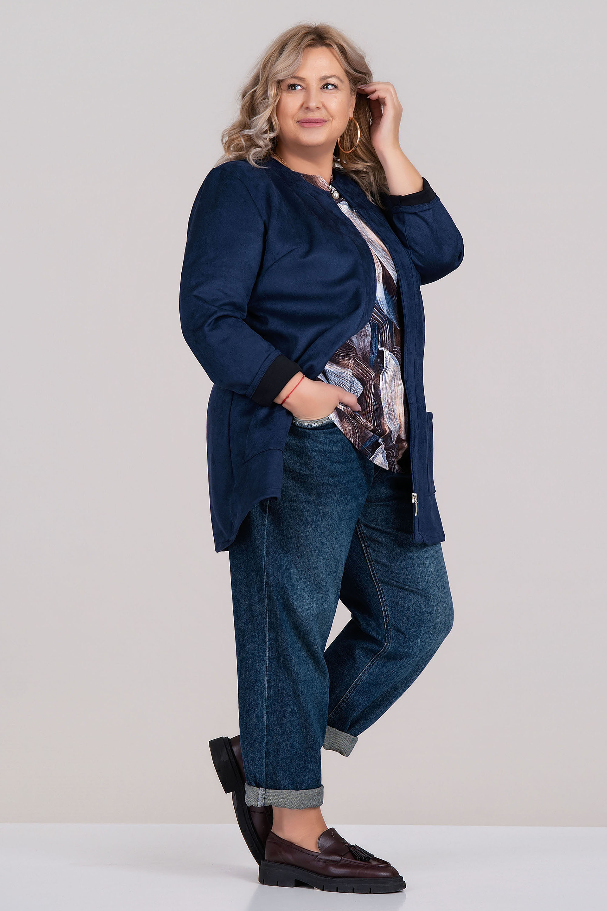 Елегантно макси яке от тънък и мек велур с изчистена класическа линия. Тъмносиният цвят е универсален, а закопчаването с цип и двата предни джоба придават на модела модерна и практична визия. Якето е без яка, с обло деколте – подходящо за пролет и есен, може да се носи и като сако под връхна дреха.
