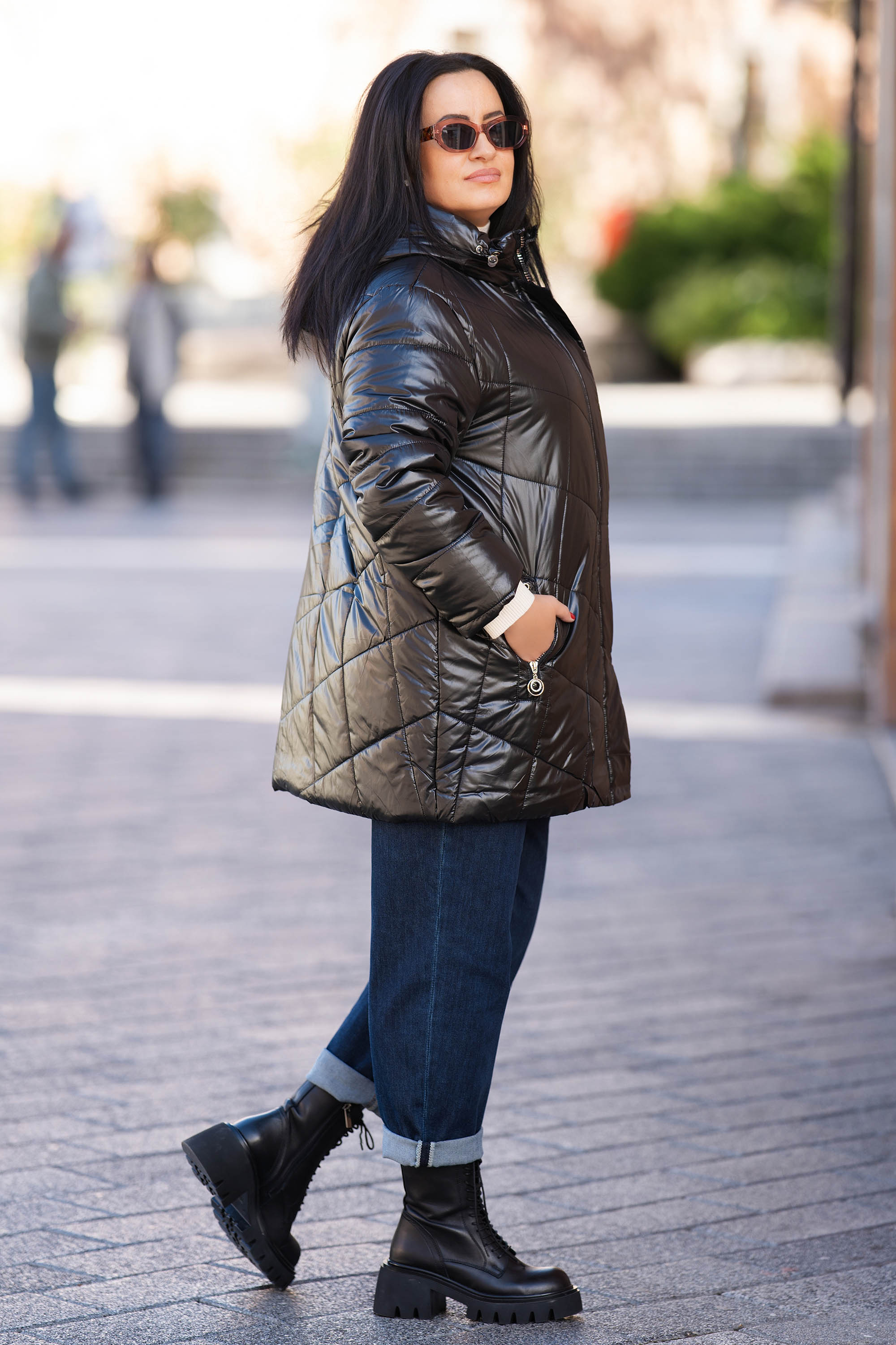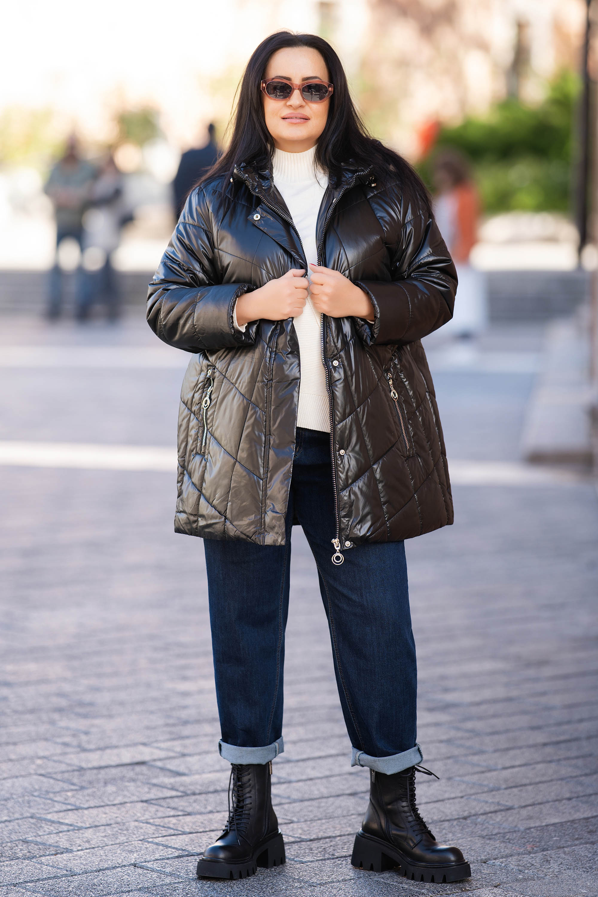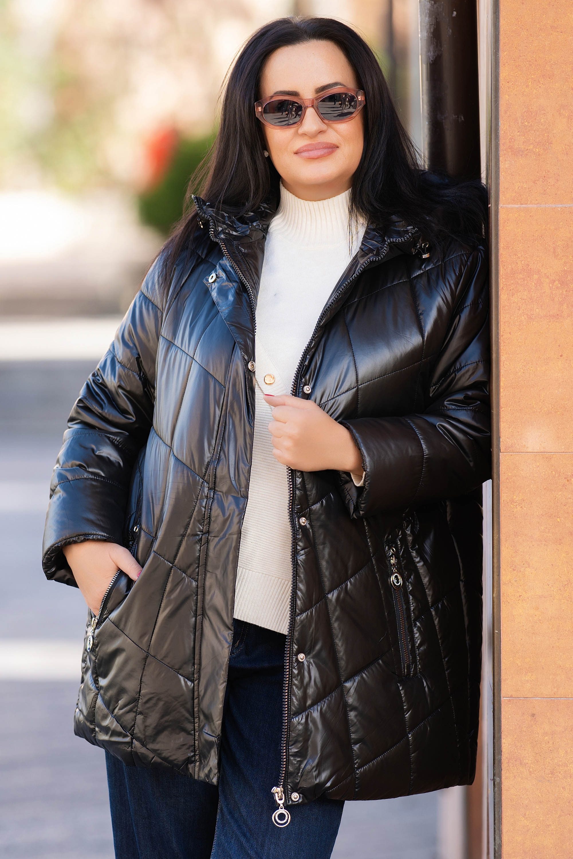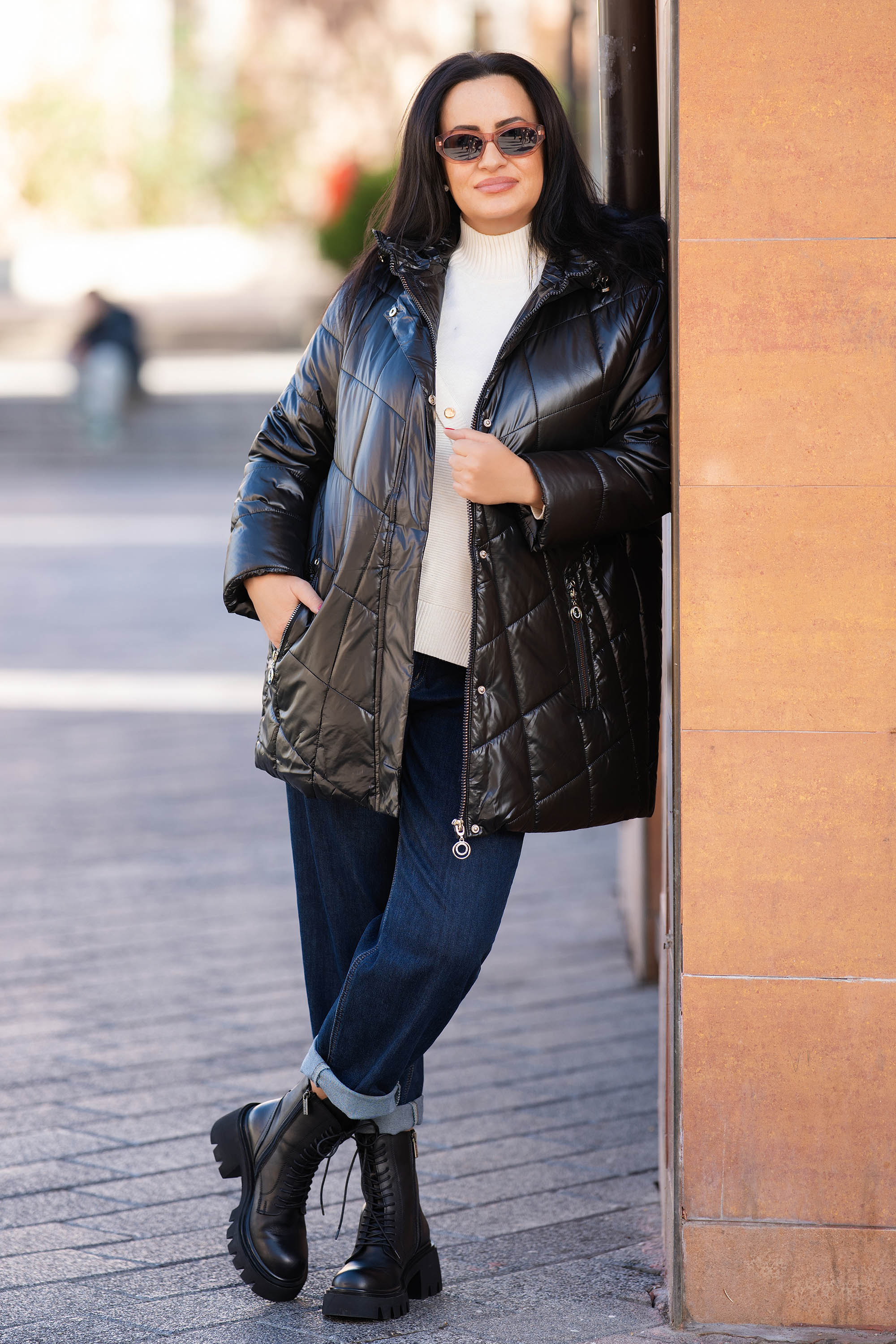 Това макси яке съчетава практичност и стил. Скритото закопчаване с цип и тик-так копчета осигурява чист завършек, а качулката добавя допълнителна защита при вятър и дъжд. Ромбоидните шевове създават интересна текстура и издължен силует. Черният цвят го прави универсално допълнение към всеки гардероб.