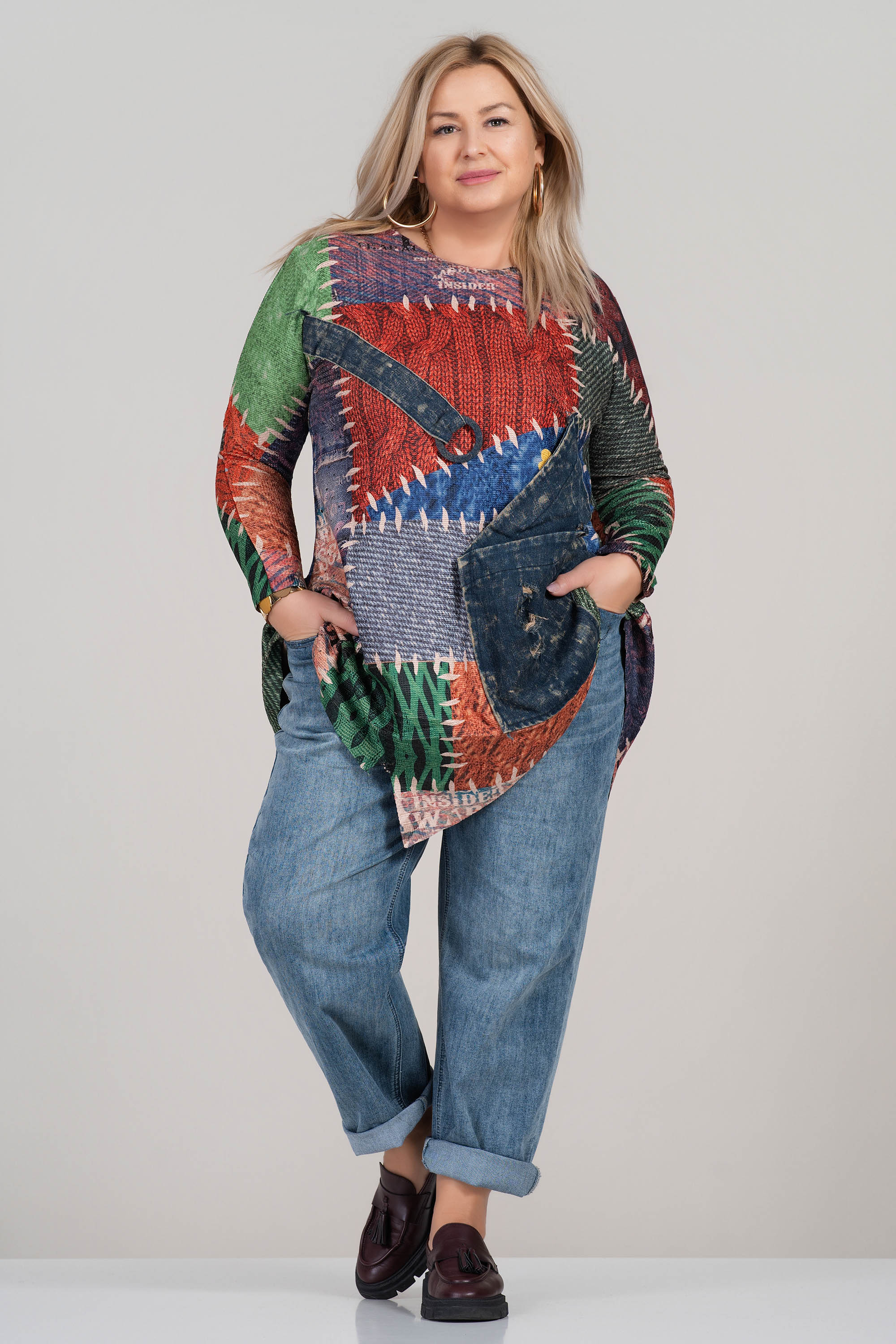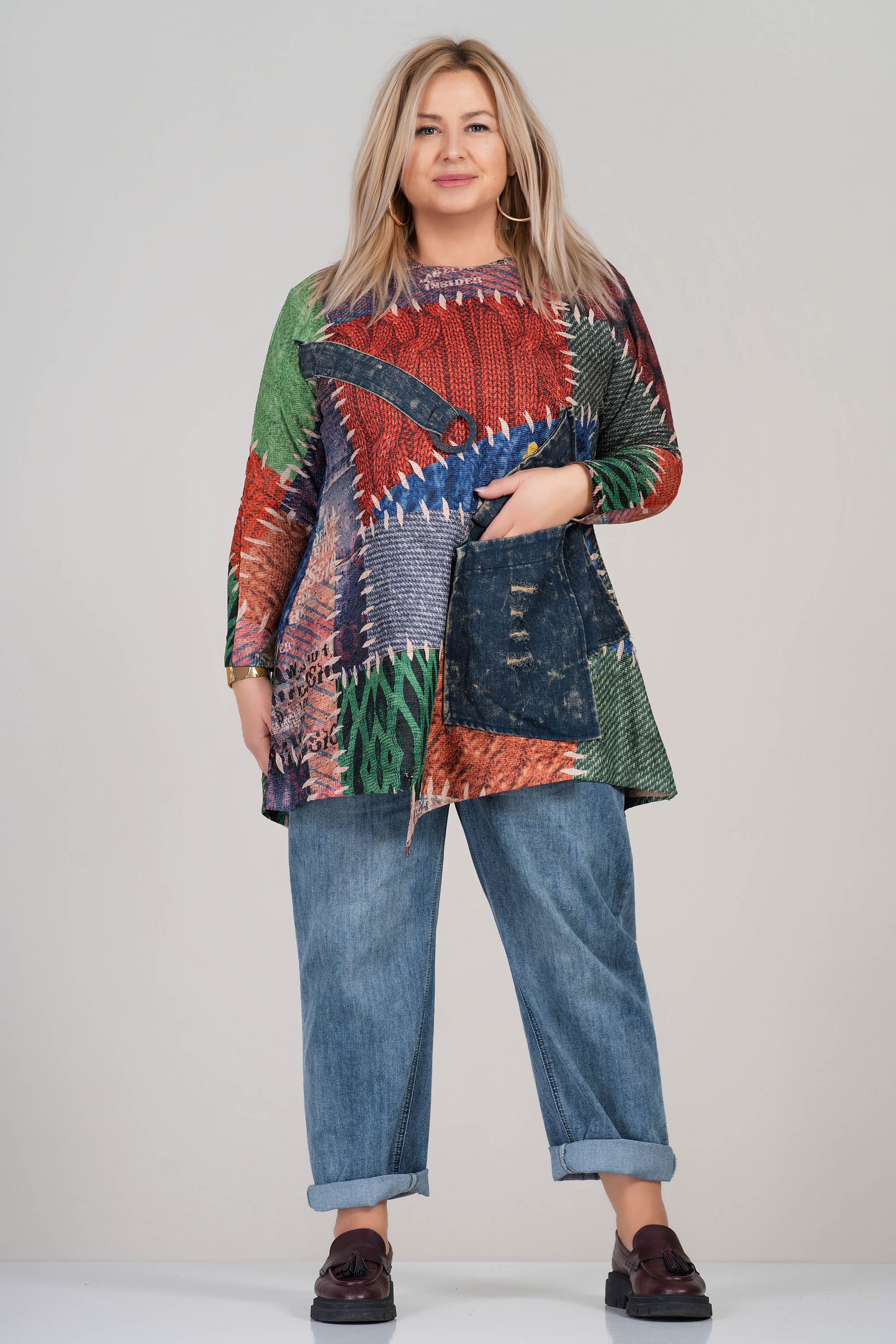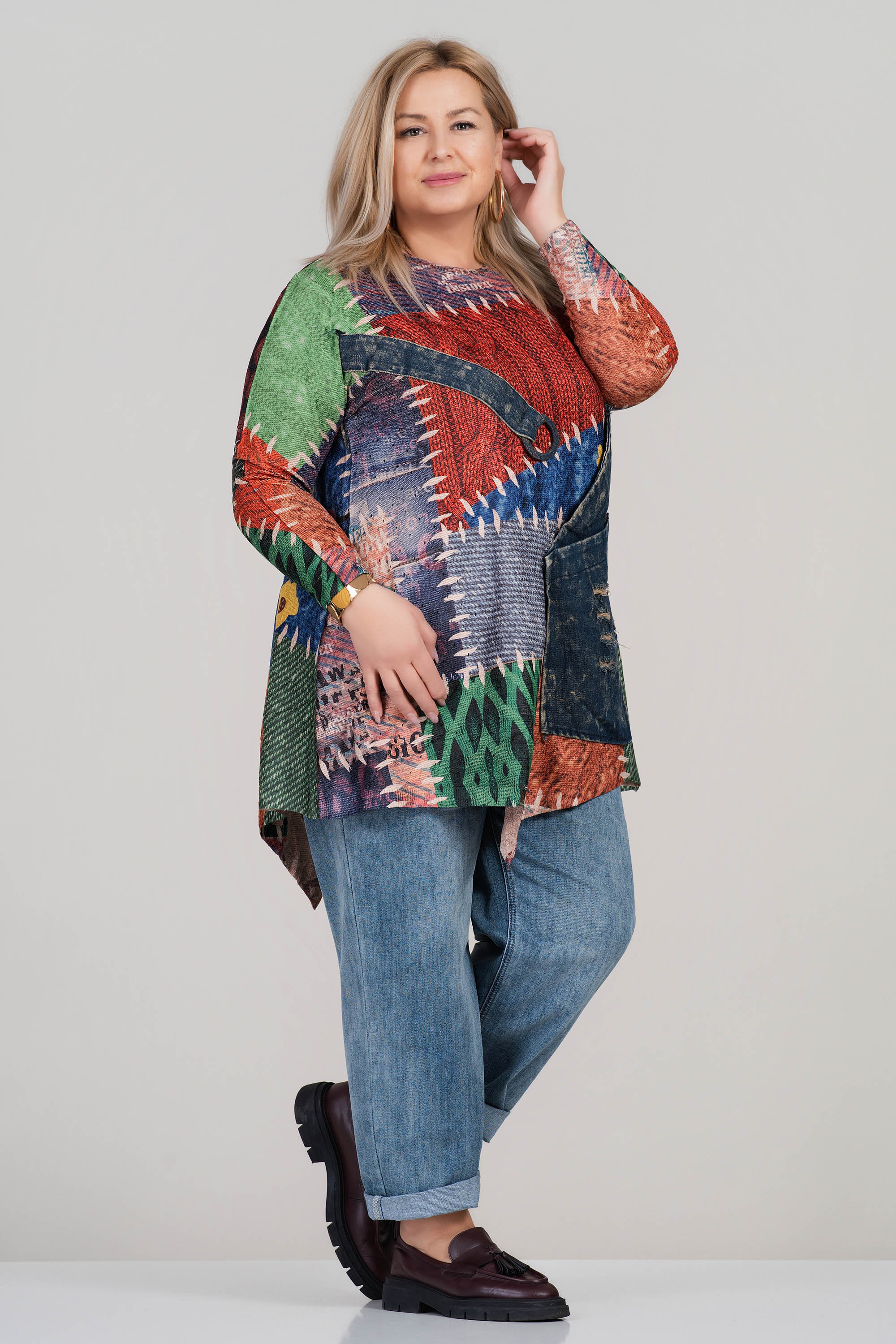 Арт туника с уникален цветен принт, комбиниран с ефектен джоб от деним. Свободната кройка осигурява комфорт през целия ден, докато обло деколте и асиметричната линия придават интересна визия. Подходяща за ежедневието или неформални поводи с модерен акцент.