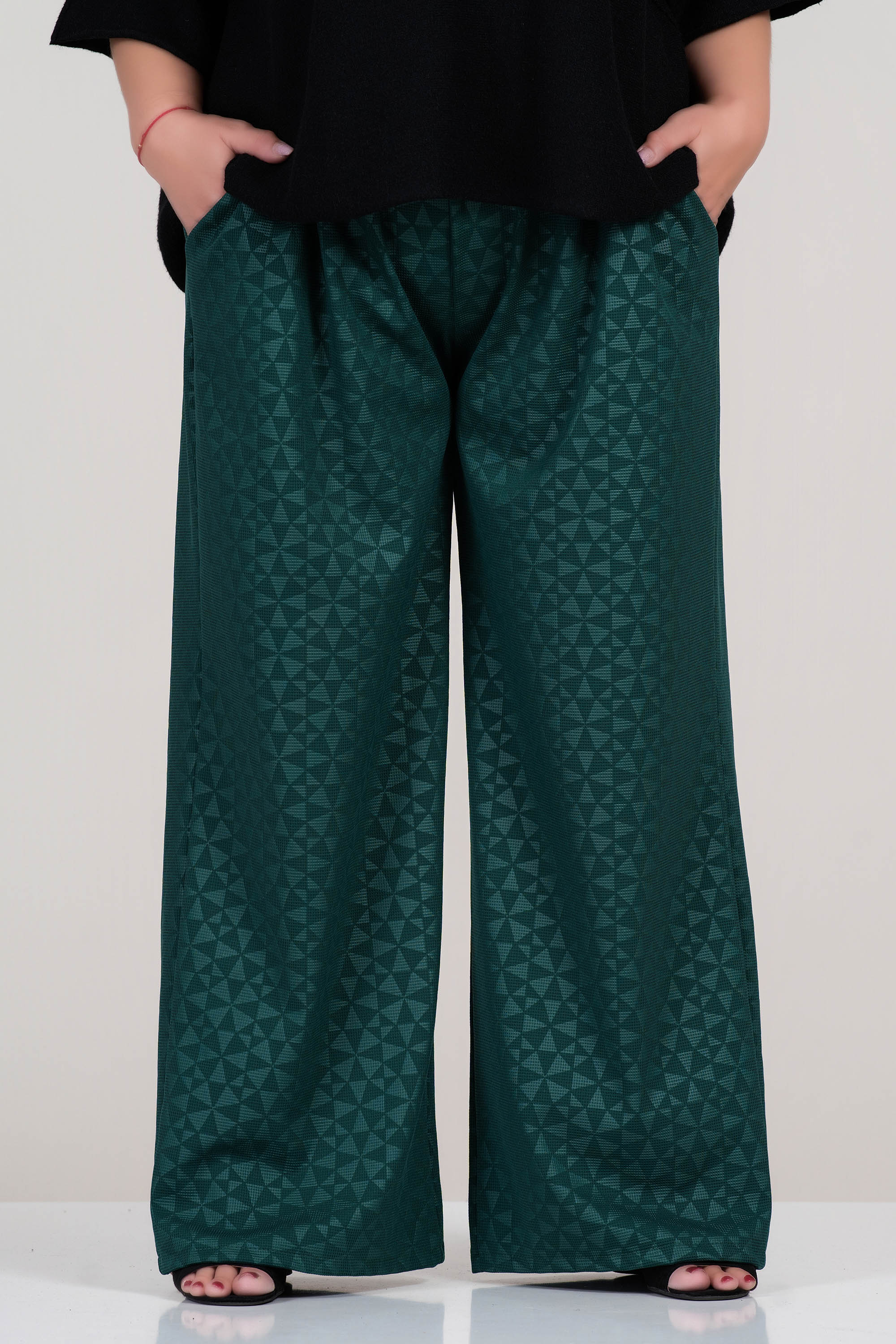 Този макси панталон е създаден за комфорт и стил в ежедневието. Изработен е от висококачествена вискоза с еластан, осигуряваща мекота и свобода на движение. Ластикът на талията гарантира удобно прилягане, а правата кройка с широк крачол подчертава фигурата, без да я очертава. Декоративният геометричен принт придава модерен акцент. Идеален избор за есента и зимата.