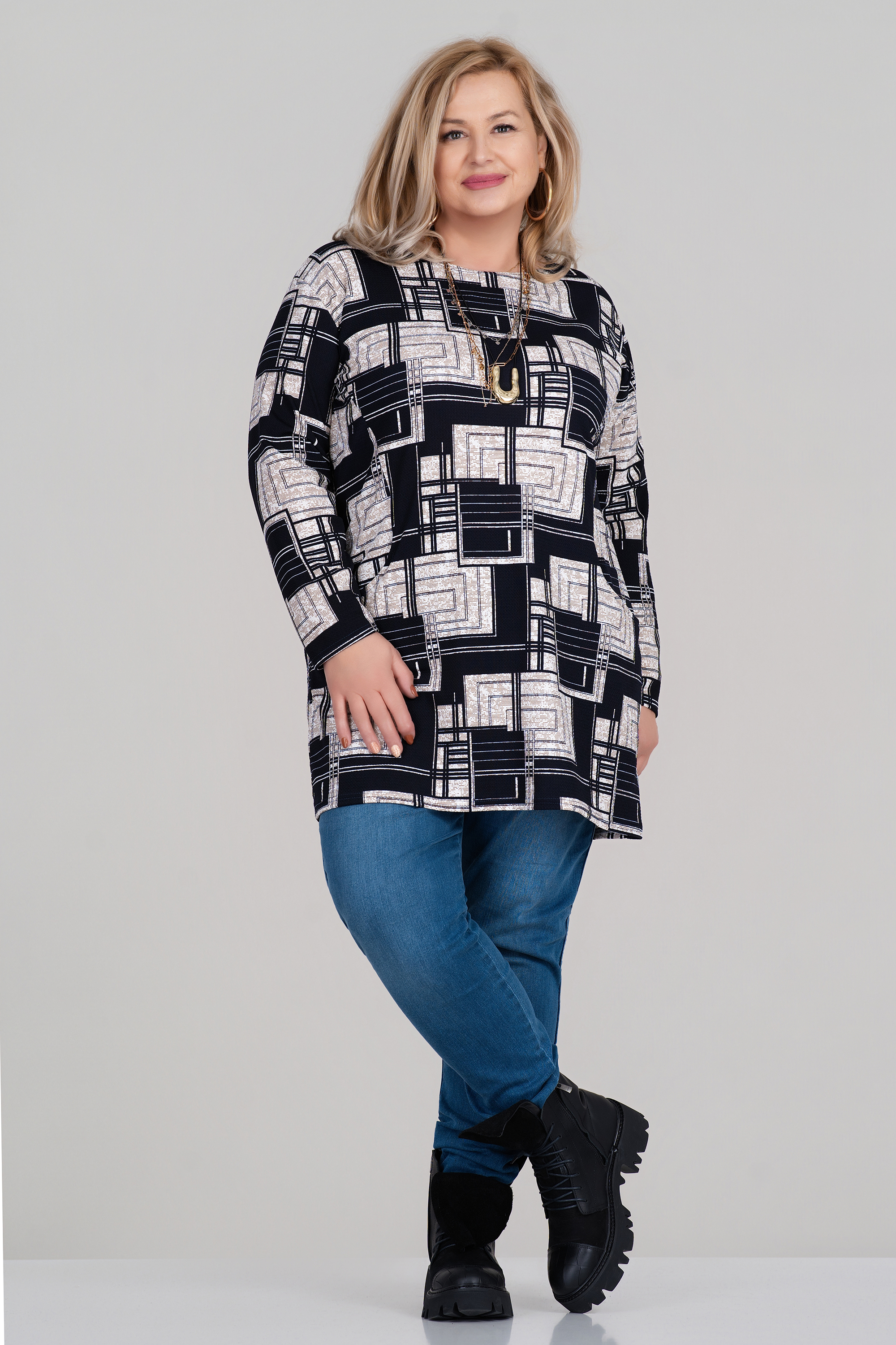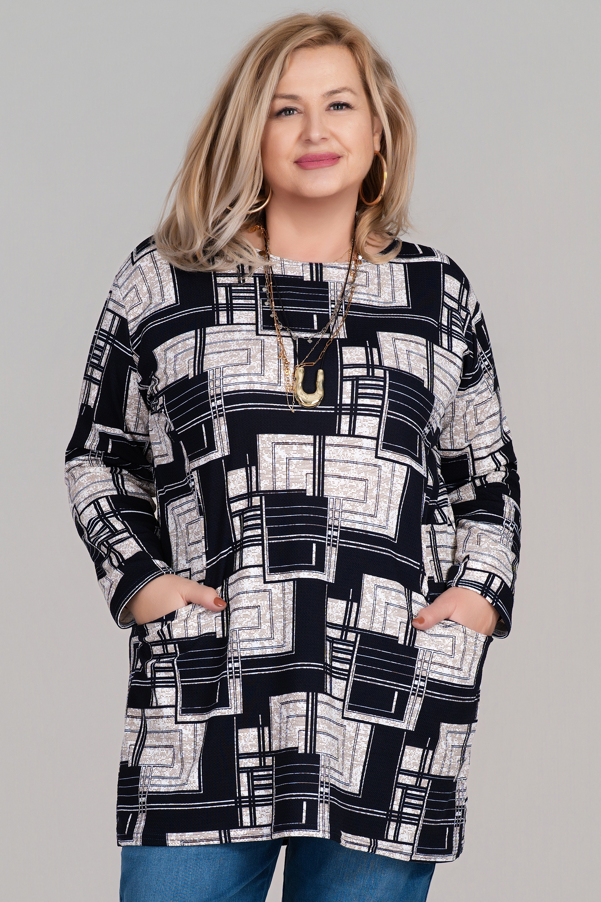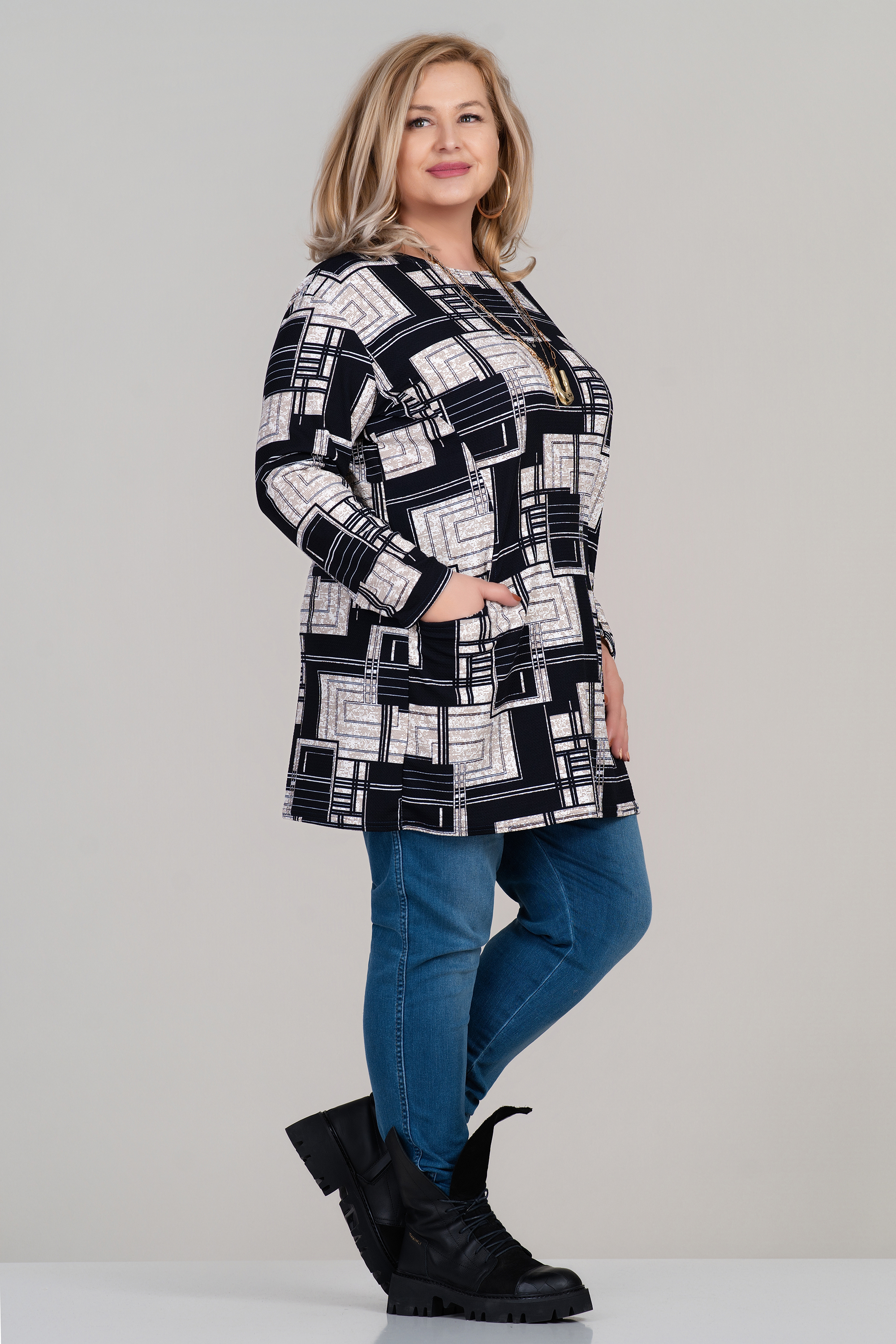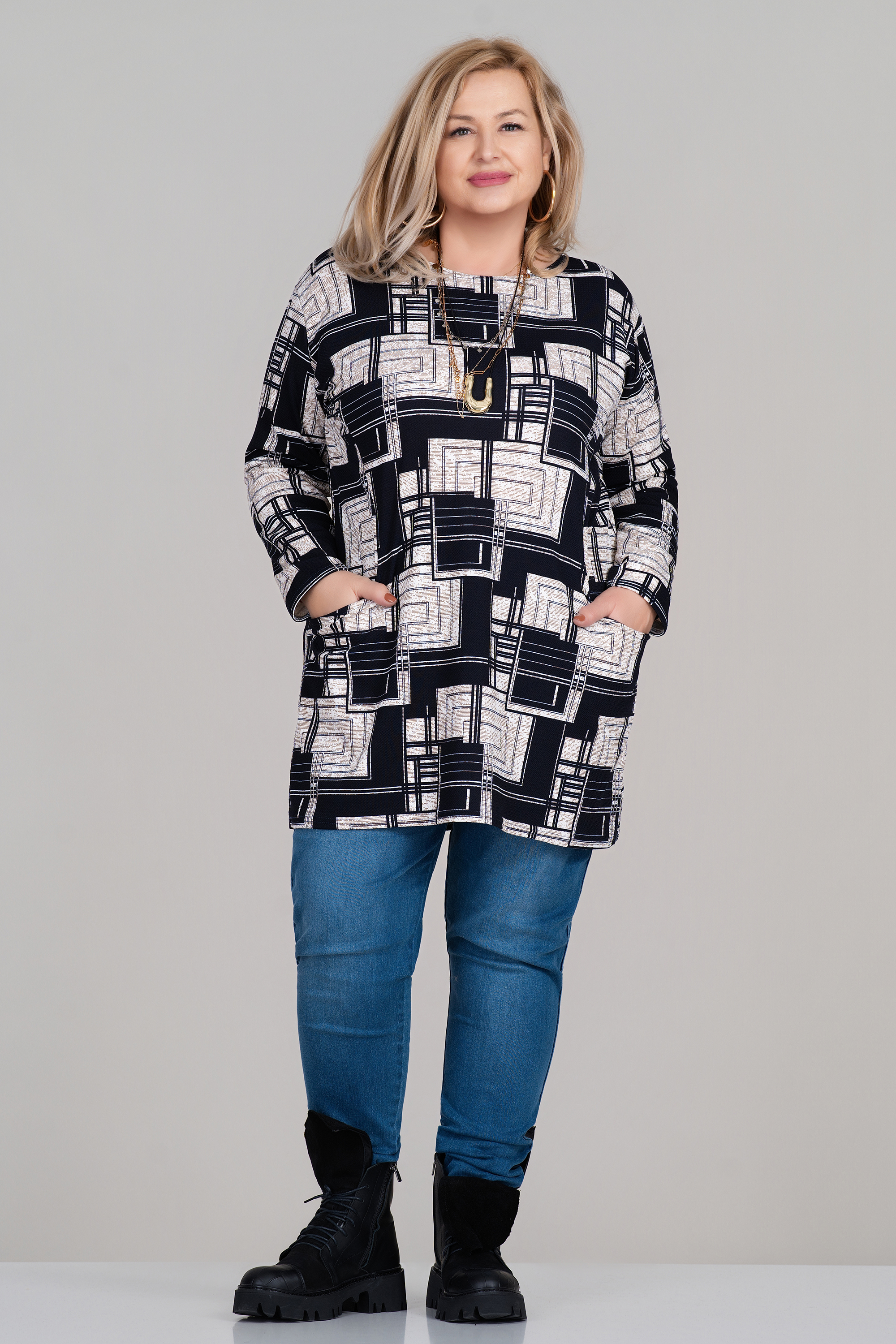 Тази туника впечатлява с модерен геометричен принт, който създава визуален интерес и подчертава силуета. Материята е мека, плътна и подходяща за по-хладните сезони. Двата функционални джоба и 7/8 ръкав добавят практичен елемент към естетичната визия. Перфектна за съчетаване с едноцветен клин или панталон.