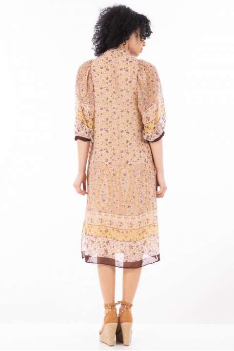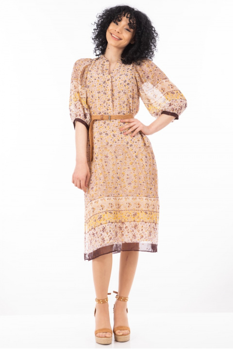 Миди ефирна рокля в розово с етно принт и нишка ламе