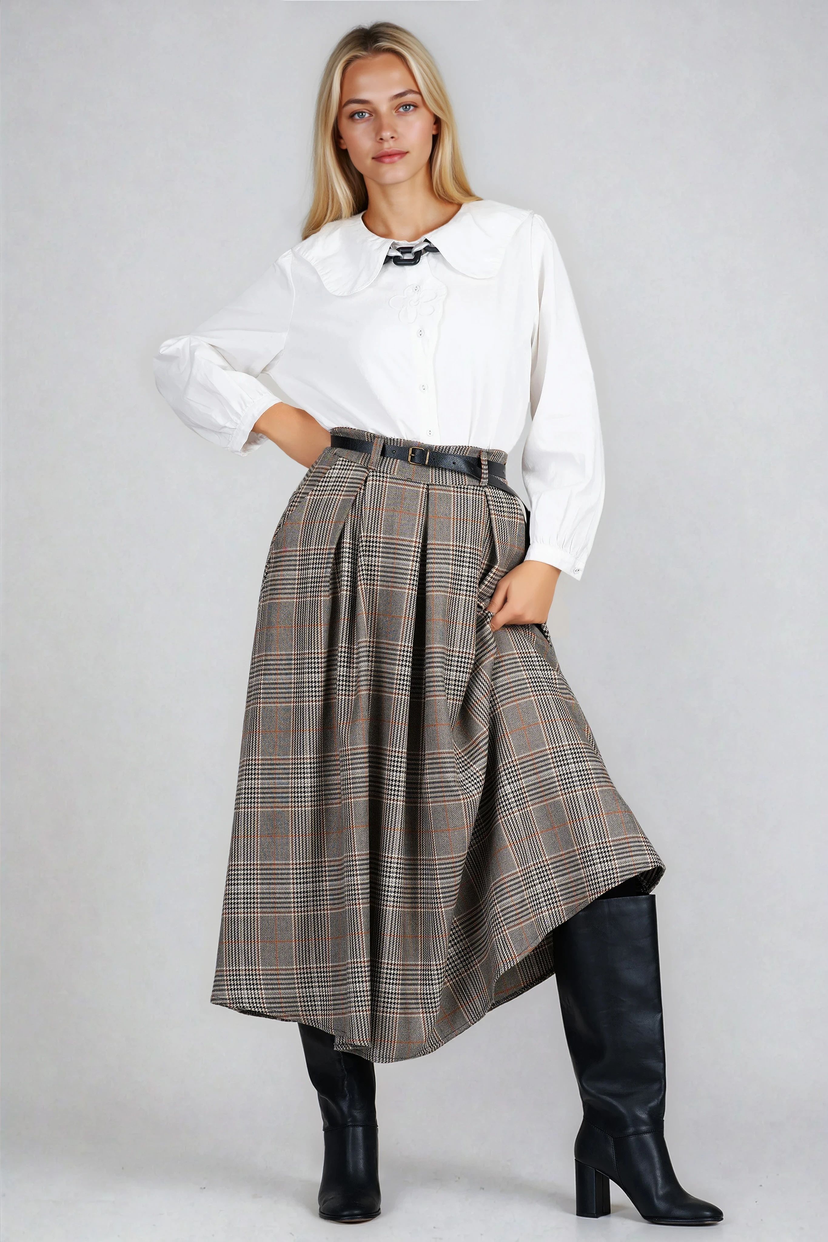 Стилна и удобна, тази пола в класическо сиво каре е перфектен избор за офиса или ежедневието. Материята е с еластичност и осигурява комфорт при движение, а включеният черен колан подчертава талията и придава завършен вид. Подходяща за съчетание с ризи и боти за есенно-зимния сезон.
