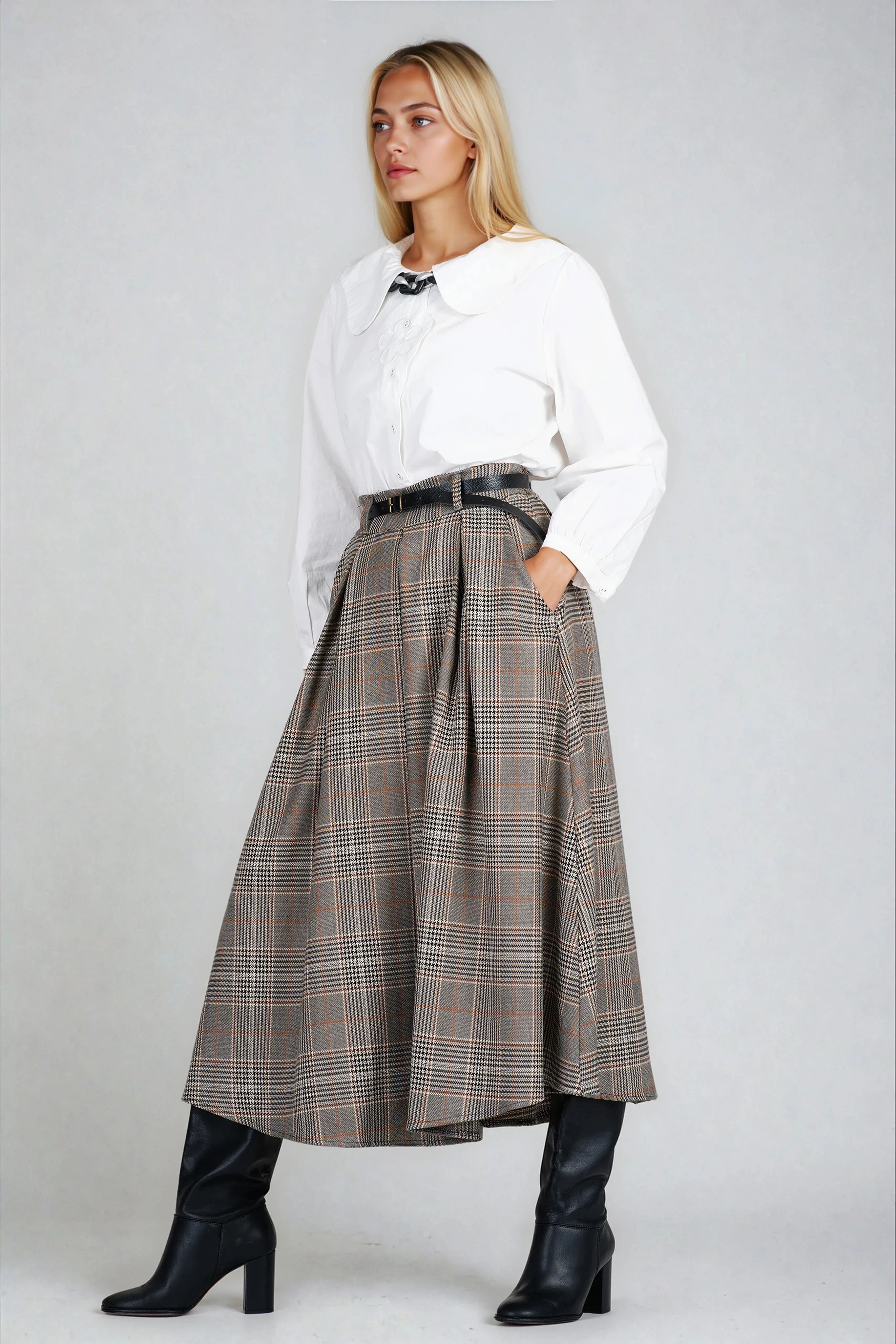 Миди карирана пола в сиво с черен колан