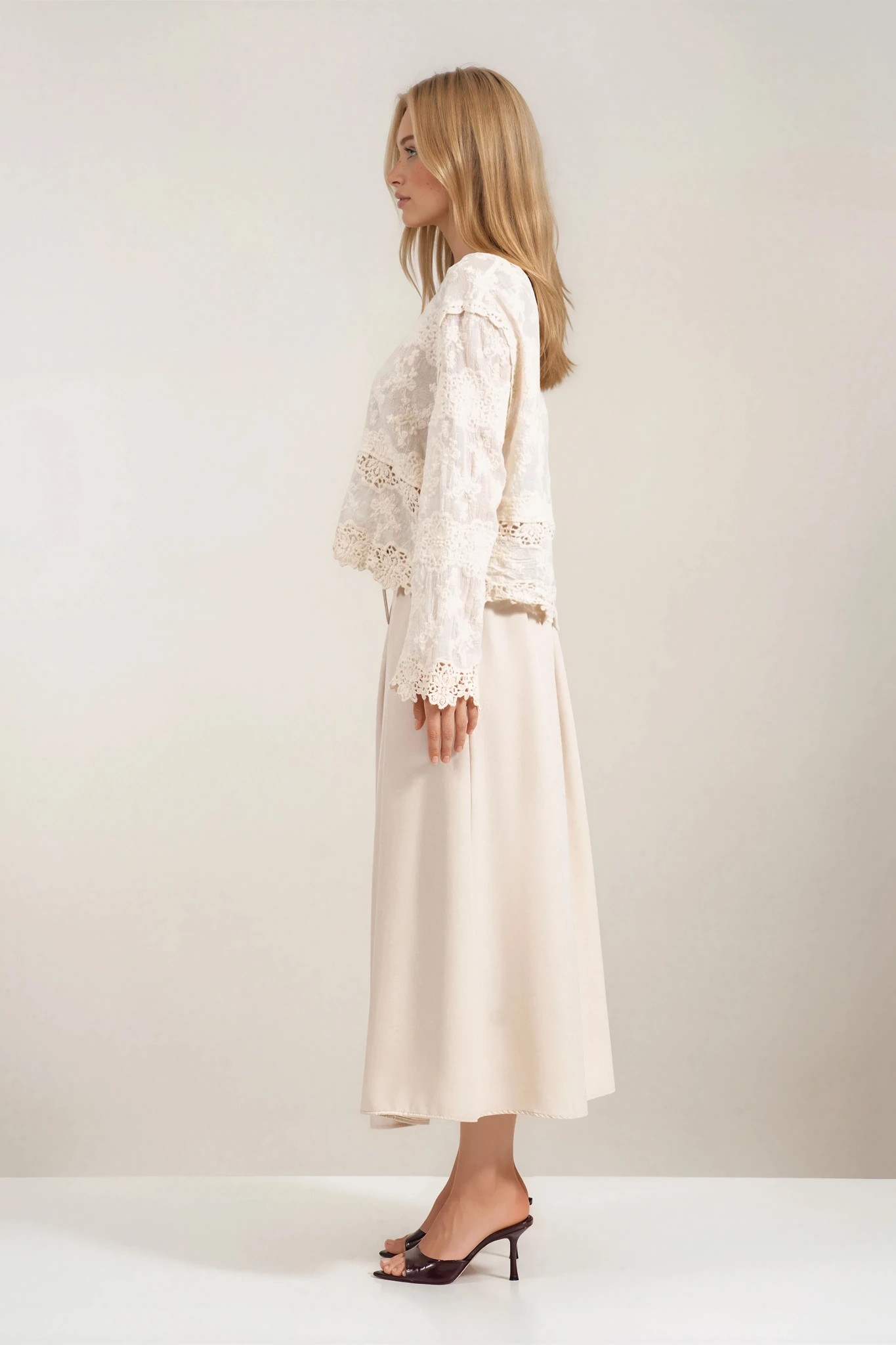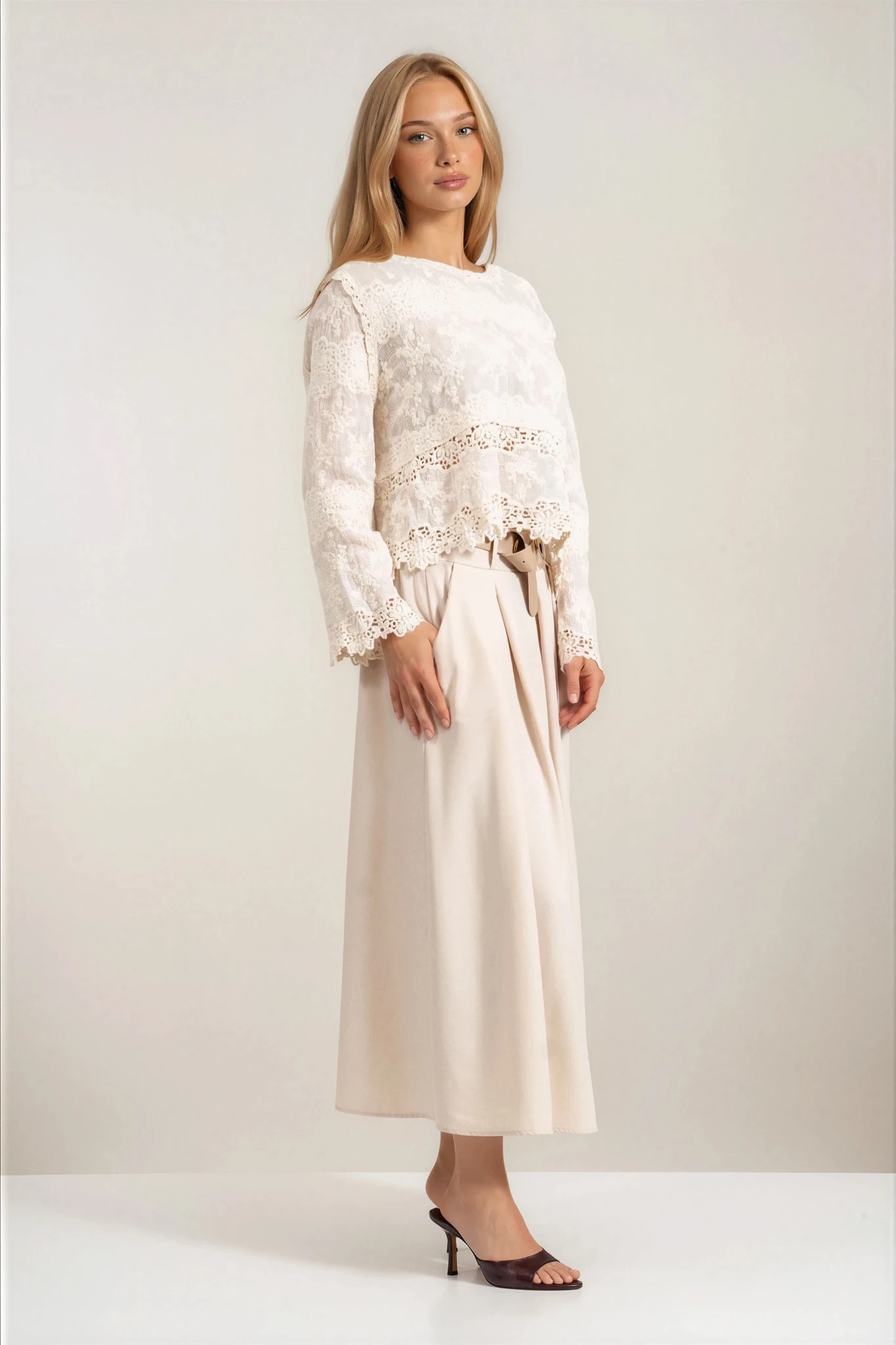 Елегантна пола с висока талия и свободно падащ силует, която подчертава фигурата по изключително женствен начин. Материята е приятна на допир и осигурява комфорт през целия ден. Ластикът в талията гарантира удобно прилягане, а включеният колан добавя стилен акцент. Подходящ избор за ежедневни и елегантни визии през пролетно-летния сезон.