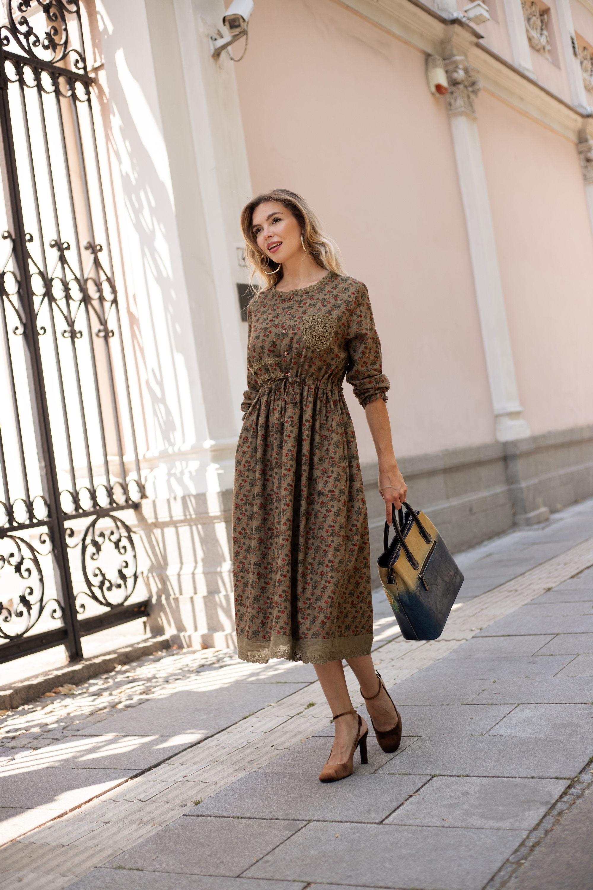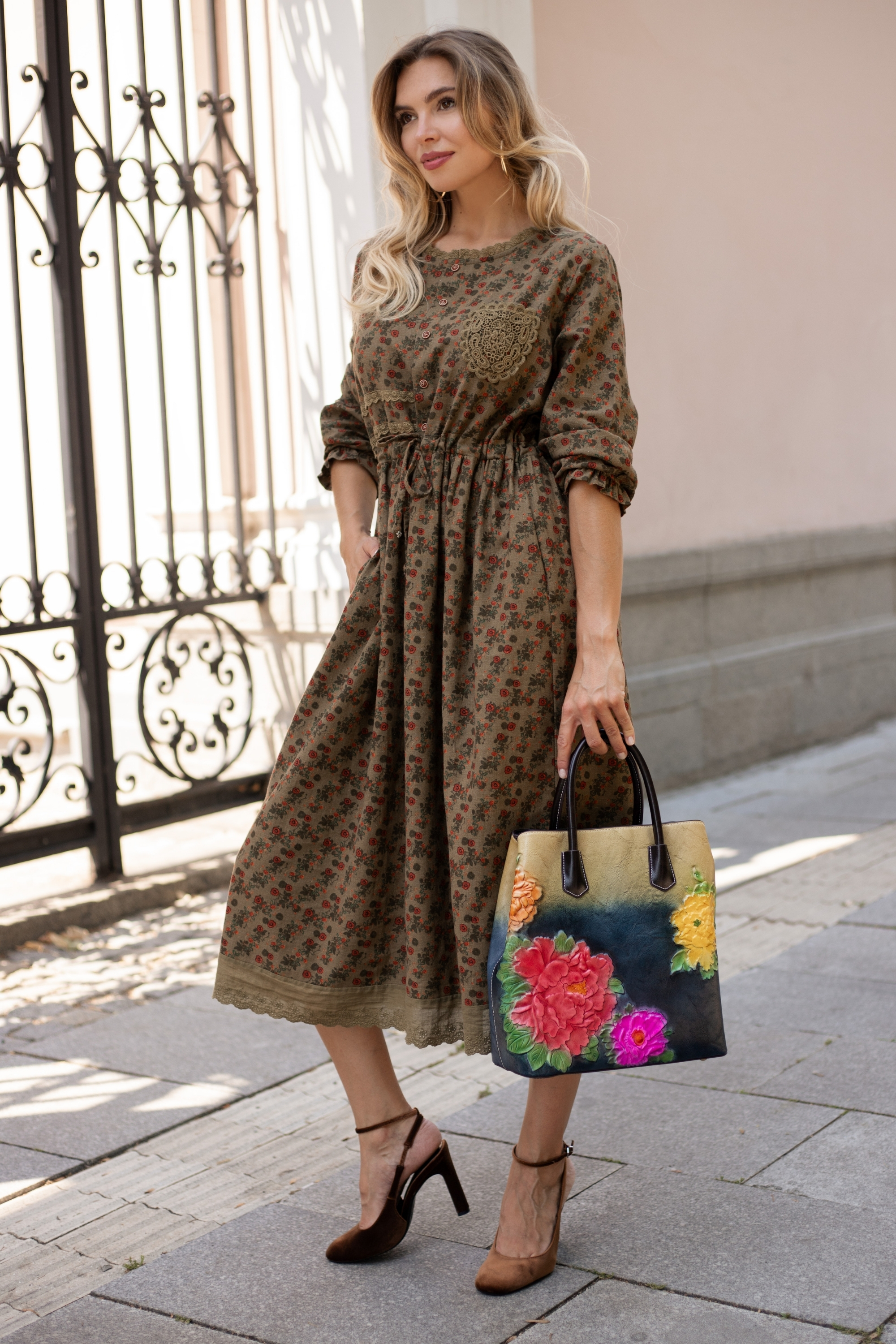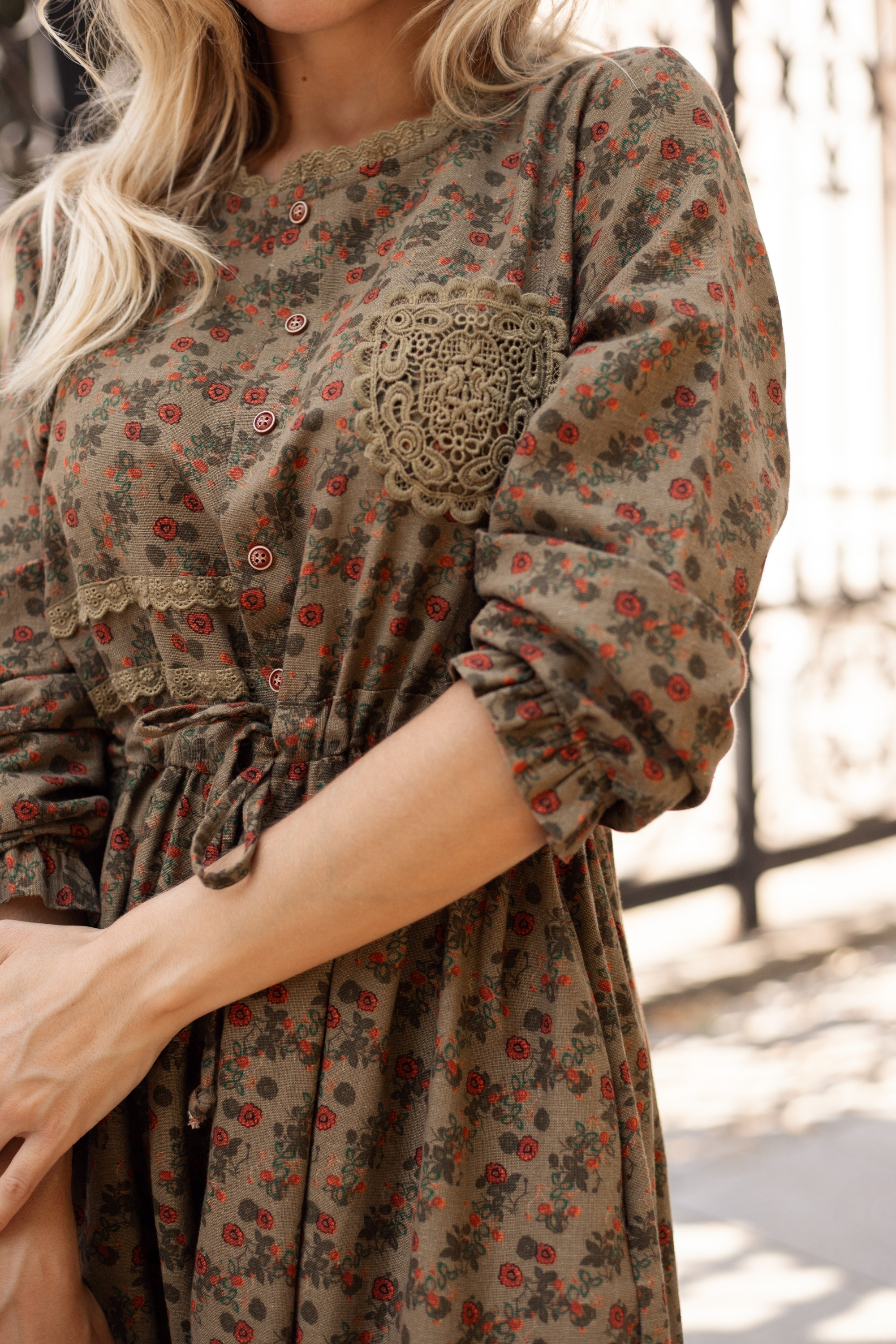 Особености: Обло деколте, малък джоб с дантела, връзки в талията, флорален принт