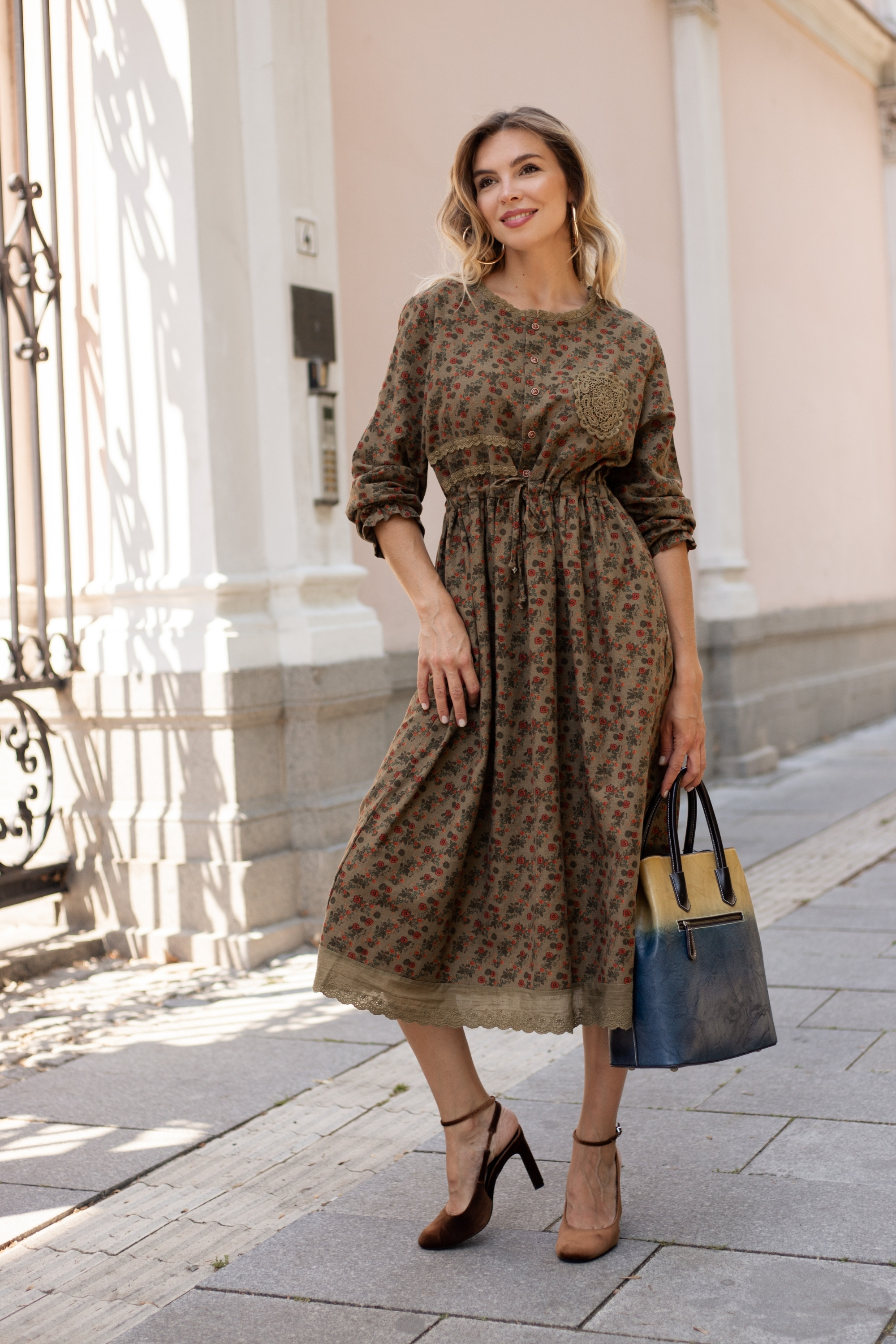 Миди рокля от памук в цвят милитъри с малък джоб с бродерия и ситен флорален принт