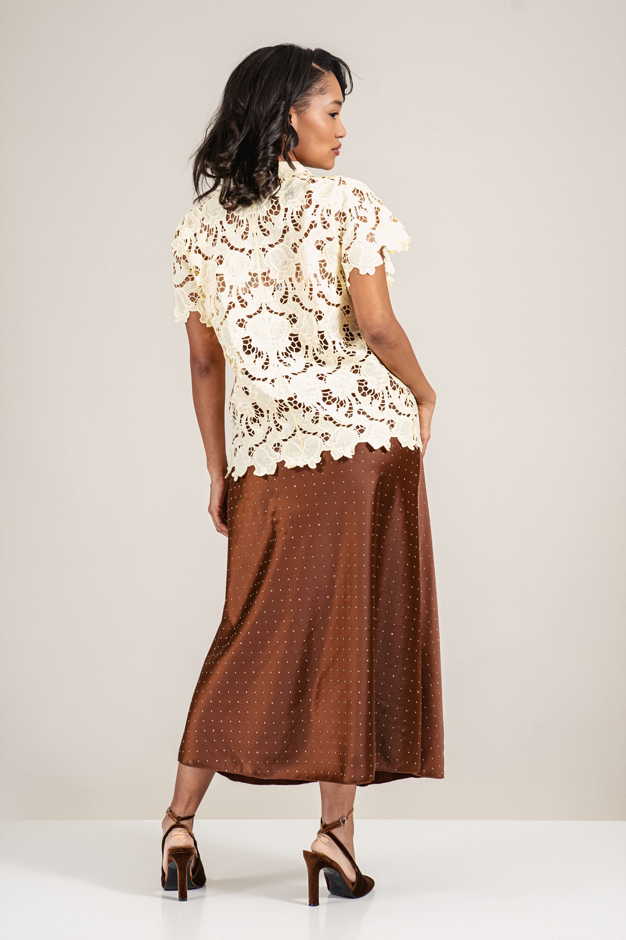 Елегантен модел с издължена линия и женствен силует. Материята запазва формата си и предлага комфорт през целия ден благодарение на добавената еластичност. Кафявият цвят е лесен за комбиниране, а ситните камъни създават деликатен светлинен ефект без излишна натовареност. Полата се съчетава отлично с ботуши, токчета или изчистени обувки за завършена и балансирана визия.