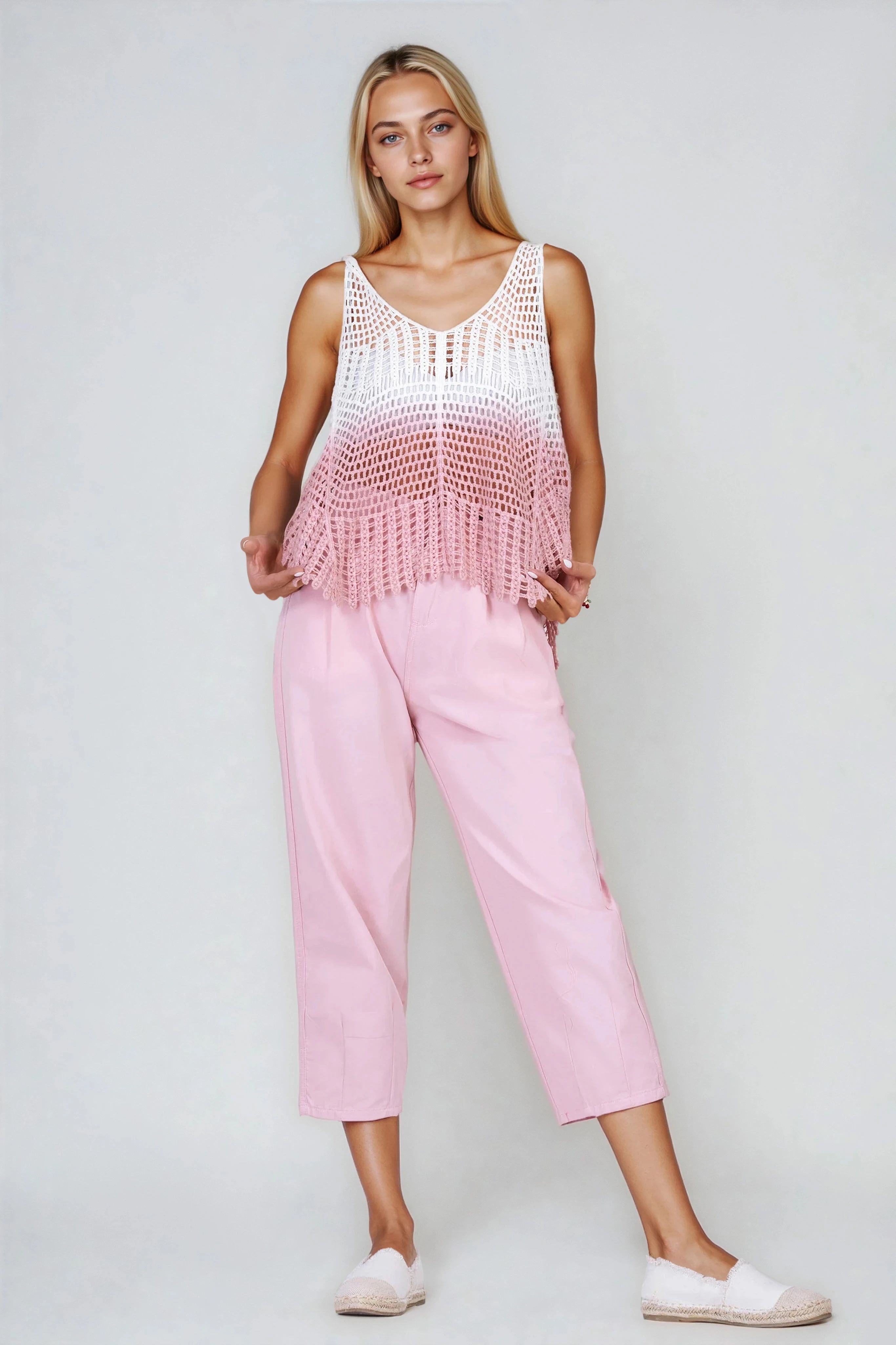 Съчетавайки артистичност и комфорт, този потник е изработен от ръчно изглеждаща памучна плетка с омбре ефект. Моделът е с остро деколте и свободна линия, подходяща за носене върху бански или с ленени панталони. Кафявият нюанс в долната част придава натурална и стилна завършеност.