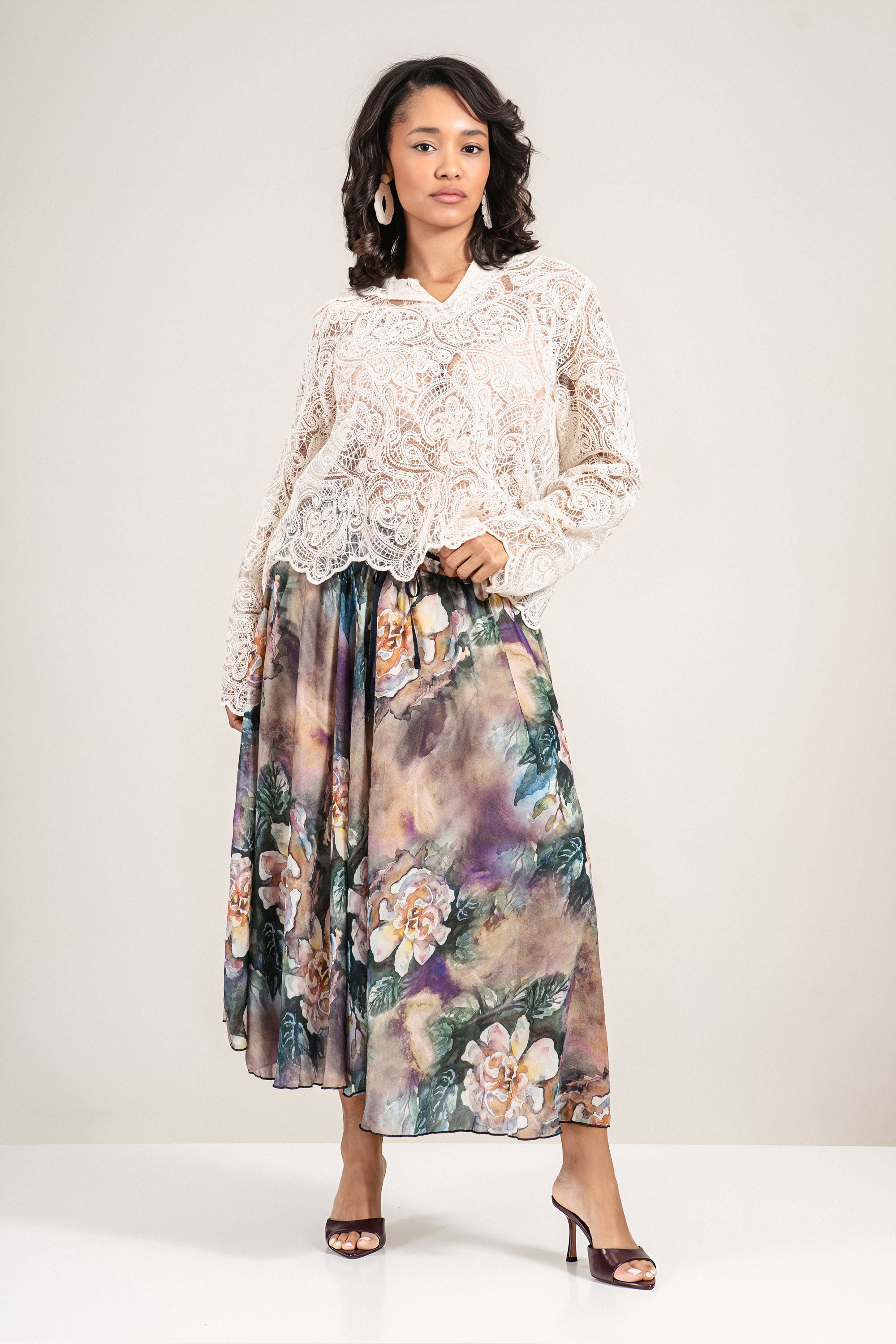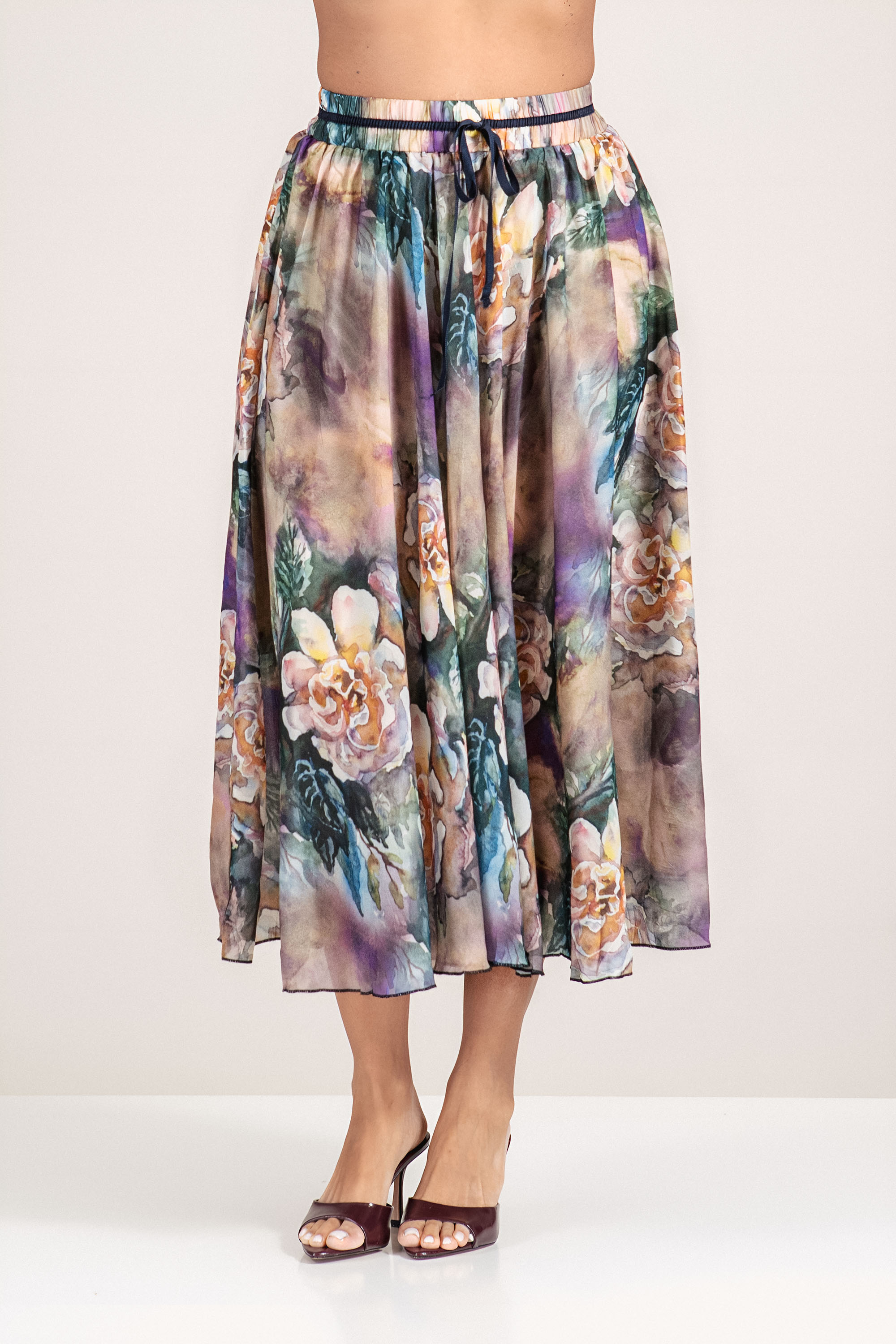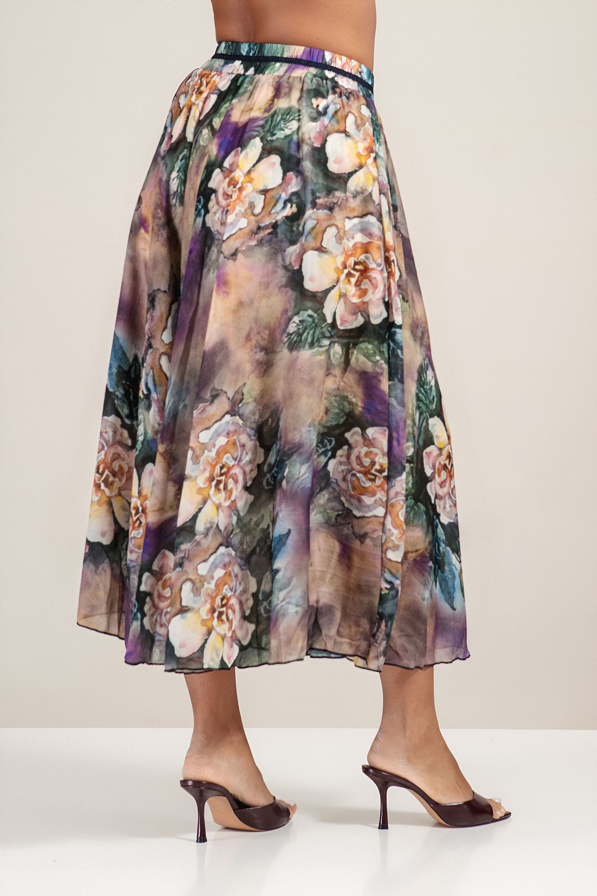 Пола с акварелен флорален принт в лилаво, зелено, бежово и жълто