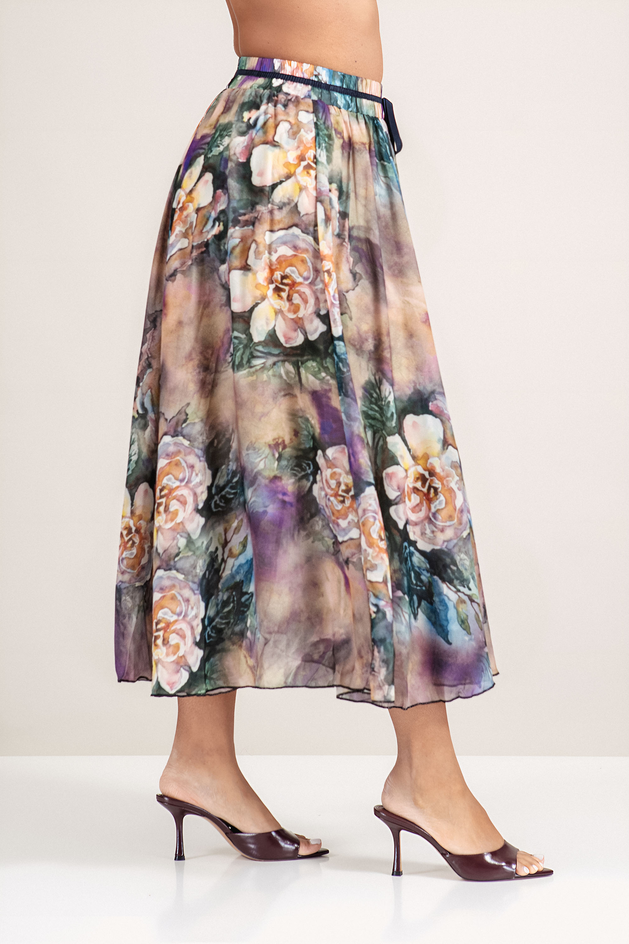 Лека и ефирна пола с флорален принт в лилаво, зелено, бежово и жълто. Моделът е с удобен ластик и тъмна връзка на талията, което осигурява гъвкаво прилягане и стилен акцент. Прозрачният външен слой създава движение и елегантност при всяка стъпка. Идеална за пролетно-летните месеци, както за ежедневието, така и за по-специални поводи.