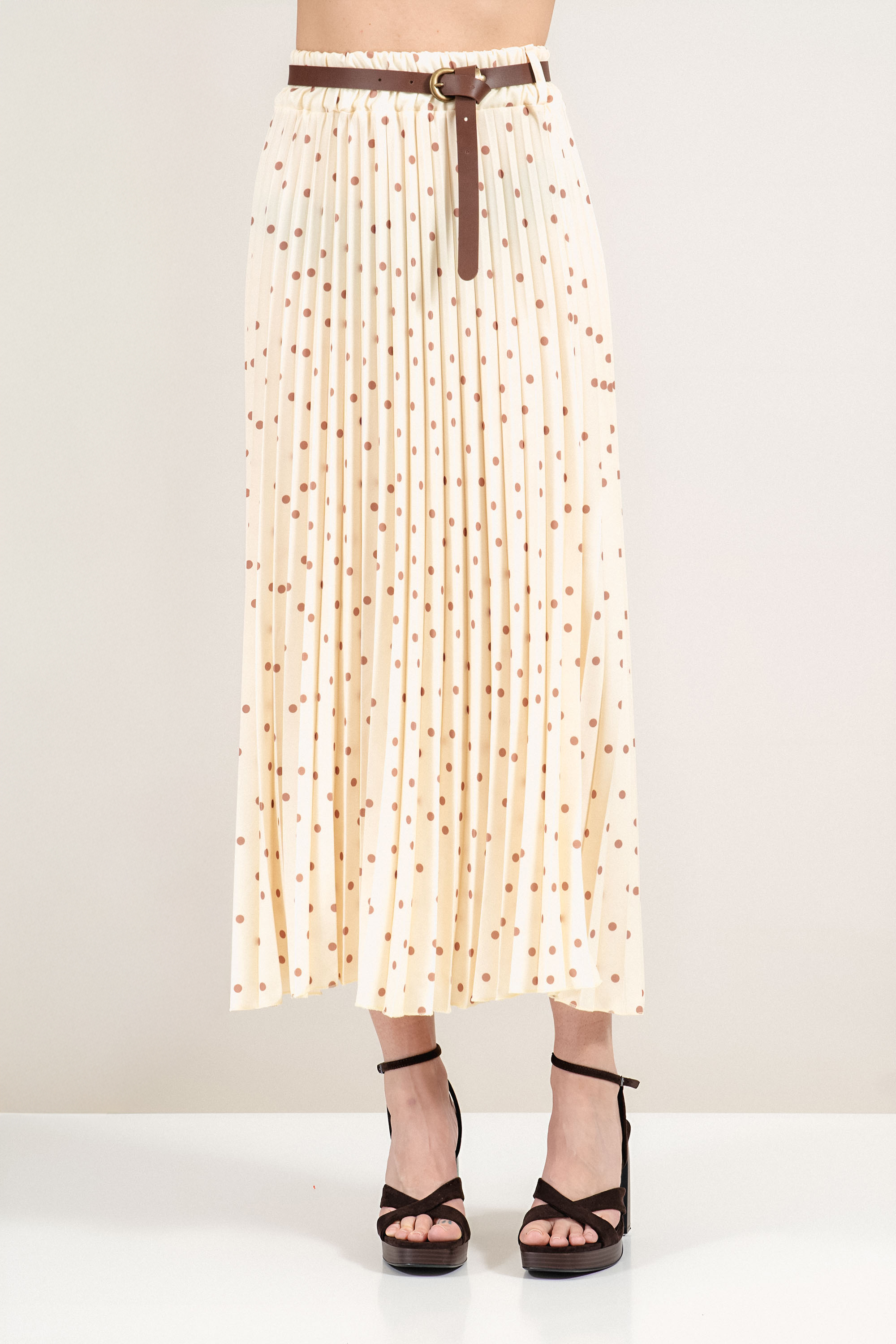 Елегантна пола в класически кафяв нюанс с фин принт на сини точки, която придава характер на всяка визия. Плисираният ефект създава динамика в силуета и красиво движение при ходене. Еластичната талия с колан осигурява комфортно прилягане и подчертава линията на талията. Подходящ модел както за офис среда, така и за ежедневни комбинации през пролетно-есенния сезон.