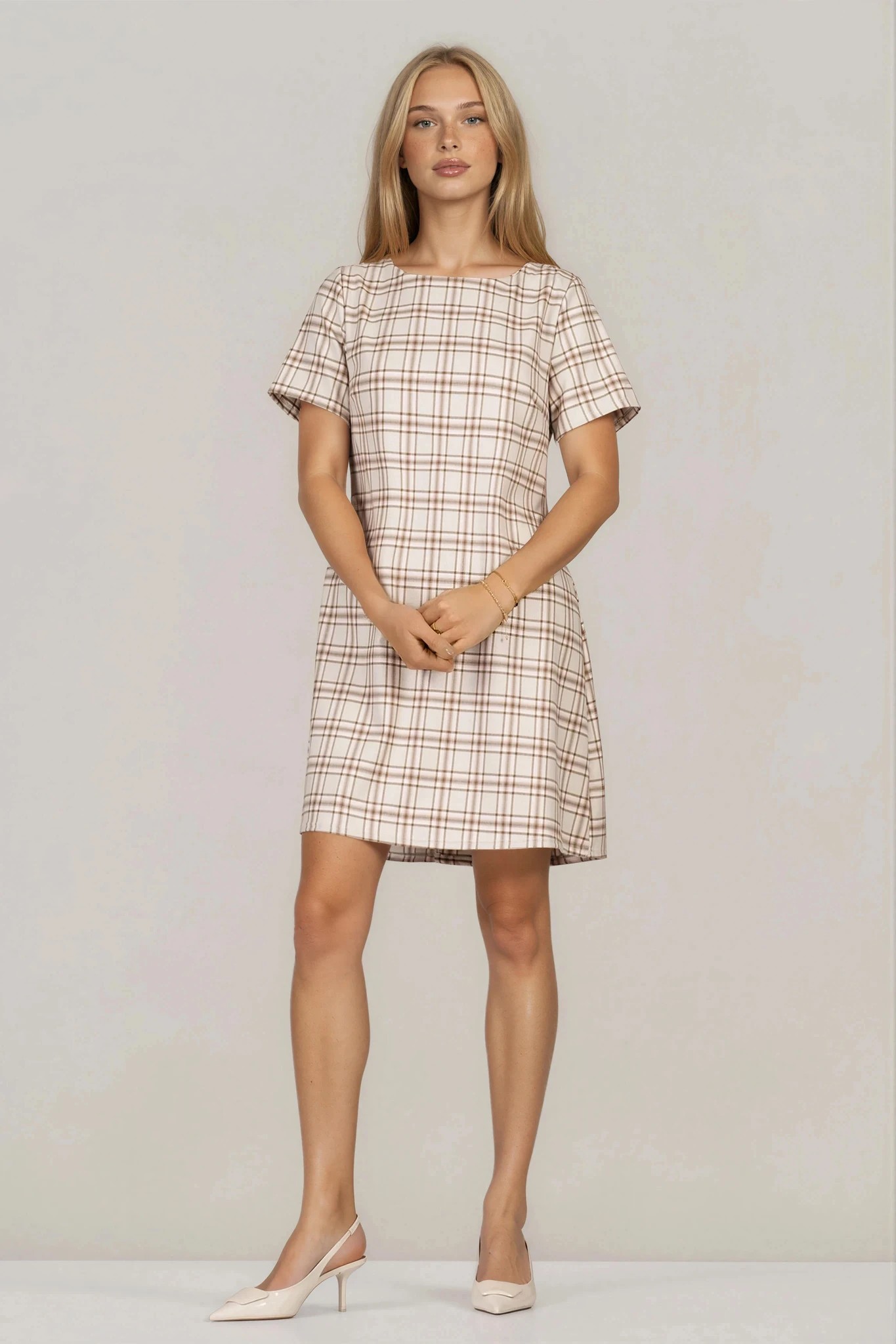 Елегантна рокля с класически кариран десен в бежови и кафяви нюанси, която съчетава изчистена линия и модерна визия. Материята е гладка, лека и с лека еластичност, което осигурява комфорт и добро прилягане към силуета. Моделът е с обло деколте и къс ръкав, а панелката на гърба допринася за по-добра форма и свобода на движение. Подходяща е както за ежедневни градски визии, така и за елегантна офис комбинация през пролетно-летния сезон.