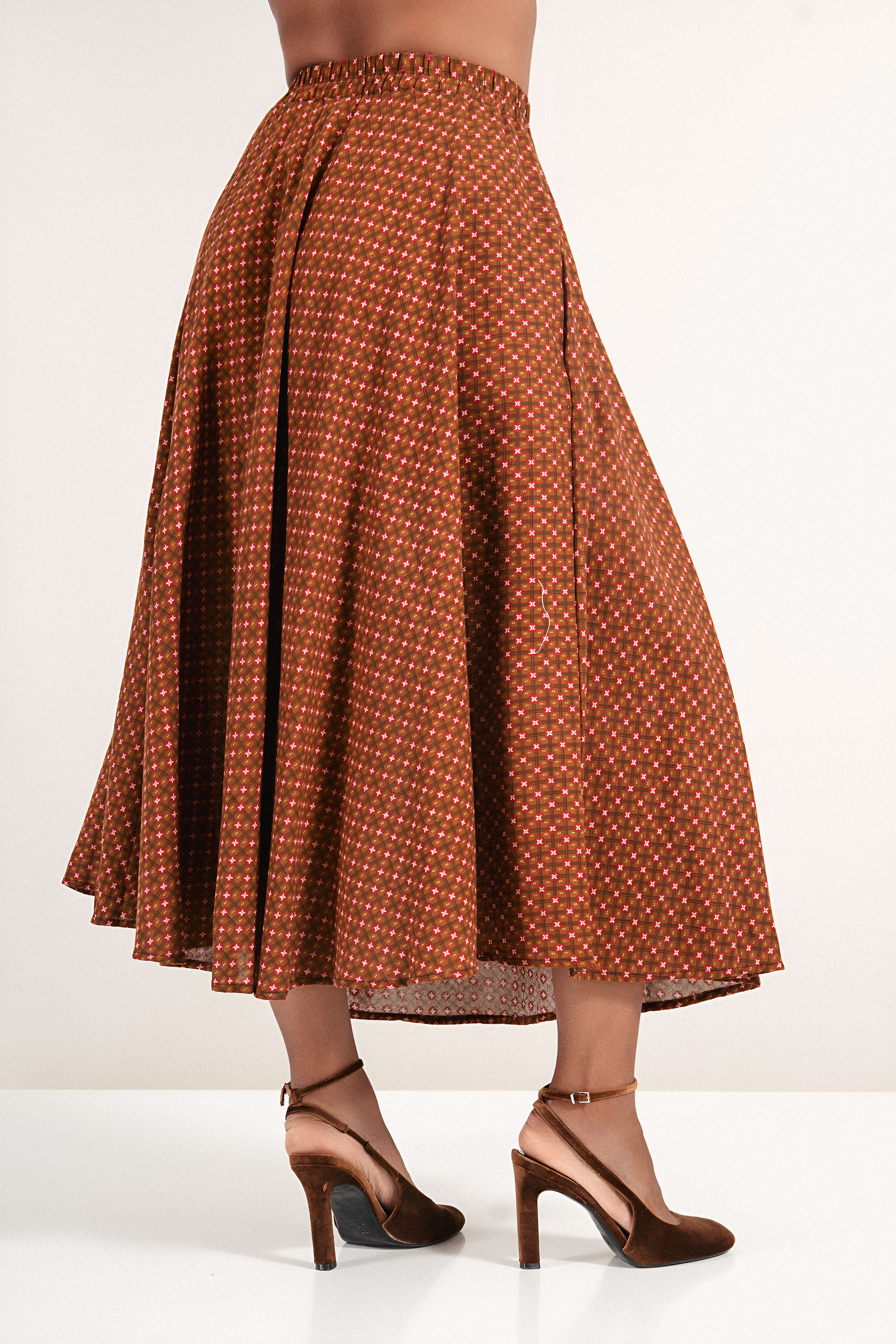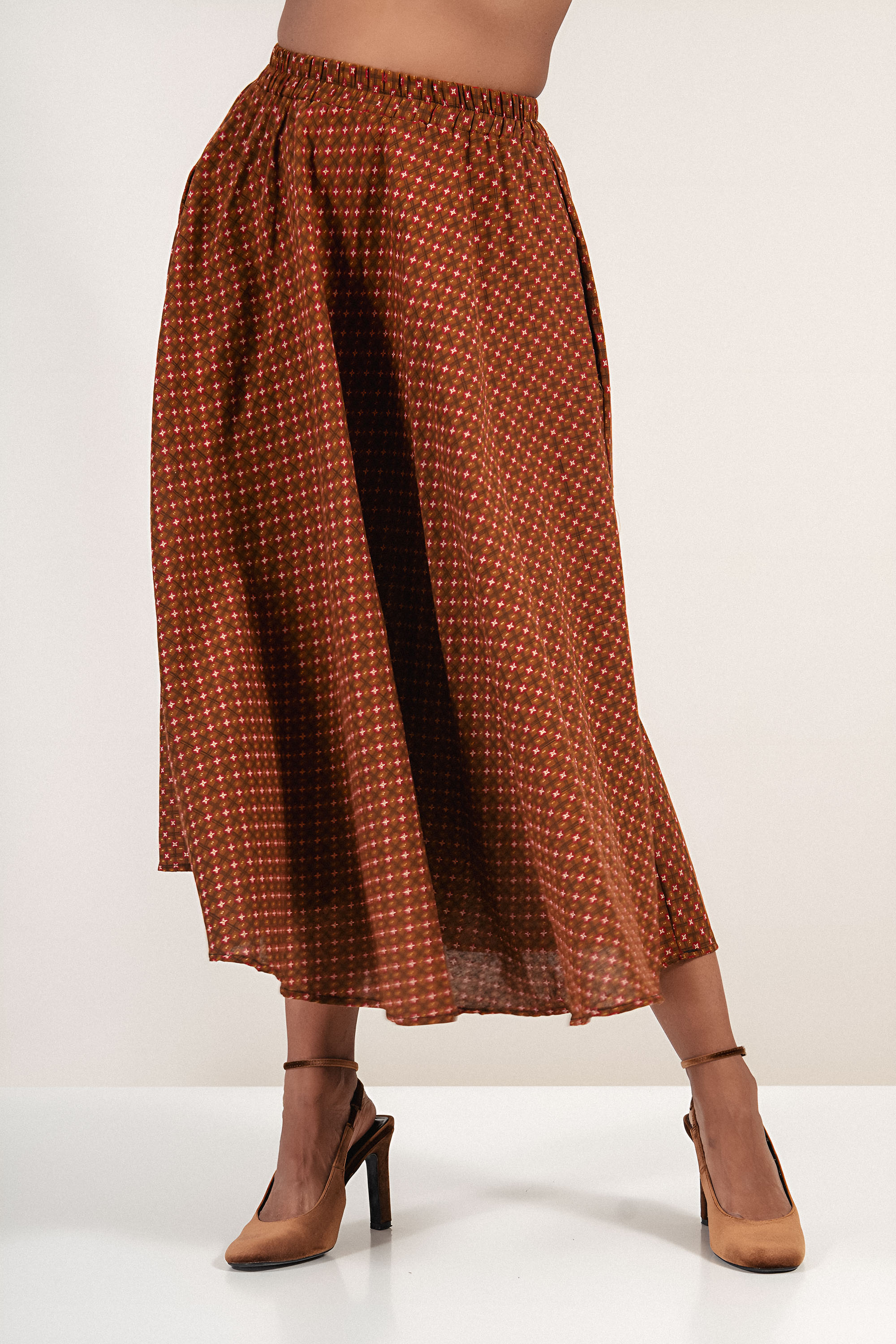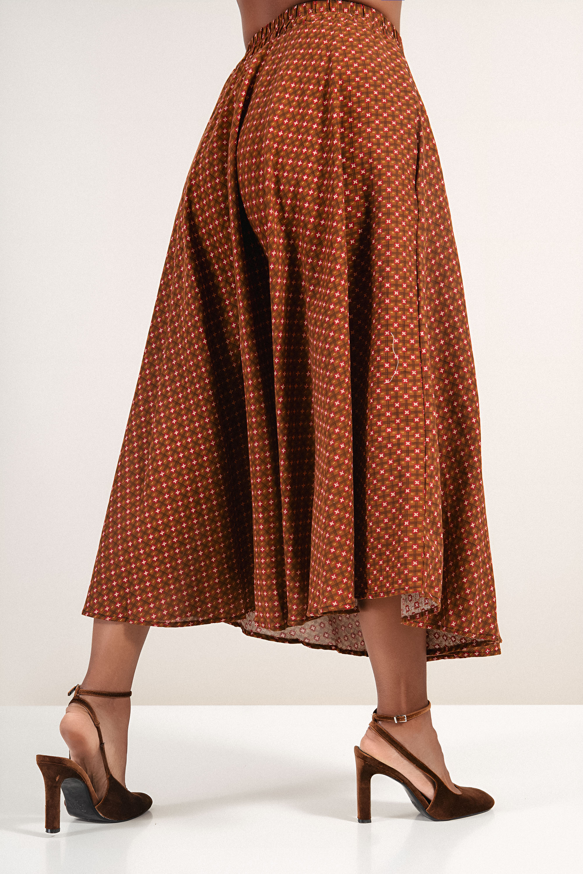 Тази пола с геометричен принт и еластична талия съчетава удобство и визия с винтидж нотка. Цветовата комбинация от червено и охра придава характер и подчертава женствеността. Идеална за съчетаване с едноцветни ризи или топове през преходните сезони.