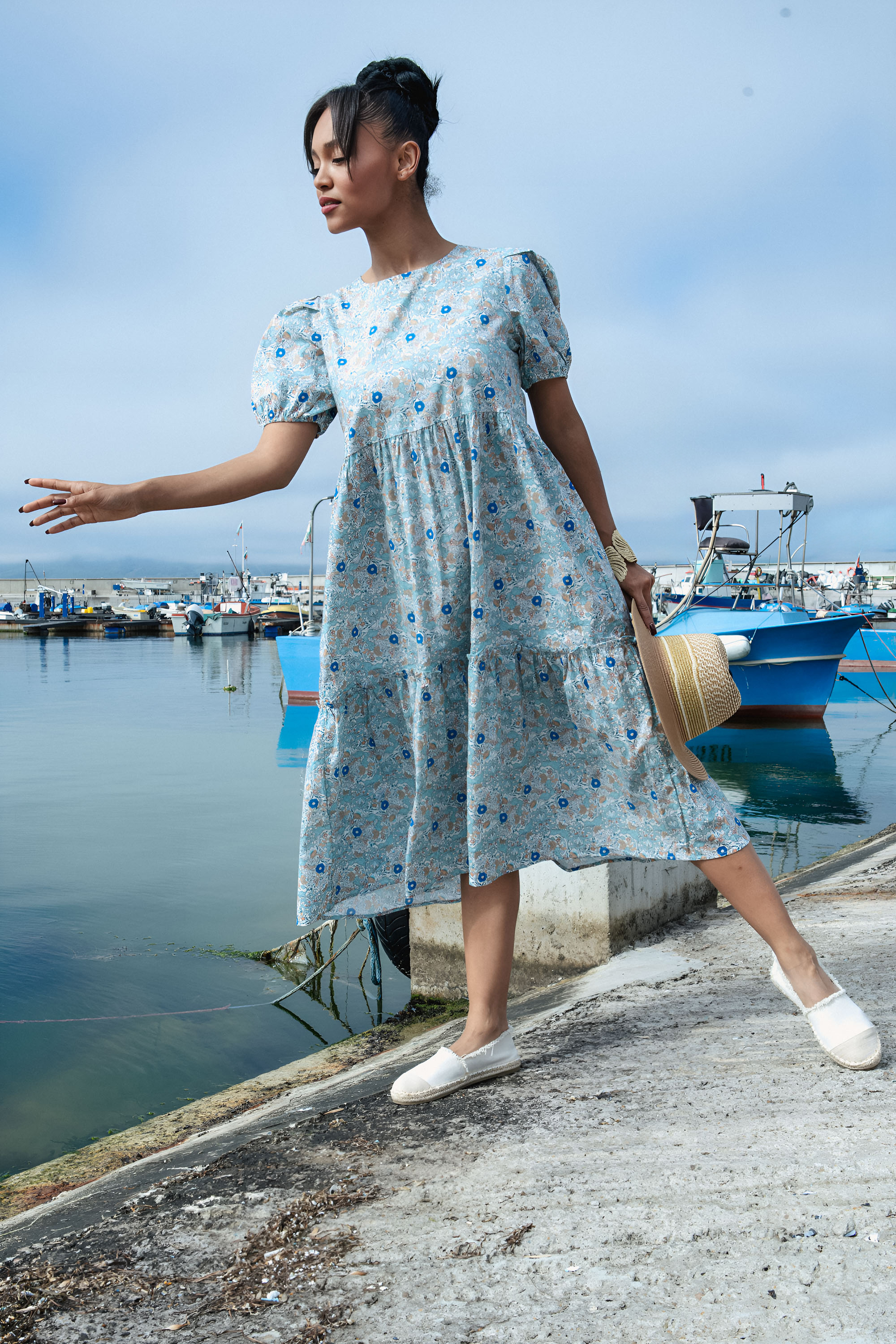 Особености: Обло деколте, къс буфан ръкав, колан, принт сини и бели цветя