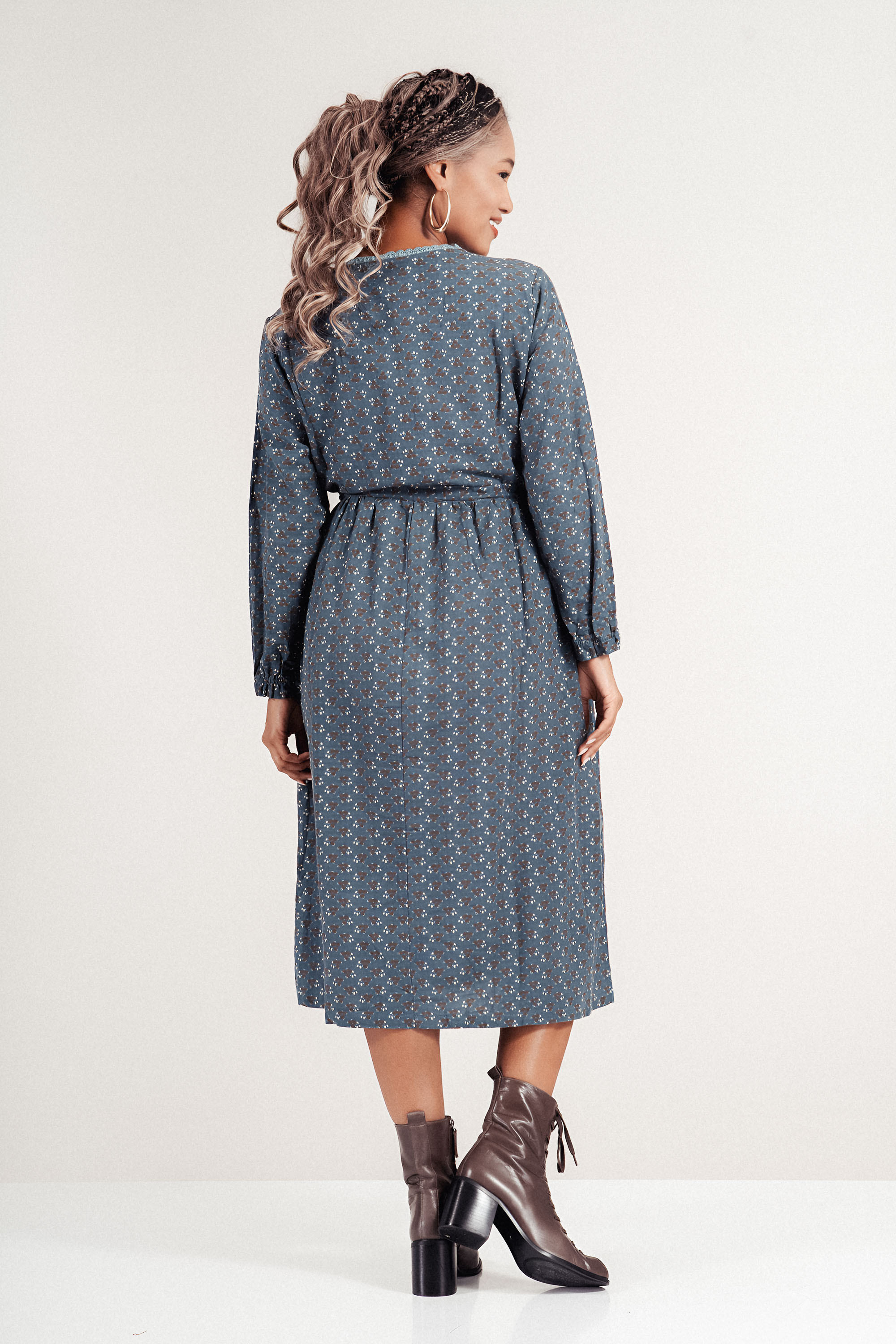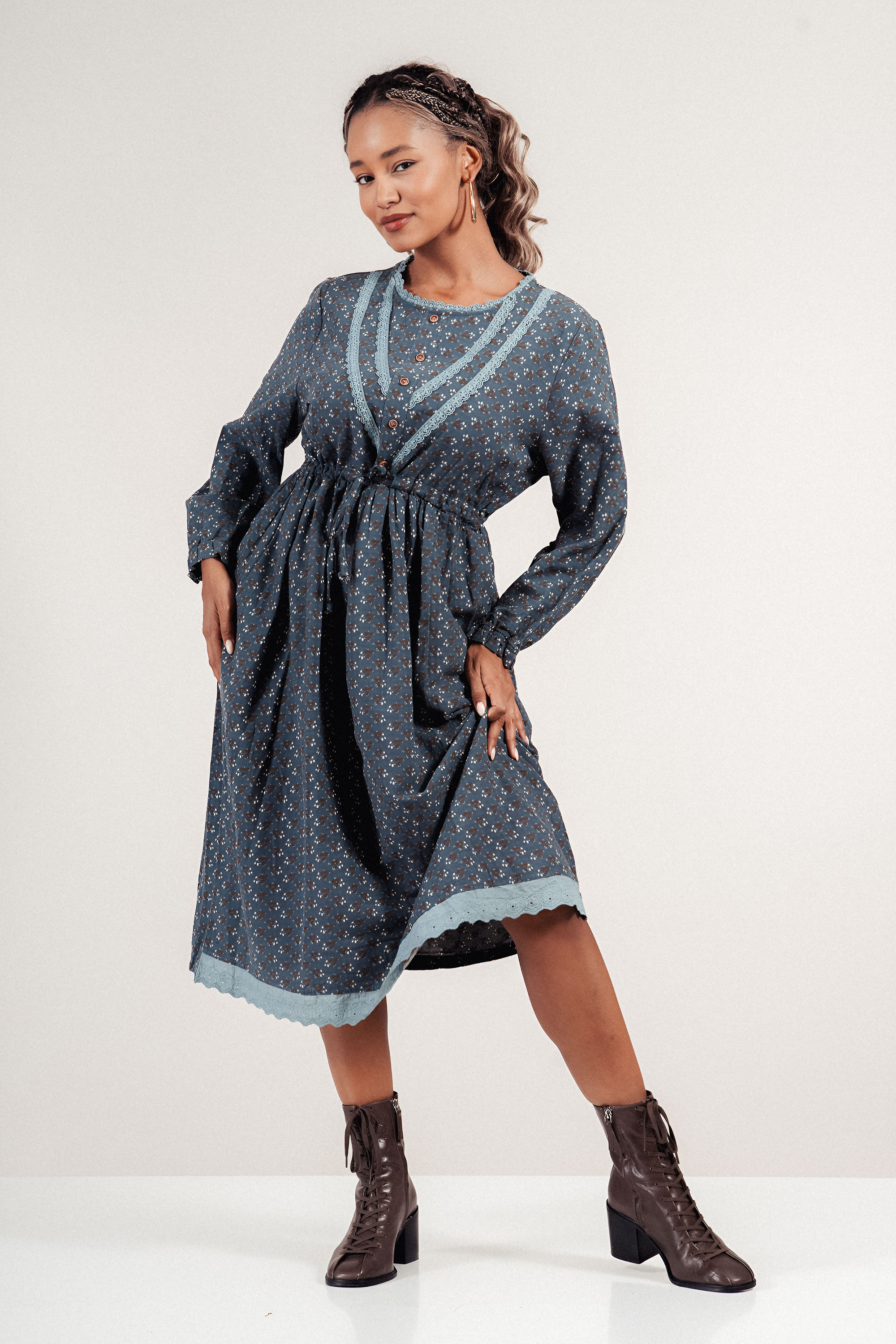 Дълга рокля в петролен нюанс, изработена от фин памук с деликатна текстура. Моделът впечатлява с обло деколте, украсено с декоративна бродерия и фина дантела. Връзките на талията позволяват регулиране на силуета, а свободната кройка осигурява комфорт и елегантно падане. Подходяща за преходните сезони, роклята съчетава бохемски чар и непринуден стил.