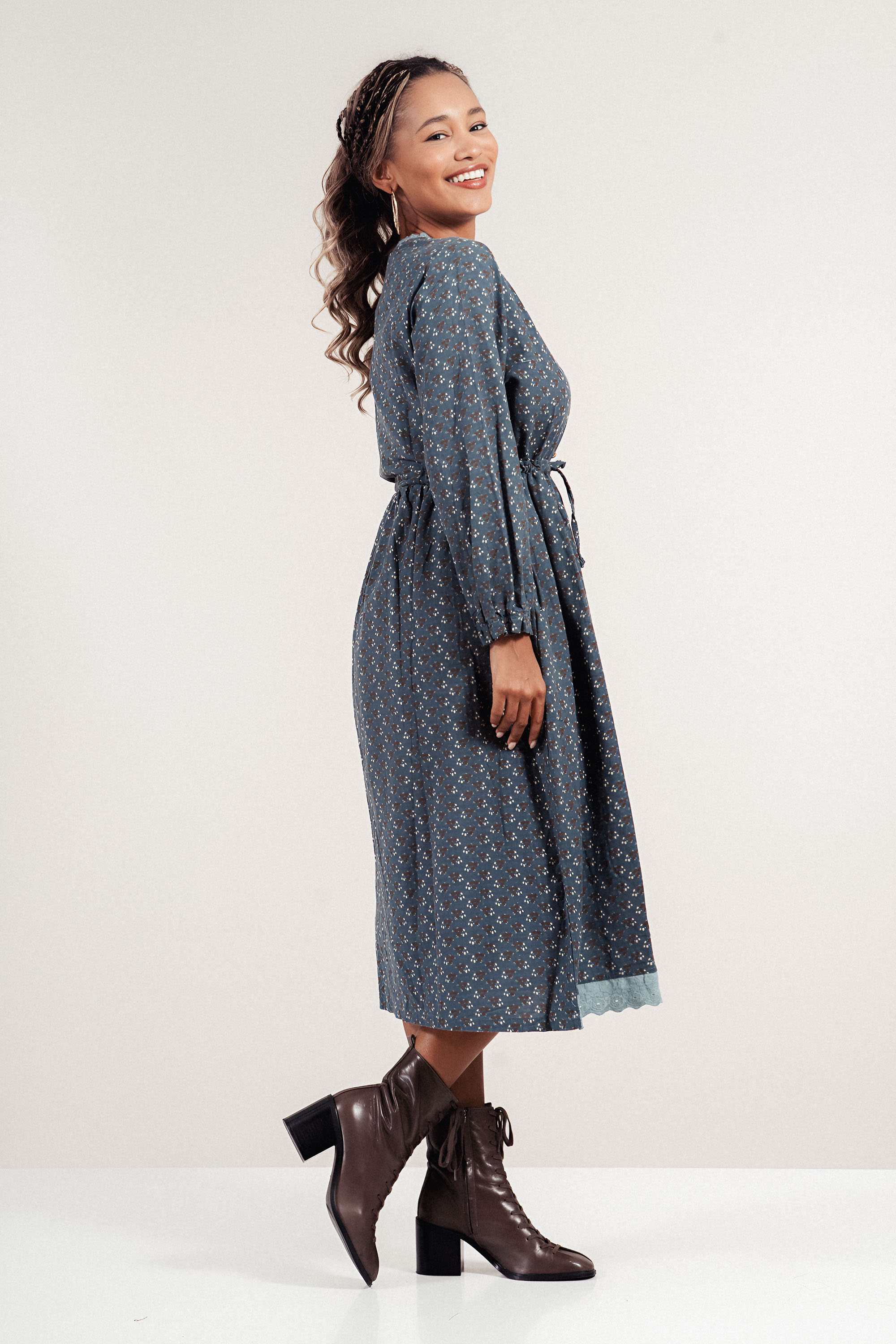 Рокля от памук в цвят петрол с бродирана дантела и ситен флорален принт