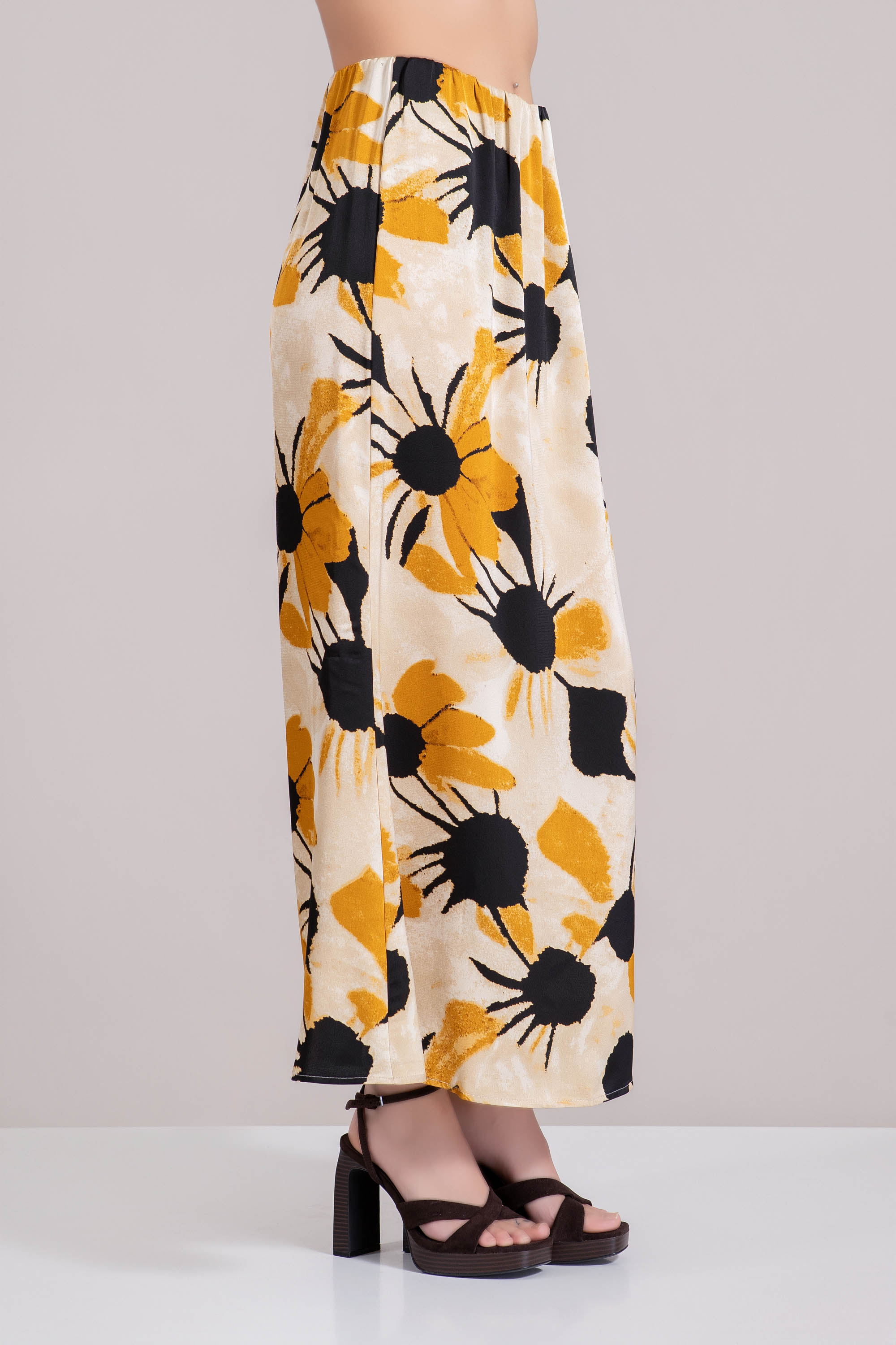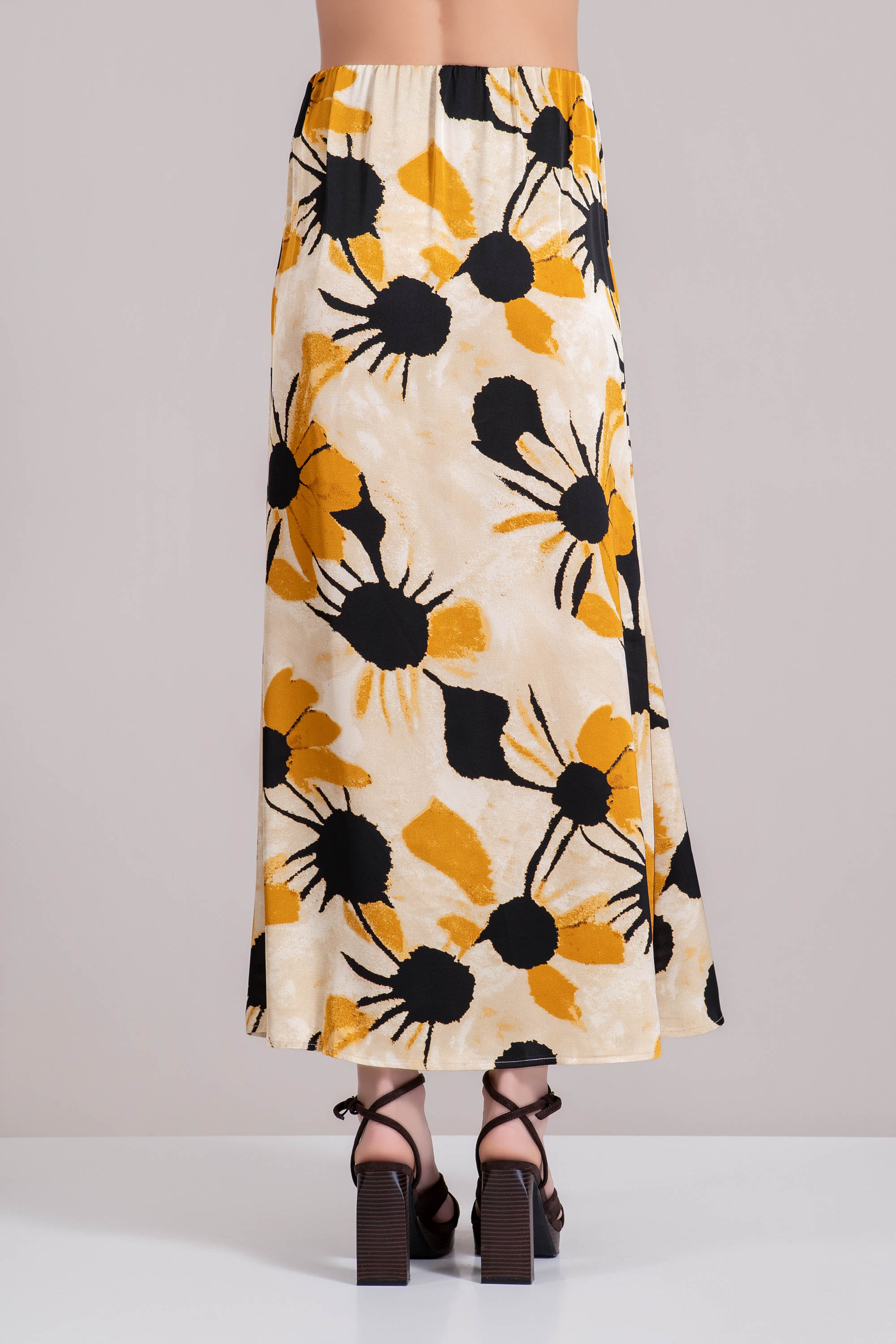 Лека и ефирна пола със средна дължина, изработена от сатенирана материя с деликатен блясък. Яркият флорален мотив в жълто-чено създава стилен контраст със светлия фон. Ластичната талия осигурява отлично прилягане и комфорт при носене. Идеална за съчетание с едноцветни топове и леки блузи.