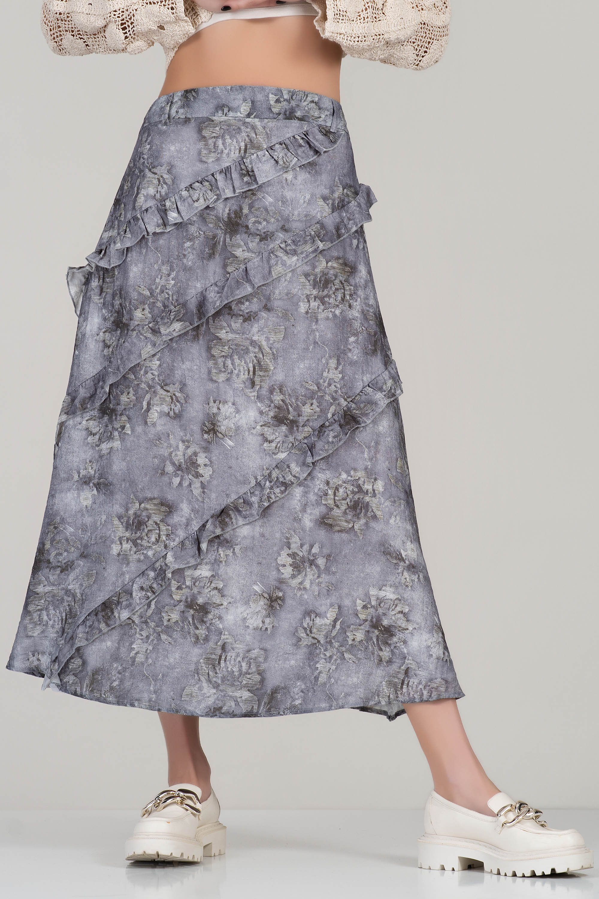 Сива миди пола с флорален принт и ефирни воали