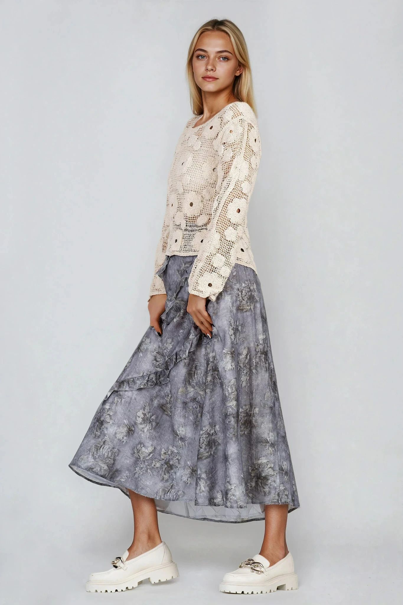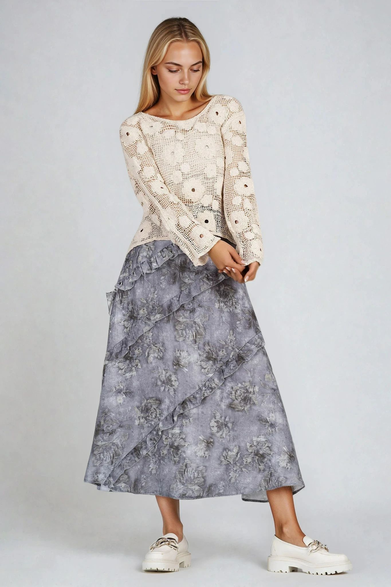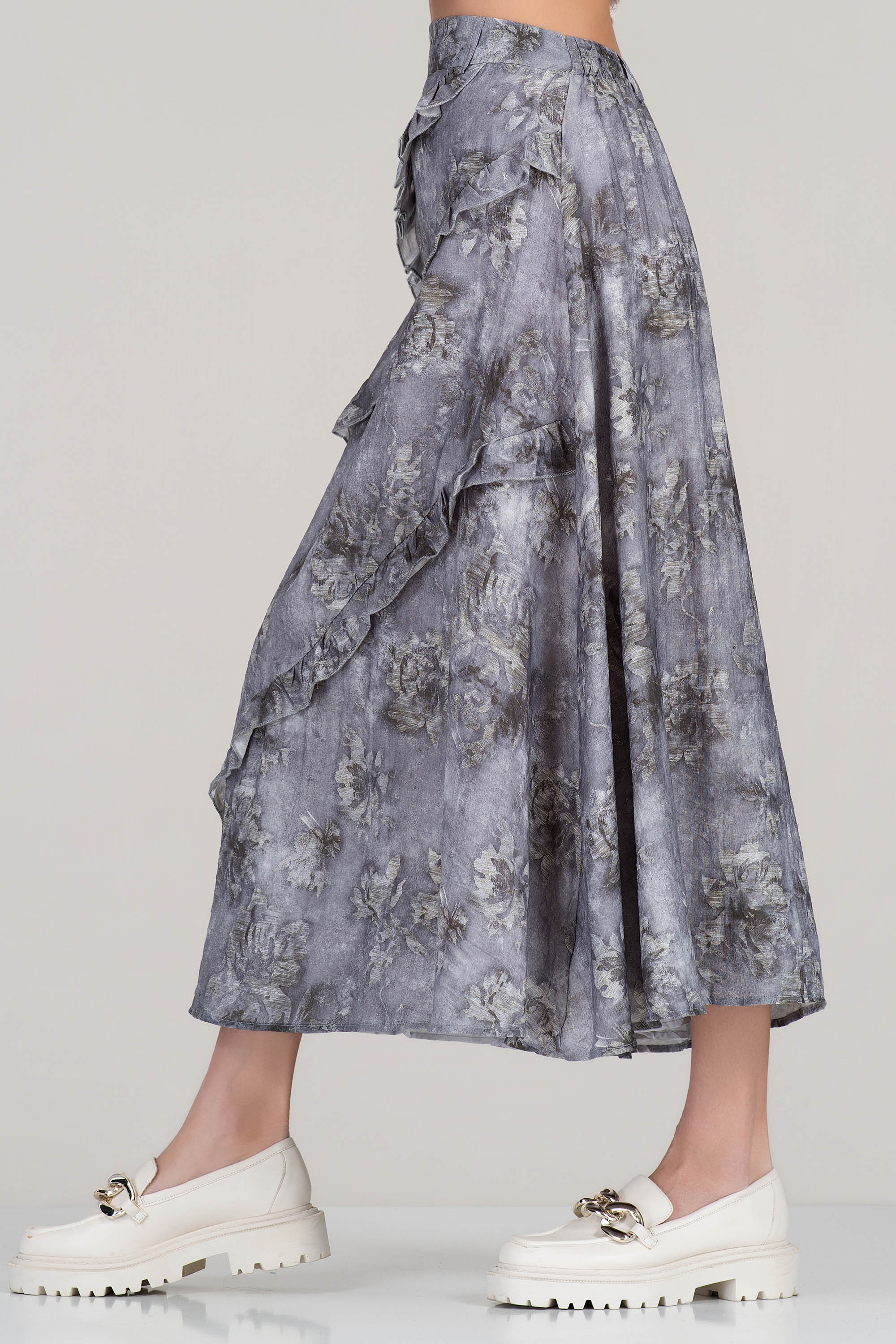 Ефирна пола с дължина под коляното, създадена от дишаща смес от тенсел и лен. Декорирана с фини къдри и деликатен флорален принт в сивата гама, този модел придава романтична нотка към всеки тоалет. Идеална за пролетно-летния сезон с леки блузи или къси жилетки.