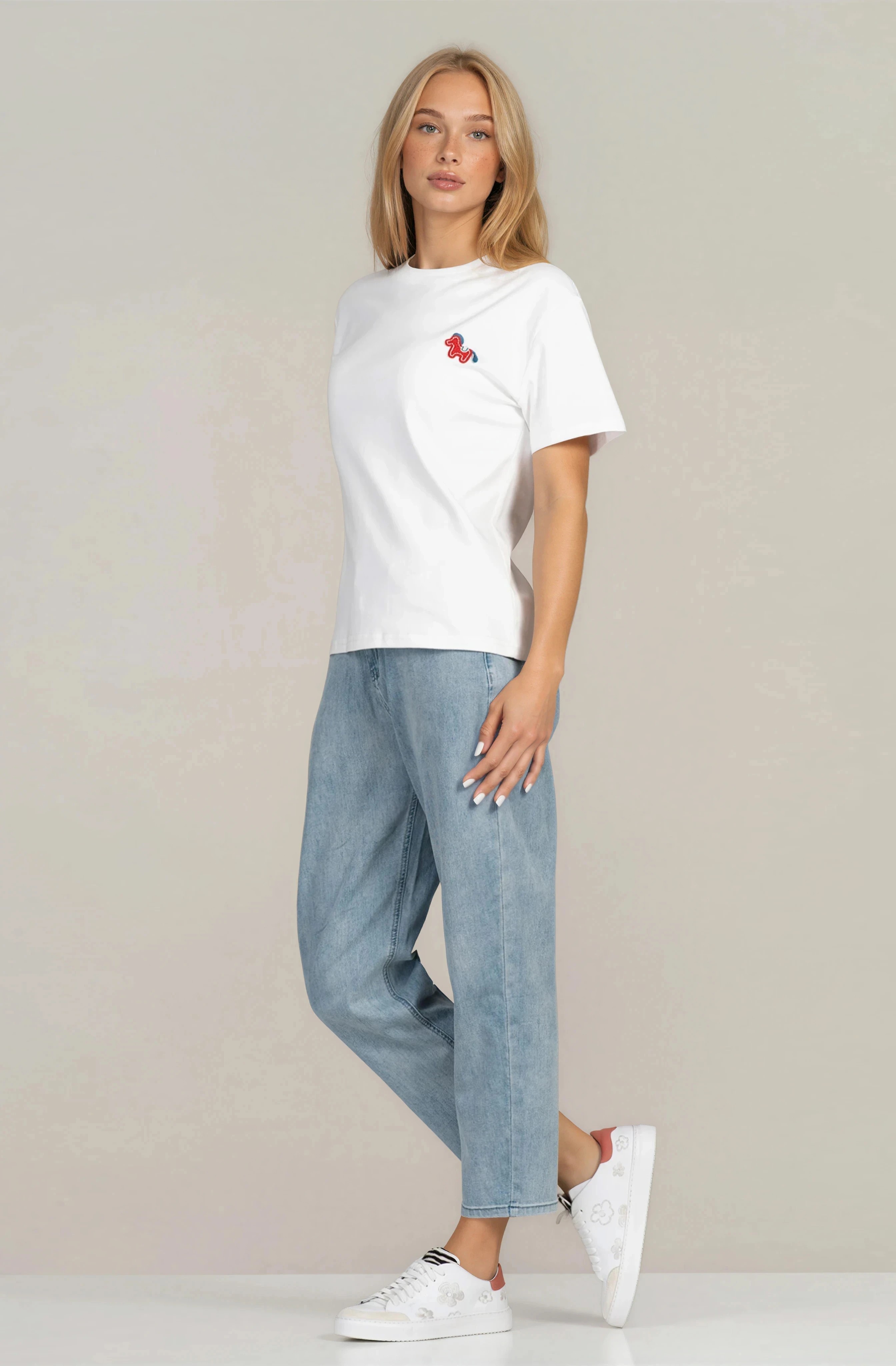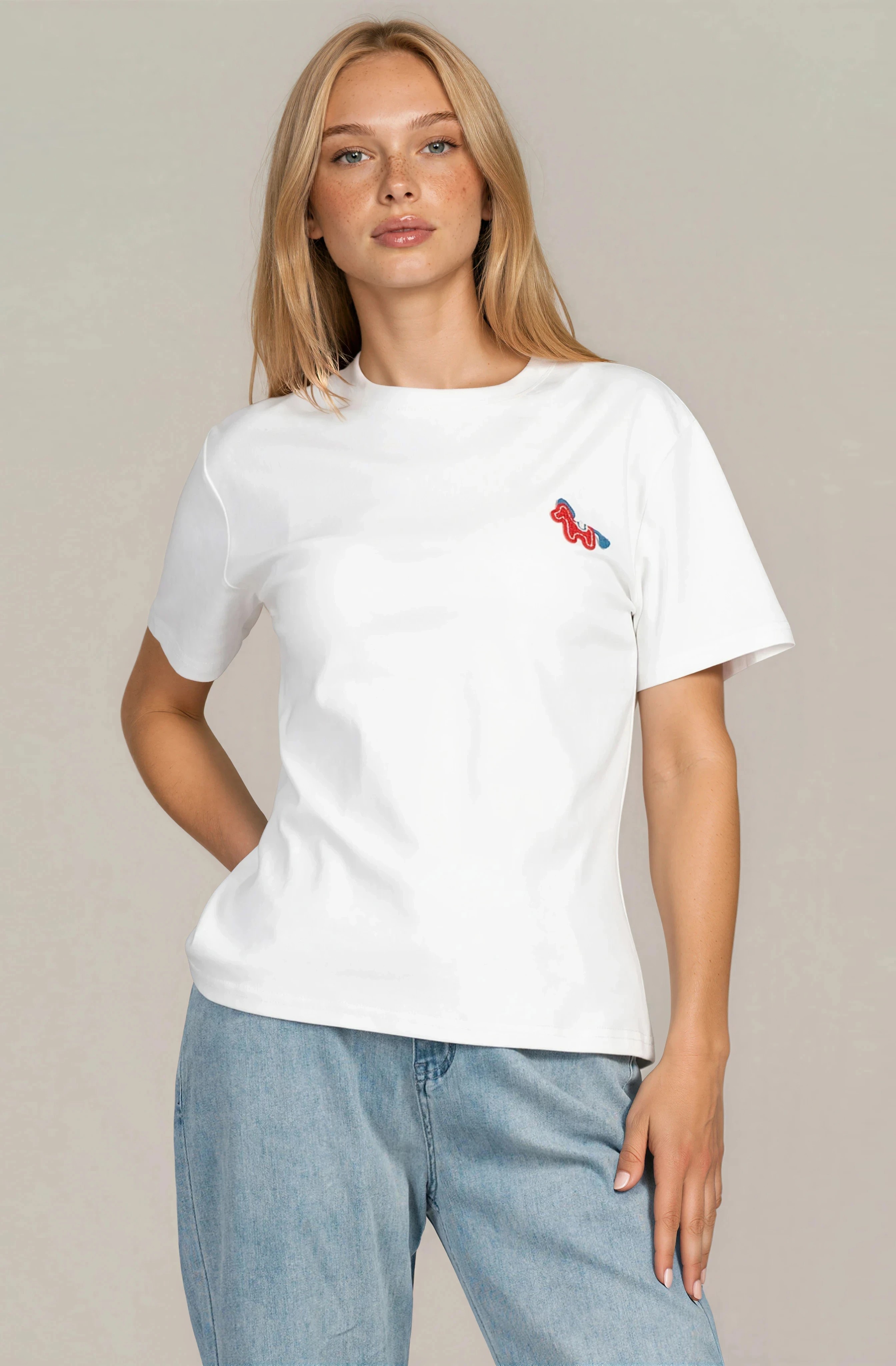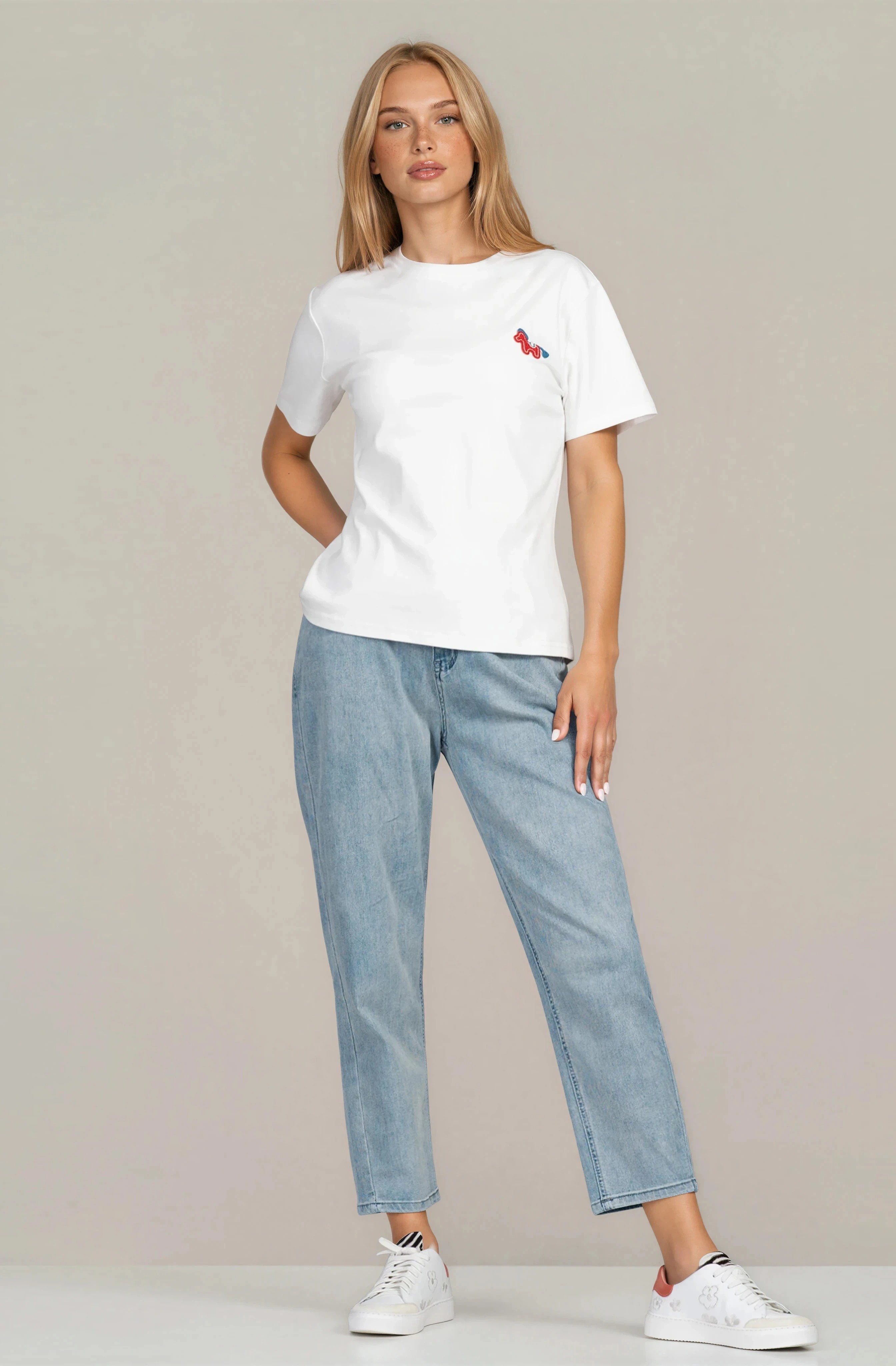 Класическа дамска тениска в бяло с фин акцент – бродерия конче в контрастни цветове. Памучната материя е мека, дишаща и изключително комфортна за ежедневно носене. Изчистената кройка с обло деколте осигурява удобно прилягане и лесно комбиниране с различни визии. Подходящ модел за ежедневие с лек стилен акцент.